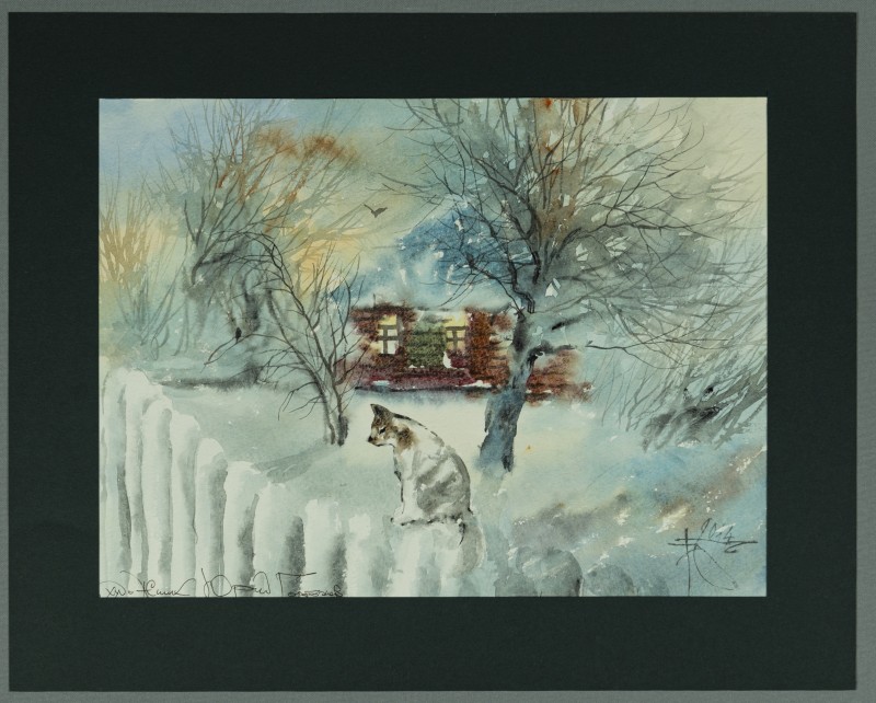 На передньому плані видніється засніжена лісова галявина, у центрі якої озеро, біля озера стоїть пара оленів. Дерева голі без листя, по центру засніжена ялинка. Небо зображене у пурпурних, блакитних і жовтих кольорах, що відбивається у озерній гладі.