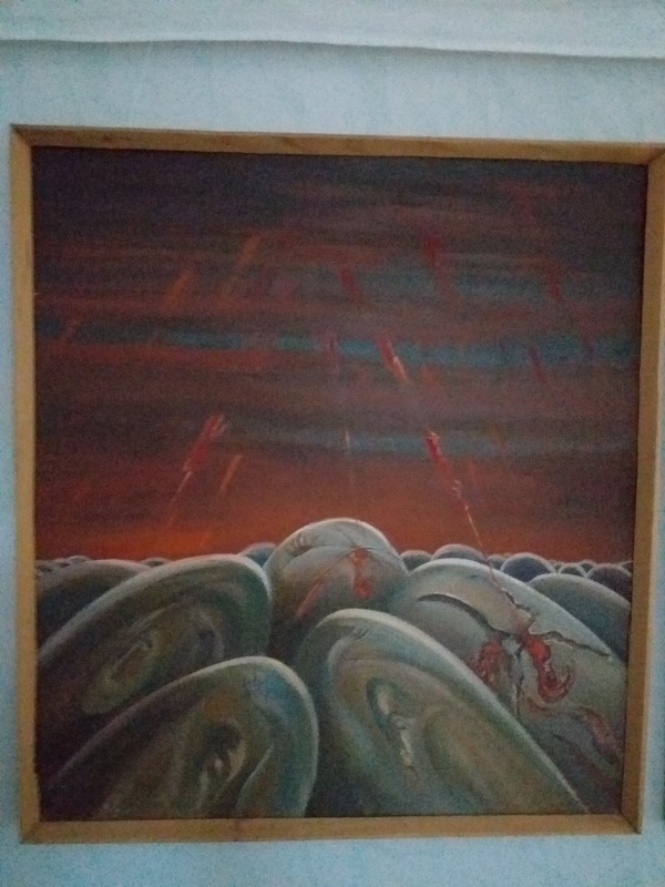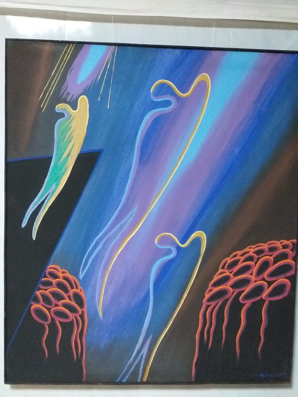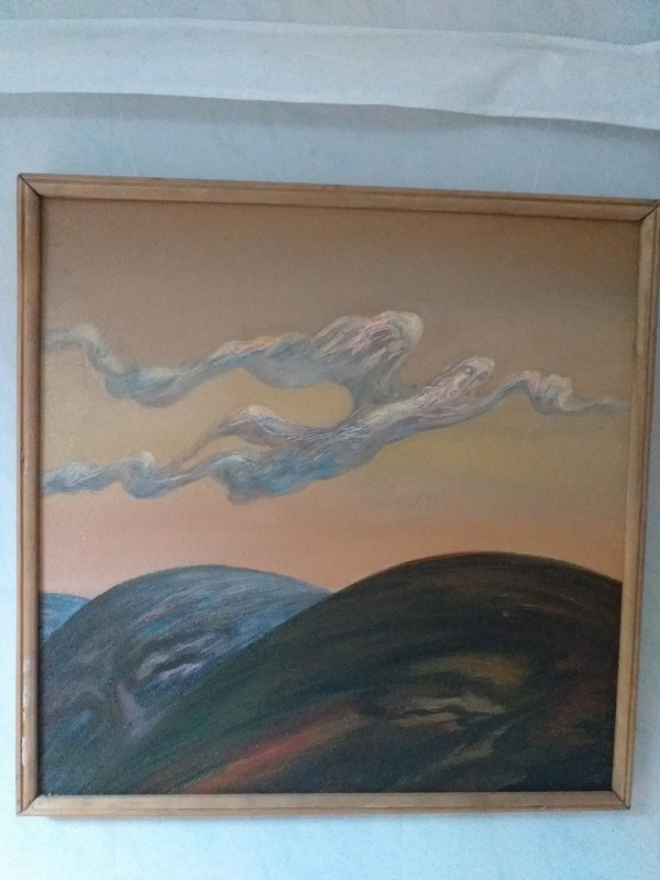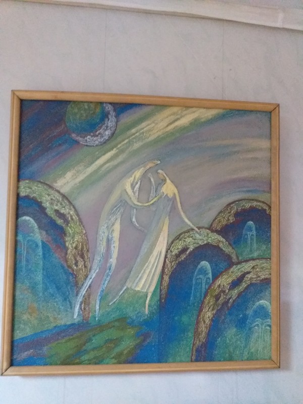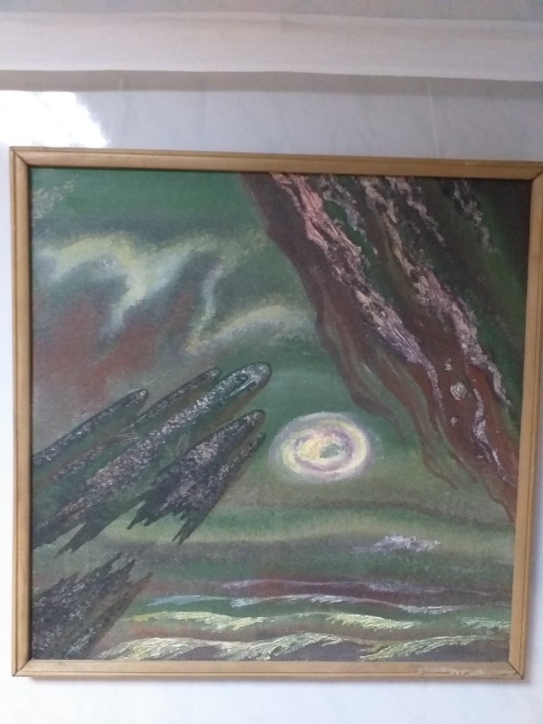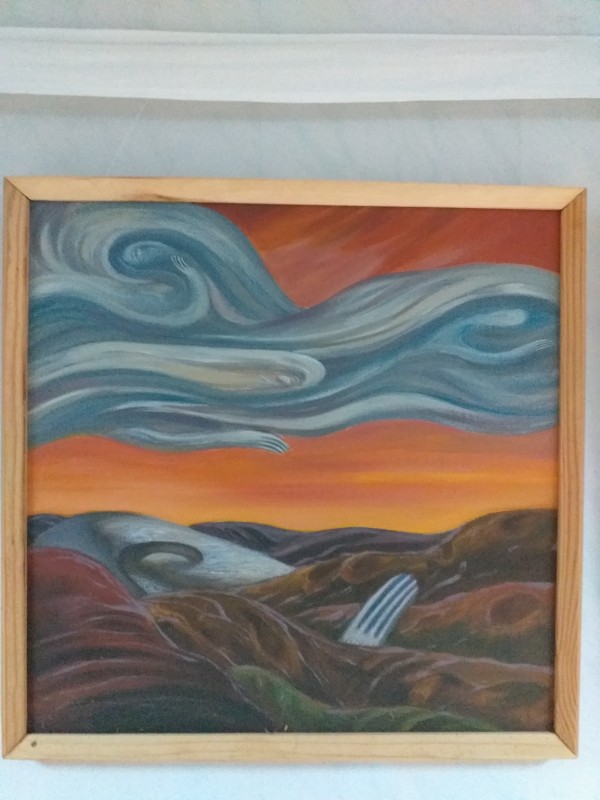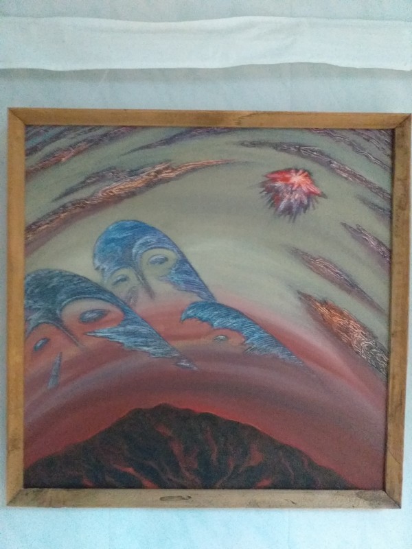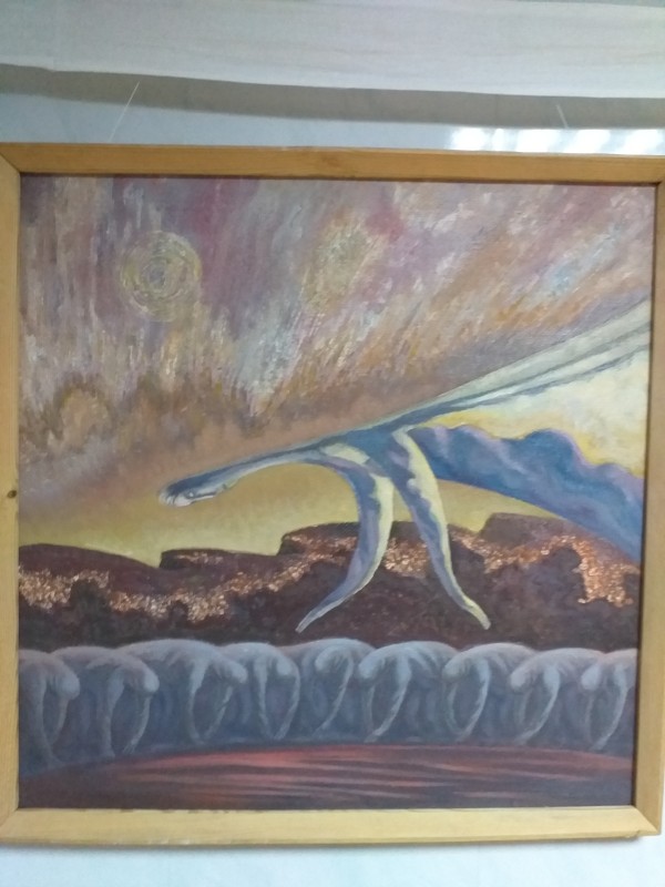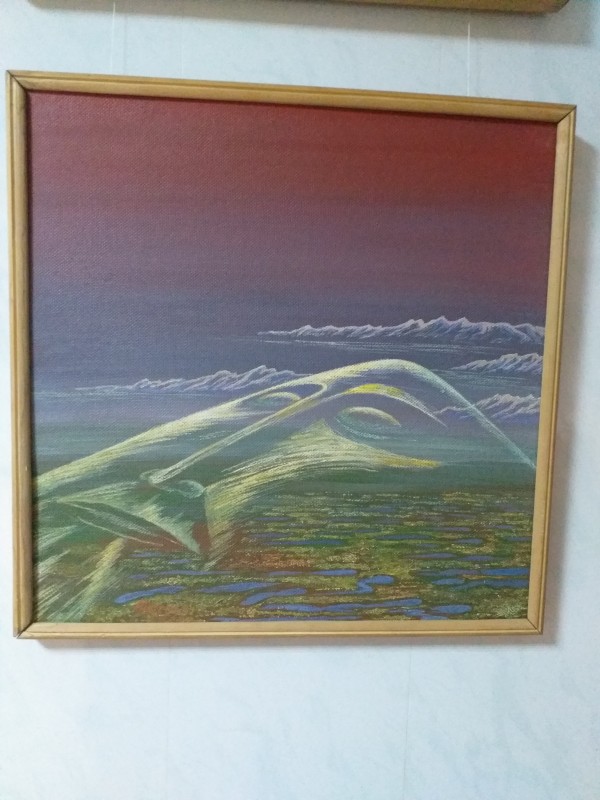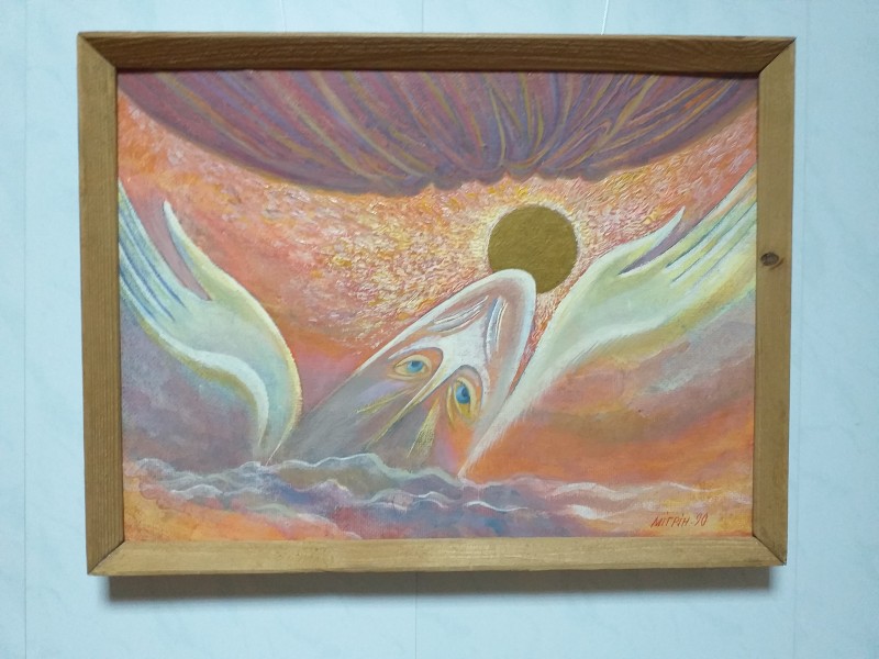 Картина "Над". Художник Михайло Мігрін. Картина прямокутної форми. На картині зображено лінію горизонту, внизу земне поле над яким червоний сонячний диск та заграва. У верхній частині блакитне небо з хмариною, шо наче обіймає земний простір уявними крильми. Корольова гама - білий, жовтий, червоний, зелений.