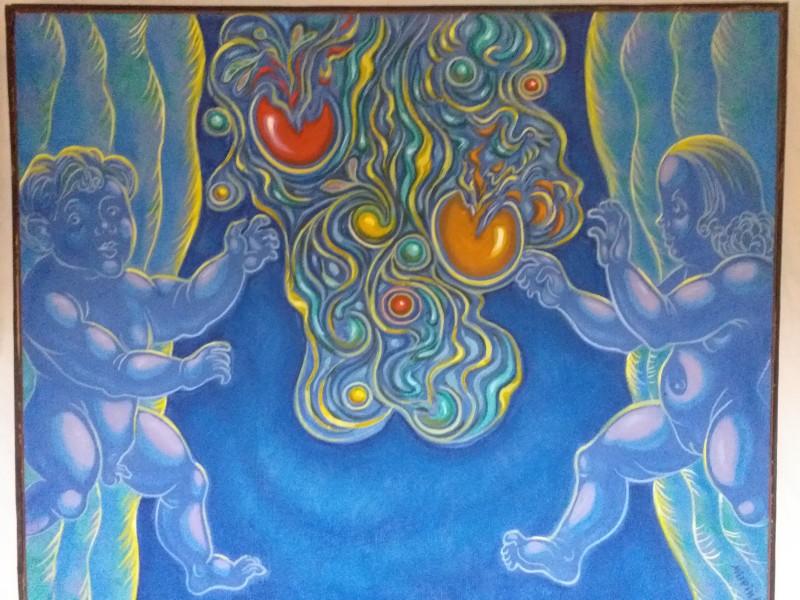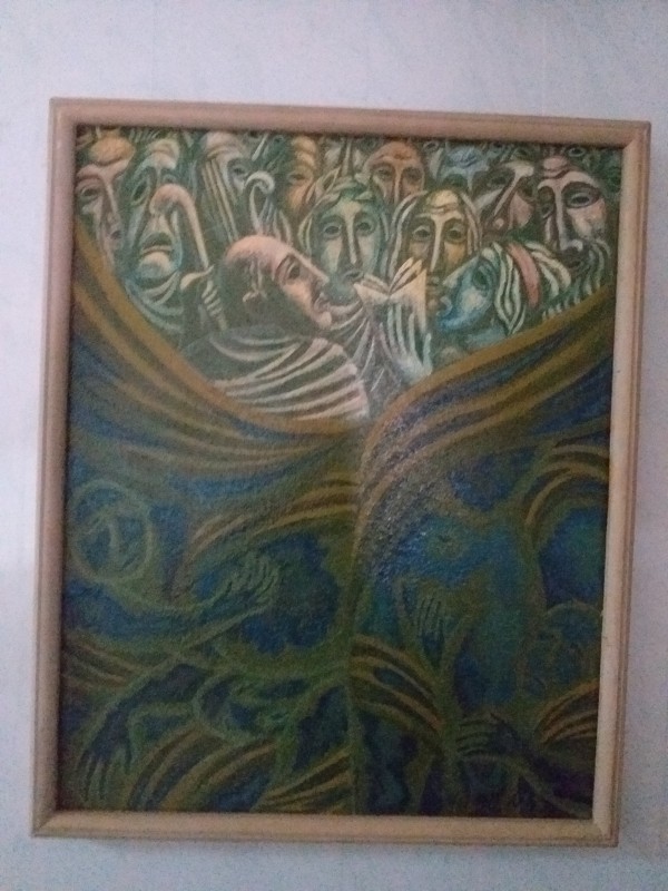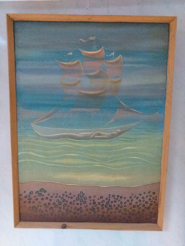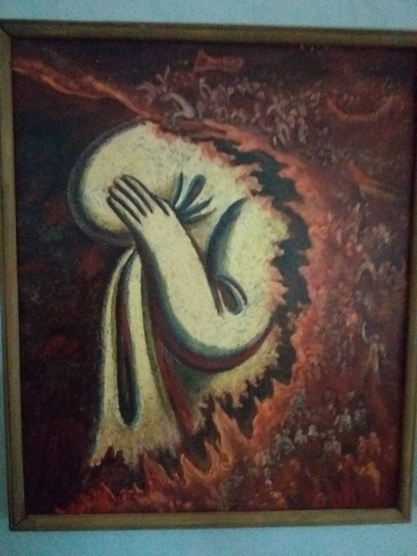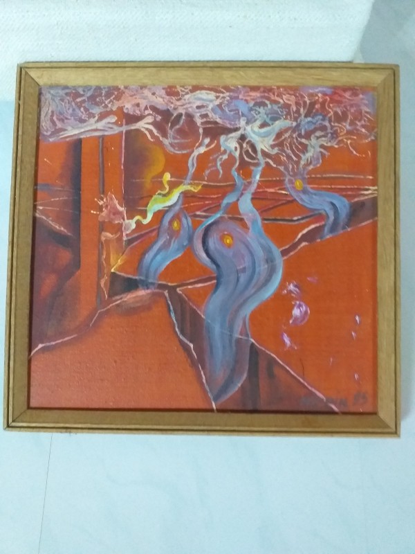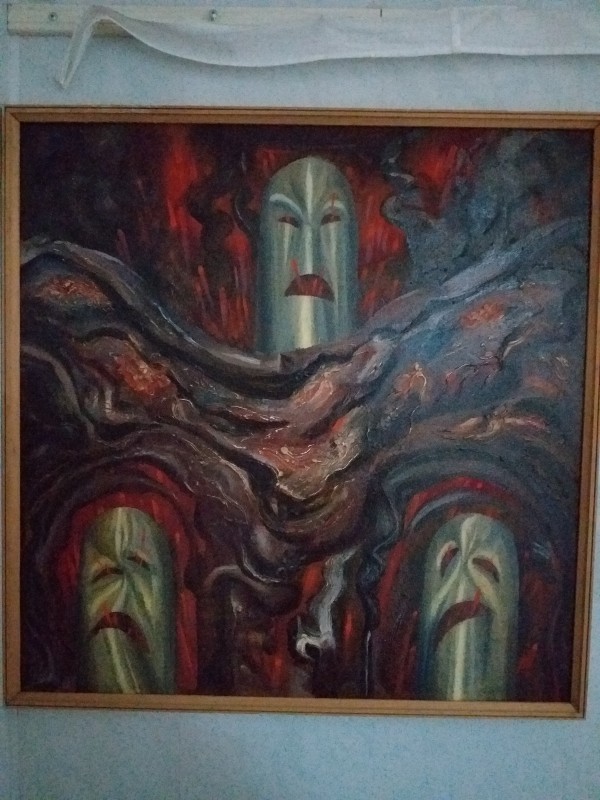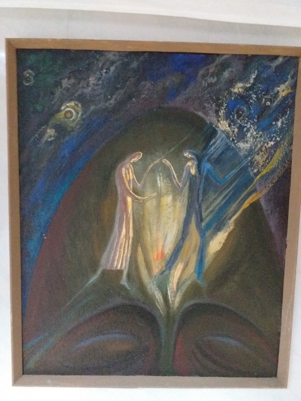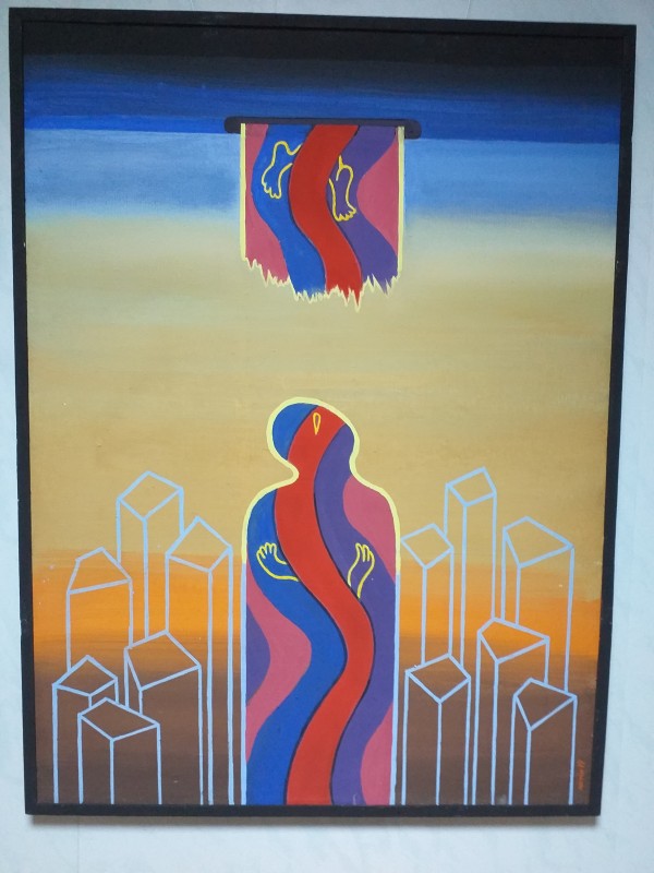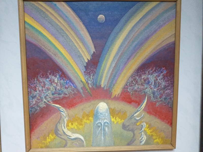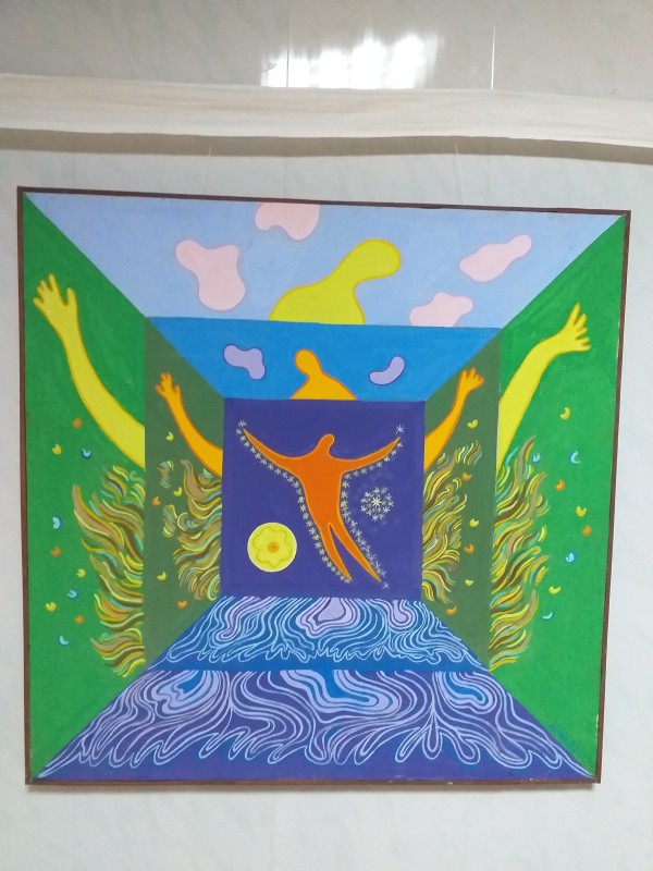 Картина "Над". Художник Михайло Мігрін. Картина прямокутної форми. На картині зображено лінію горизонту, внизу земне поле над яким червоний сонячний диск та заграва. У верхній частині блакитне небо з хмариною, шо наче обіймає земний простір уявними крильми. Корольова гама - білий, жовтий, червоний, зелений.
