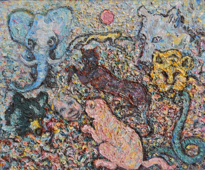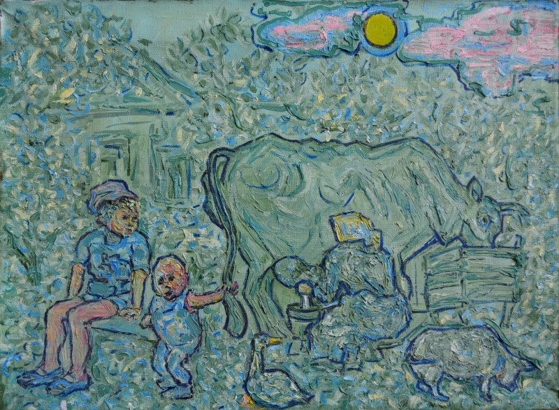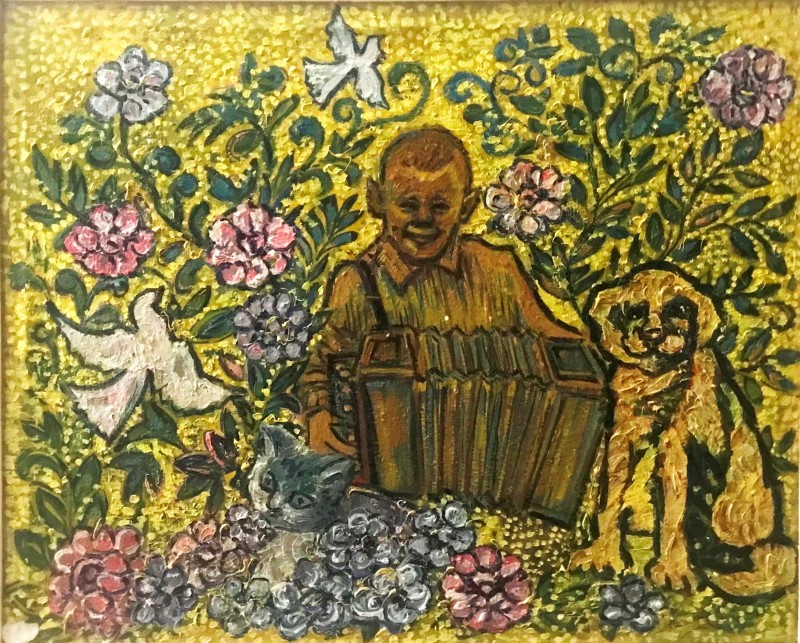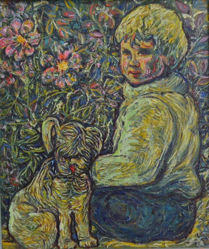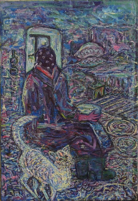 Картина. Надія Падурська "Скорбота". На фоні зелених, синіх, червоних і жовтих мазків пензля зображено покійну жінку, кругом неї запалені свічки, з одного боку від покійної - голова в профіль з відкритим ротом і закритим оком, з іншого - стоїть дитина, одягнута тільки в сорочку і плаче, прикриваючи обличчя руками. Полотно на дерев'яному підрамнику, олія, 54 см х 39 см.