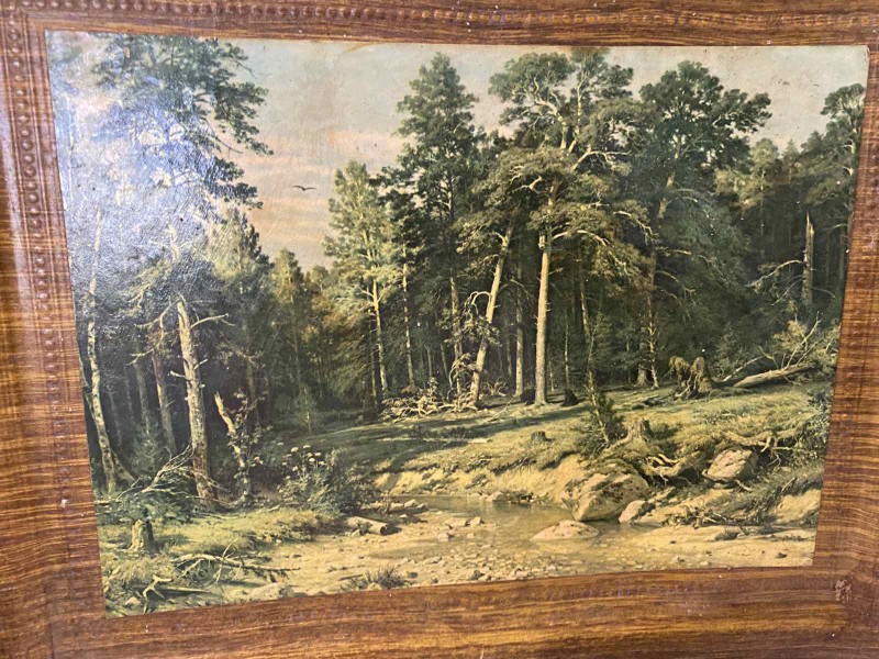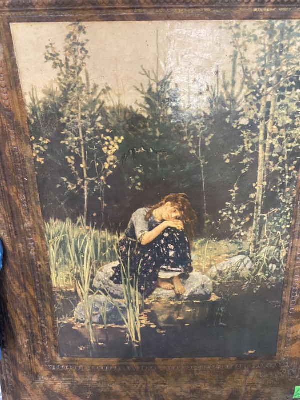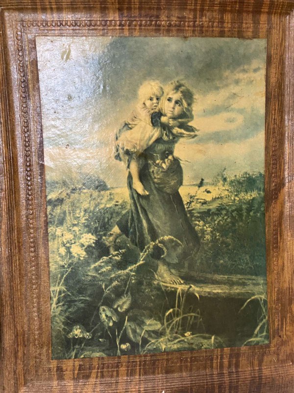 Картина-вишивка в рамці "Ангели". Вишиті лва Ангели біля річки між горами.
