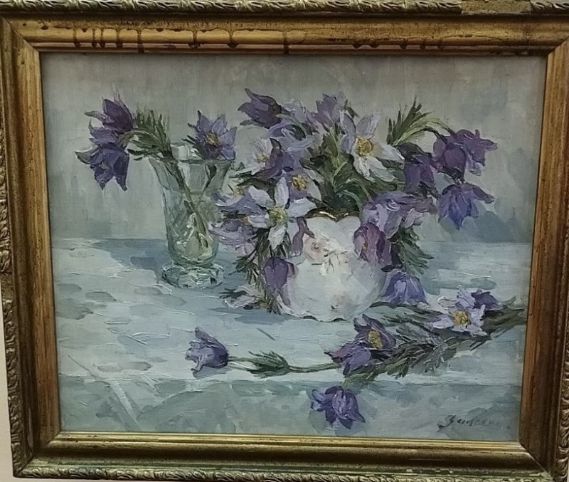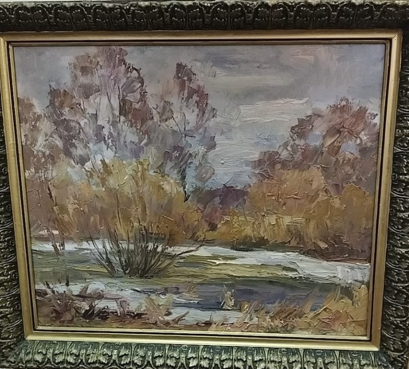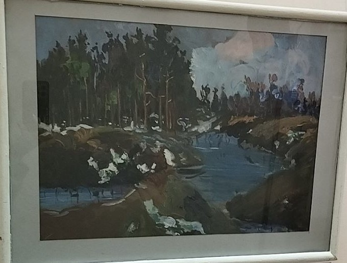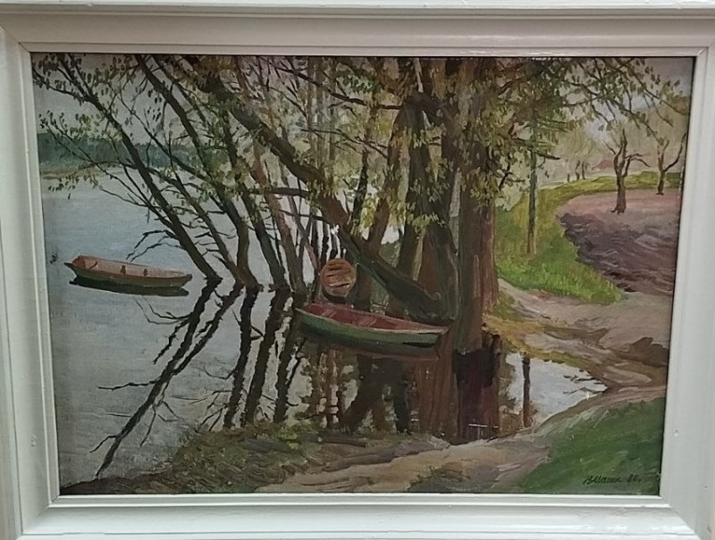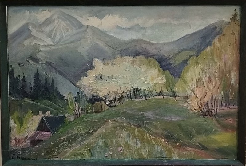 На картині зображено сільський пейзаж із архітектурним акцентом - дзвіницею, розташованою в центрі композиції. Споруда має світлий фасад із невеликими віконними віконними прорізами та завершена куполом. Дзвіниця оточена густою зеленню дерев, що формують тло і частково закривають небо. Картина насичена, із переважанням зелених, сіро-блакитних та білих тонів, використано контраст теплих і холодних відтінків.