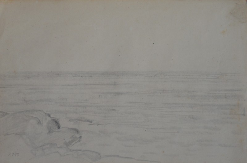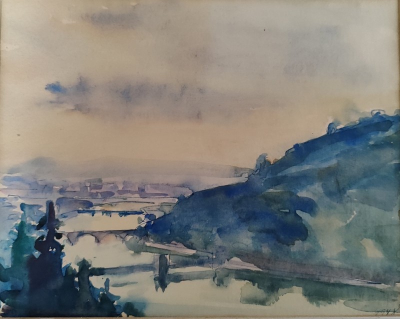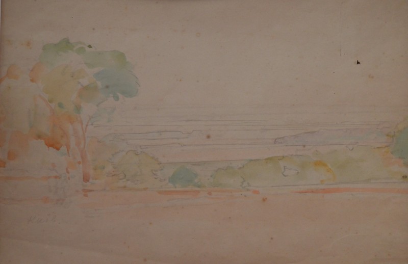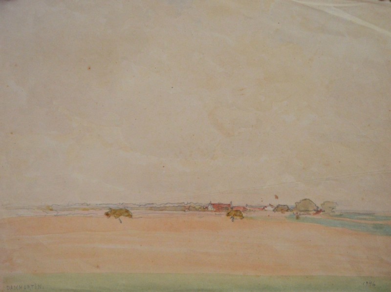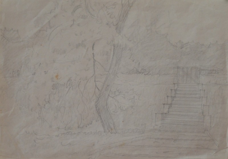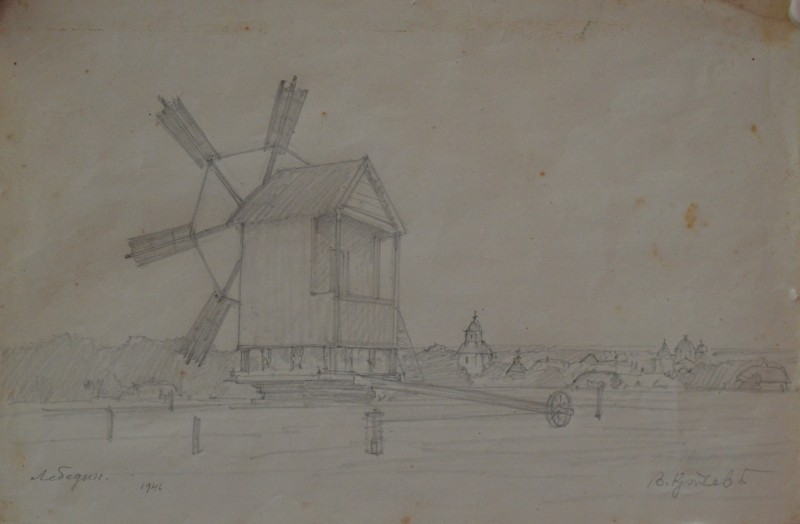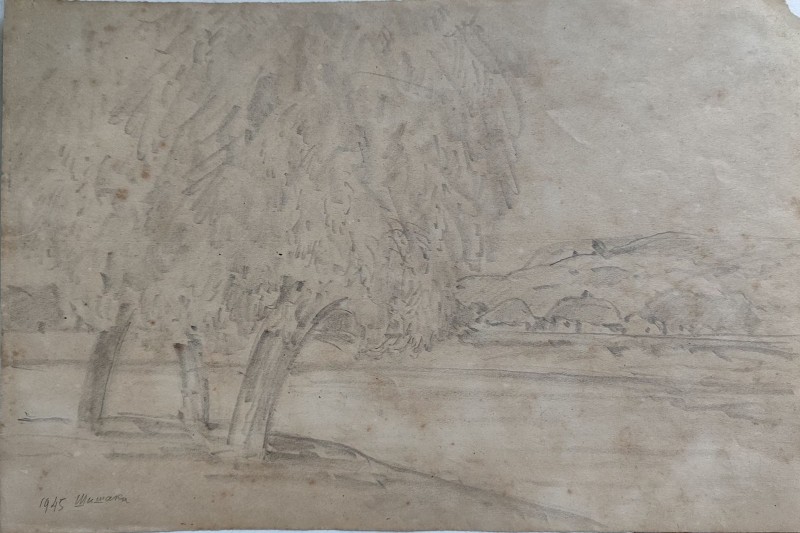 На передньому плані справа за огорожею селянська хата під стріхою. Ганок прикрашений різьбленним візерунком. Зліва за тином велике дерево. Далі за пагорбом дві хати.