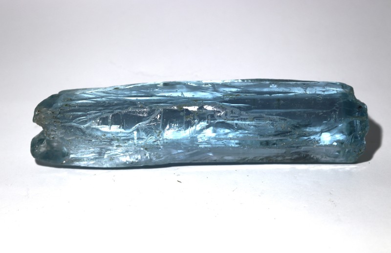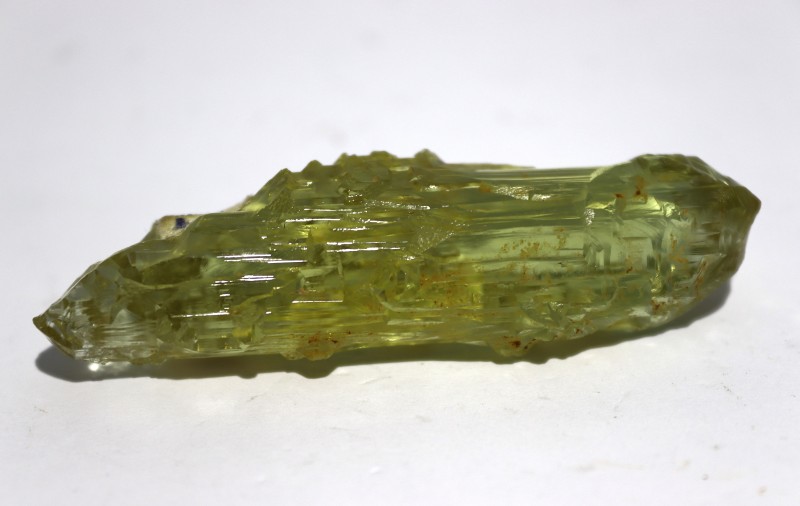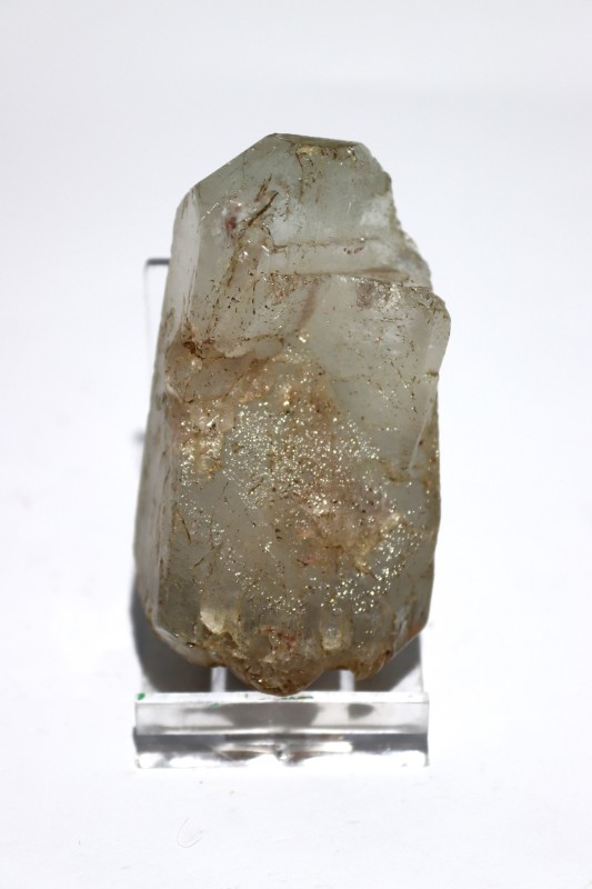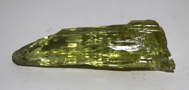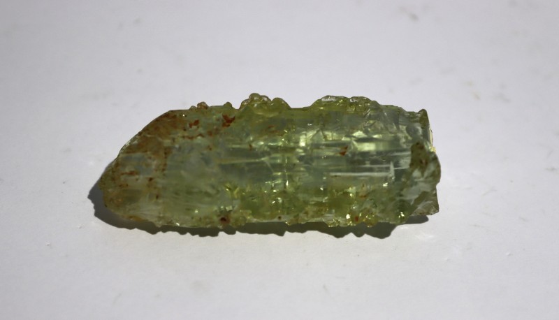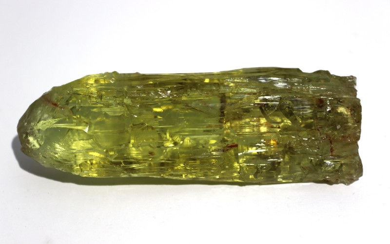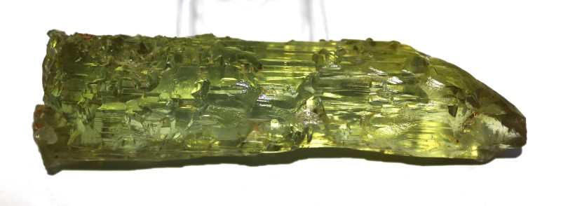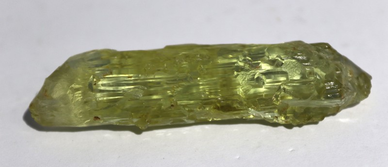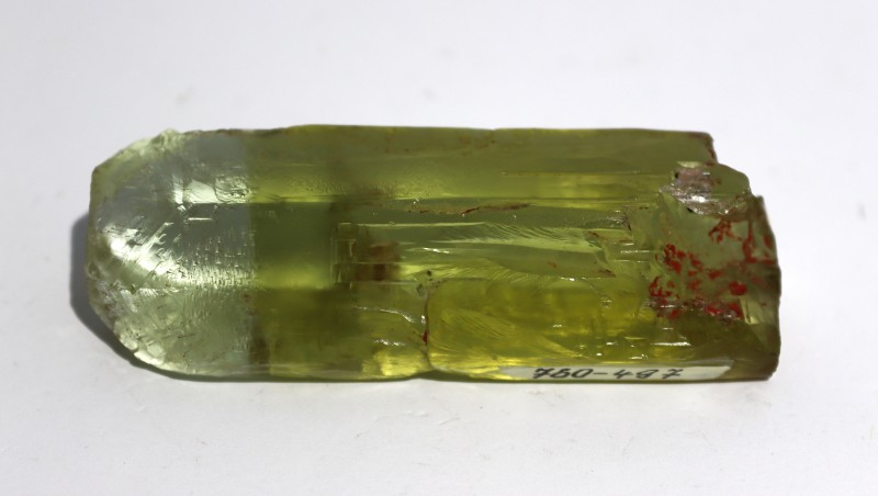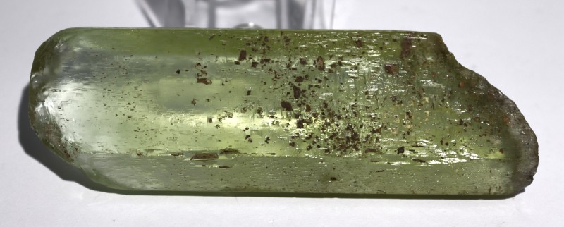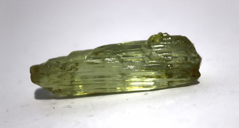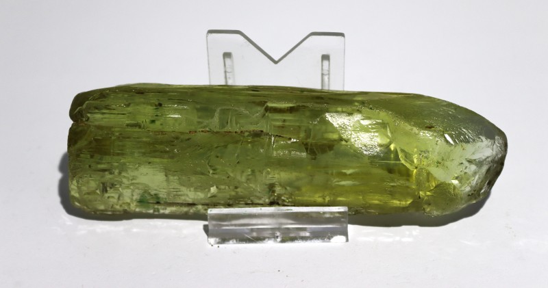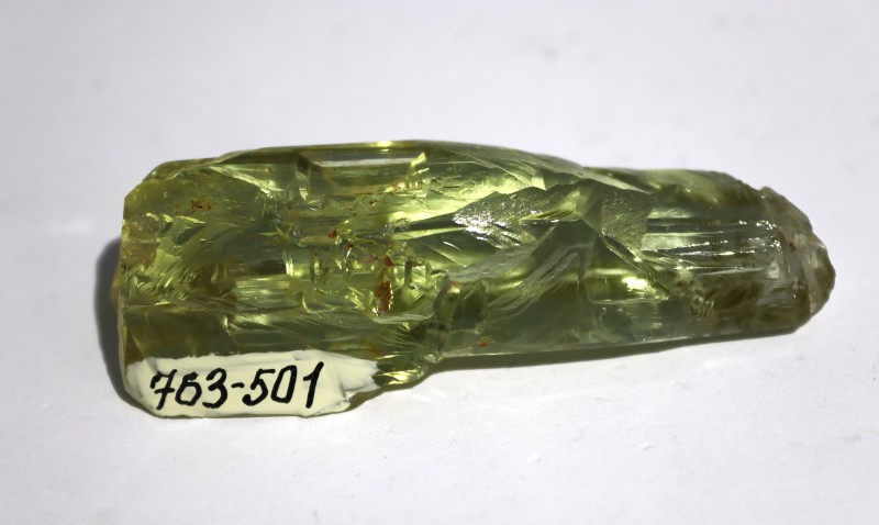 Берил. Кристал берилу триголового вигляду, короткостовпчастого габітусу, середньопризматичний, жовтувато-зеленого кольору, прозорий, обламаний у прикореневій частині. Поверхня сколу нерівна, із численними лійкоподібними заглибинами. У будові кристала беруть участь грані призми, поверхня яких вкрита численними фігурами травлення у вигляді тригранних горбків та прямокутних заглибин. Також спостерігаються підвищення та заглибини, що поступово переходять одне в одне, пом’якшуючи або нівелюючи скульптурні виступи й заглибини. Кристал має оплавлений вигляд (схожий на «обсмоктаний льодяник»). Внутрішня частина кристала пронизана дрібними каналами з газово-рідинними включеннями. Голівка завершується чотирма площинами під кутом приблизно 30°. Голівка розділена на три вершини (площини) з фігурами росту та травлення.