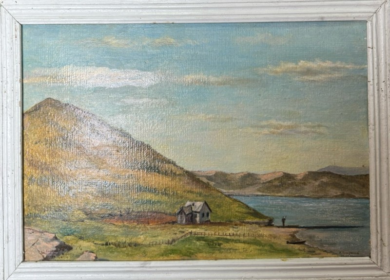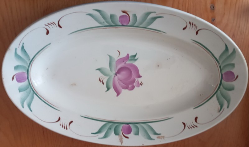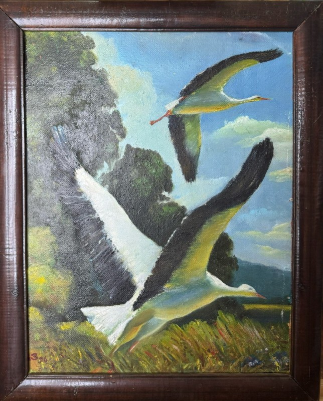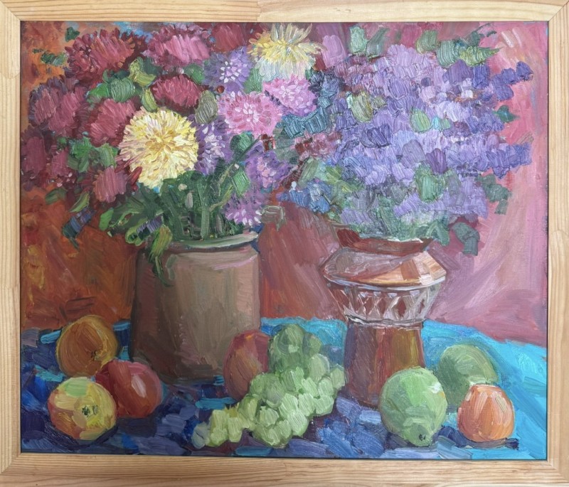 Килим-синя байка, на звороті сукно. Часткова вишивка болгарський хрест. Троянди в кошику, по центру виноград, два голуби, квіти, по периметру орнамент.