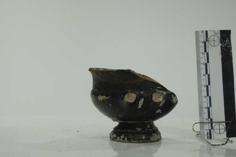 Миска на кільцевому піддоні, вінчик звужений до краю, дещо загнутий всередину. Піддон слабко профільований, його стінки слабко розширені до основи. На внутрішній стороні піддона - слабко виражений конусоподібний виступ. По підошві нанесений круговий жолобок. 325-300 рр. до н.е.