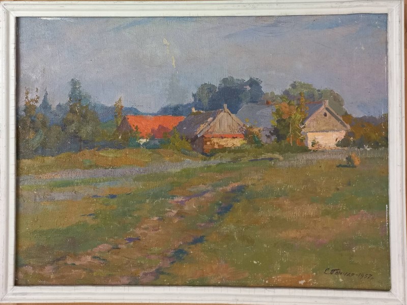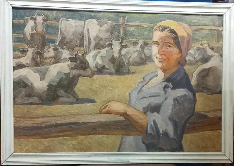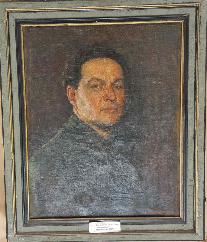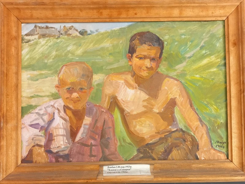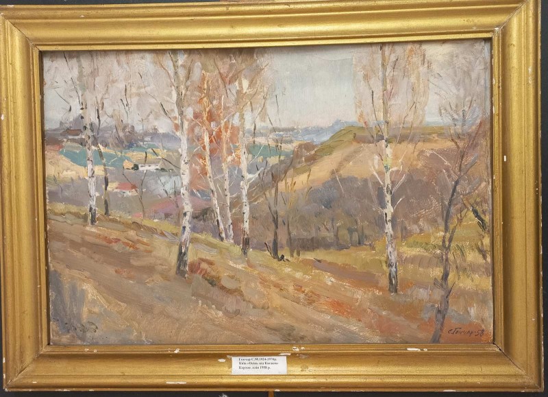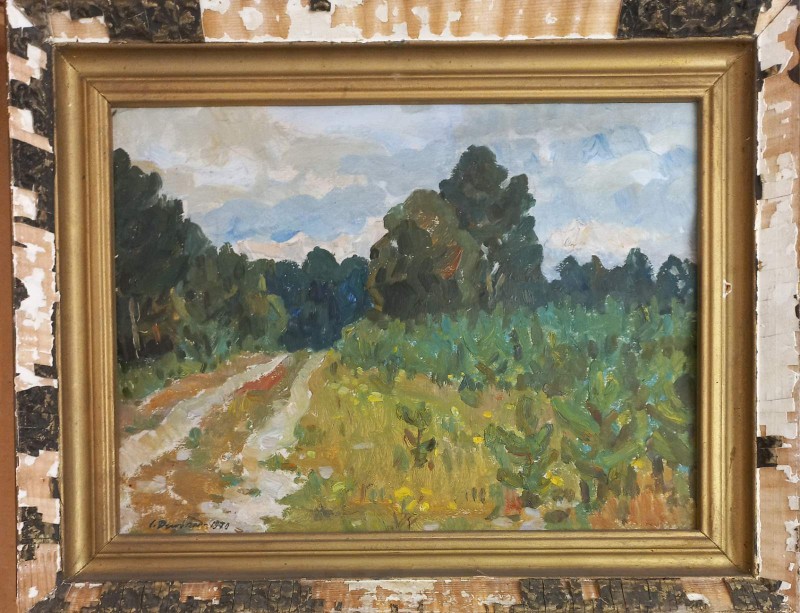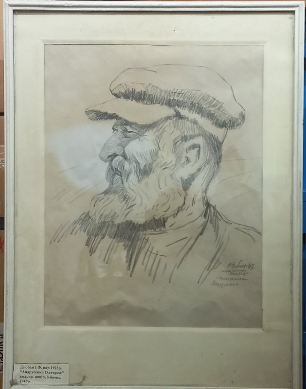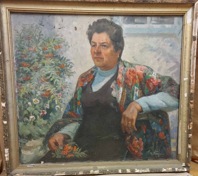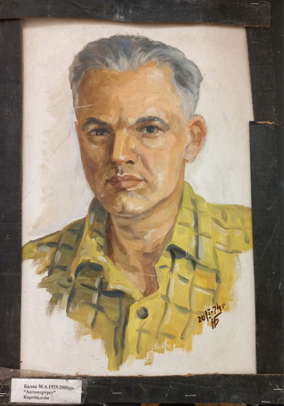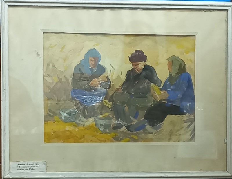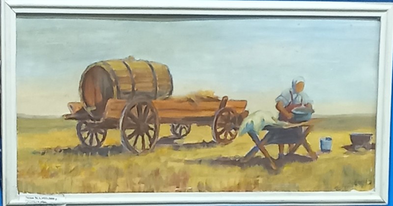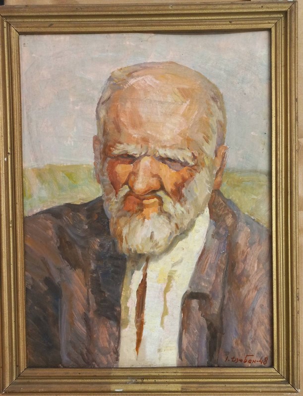 На полотні олією зображений літній чоловік на полі, який сидить біля снопу, 1923-2009р., 1961 рік