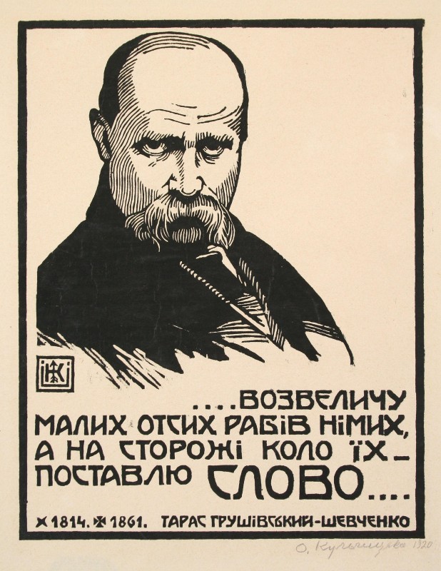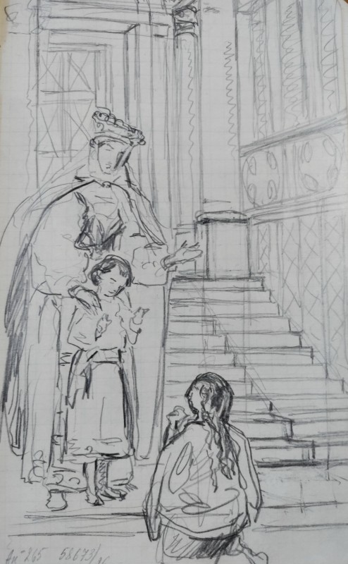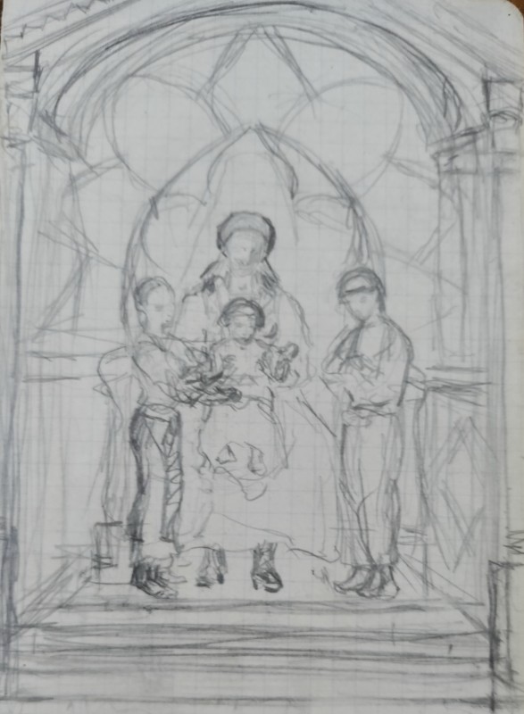Графічний начерк. Вертикальна композиція «Мадонна на троні». У центрі композиції – Богородиця в українському народному вбранні сидить на престолі із Дитиною Ісусом на колінах. Обоє зображені фронтально. Ісус одягнений в довгу сорочку. Руки підняті догори у благословляючому жесті. Обабіч стоять дівчина (ліворуч) і хлопець (праворуч) у селянському вбранні. Над престолом – велике вікно з вітражем. Сцена закомпонована поміж колонадами із аркоподібним завершенням.
