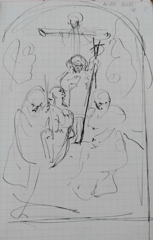 Графічний начерк. Вертикальна багатофігурна композиція на релігійну тематику. У верхній частині композиції – дитя Ісус стоїть на тлі хреста. У лівій руці Він тримає знаряддя тортур. Правиця – прикладена до грудей. Нижче, біля його ніг – три постаті у молитовних позах. Схематично рисована ікона обрамлена прямокутником з овальним завершенням.