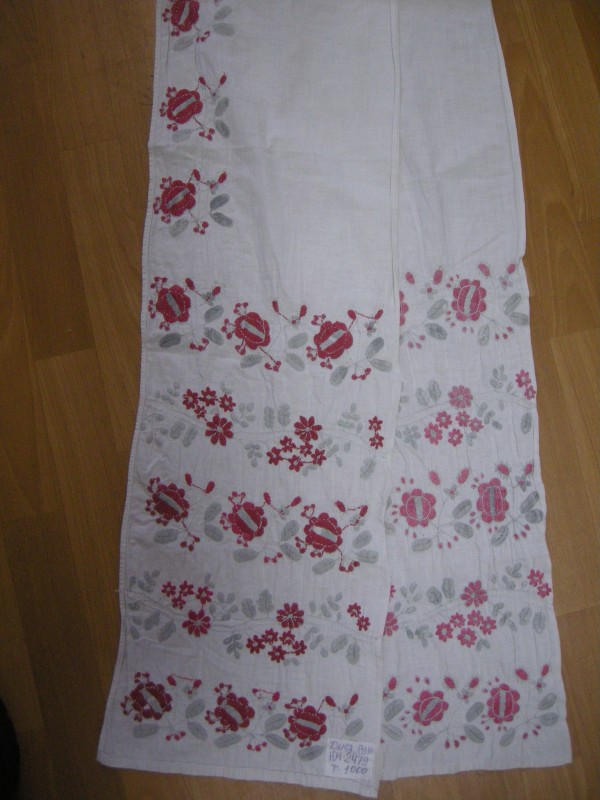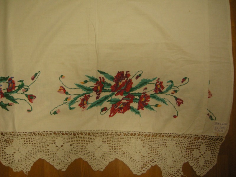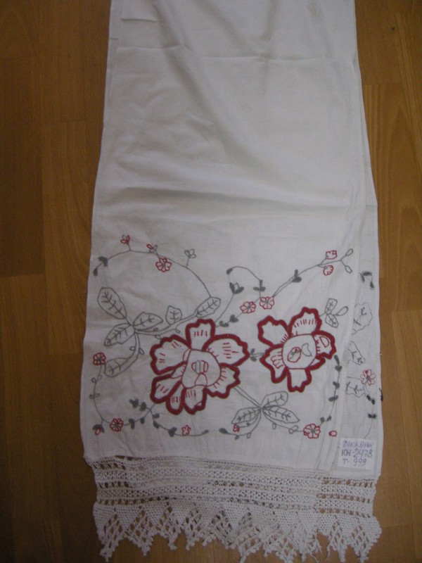 Наволочка виготовлена з білого фабричного полотна. Орнамент знаходиться у верхній частині виробу, який складається з трьох квіткових композицій. У вишивці використані нитки червоного, синього, фіолетового та рожевого кольорів. Виріб має складки біля оздобленого краю. Автор невизначений. ХХ століття.