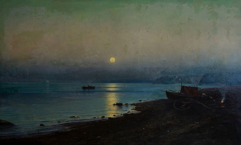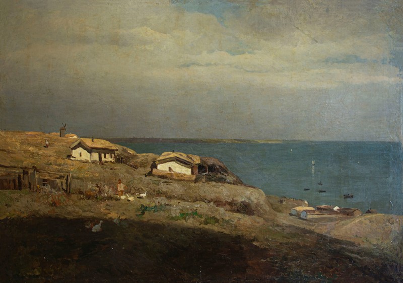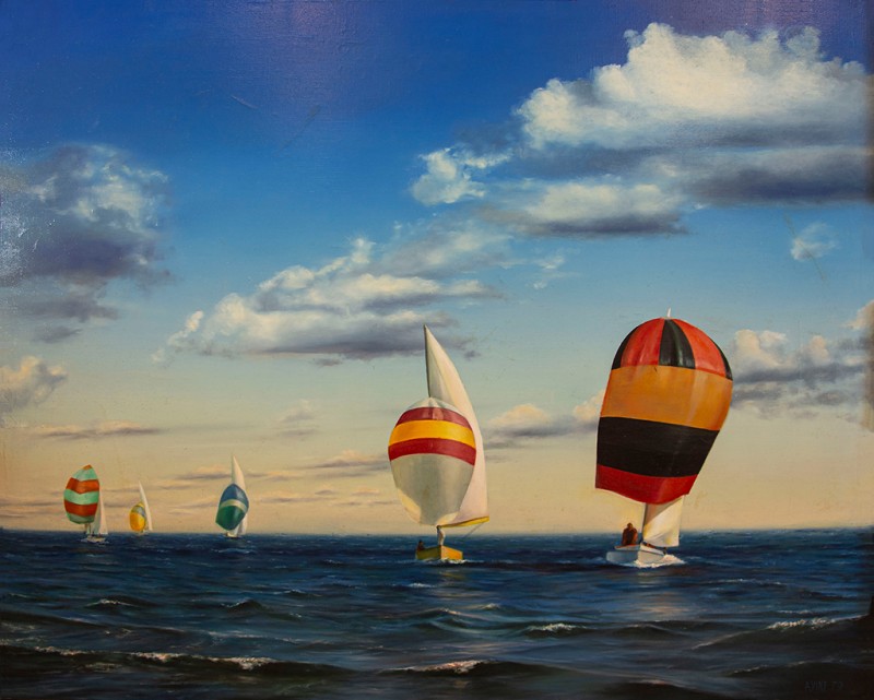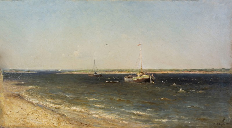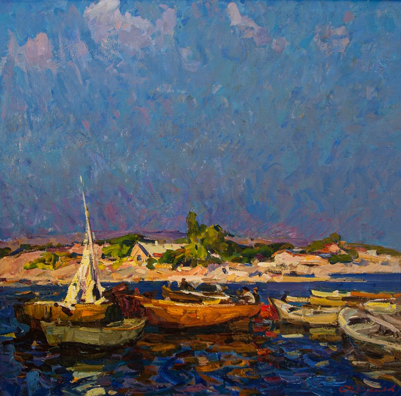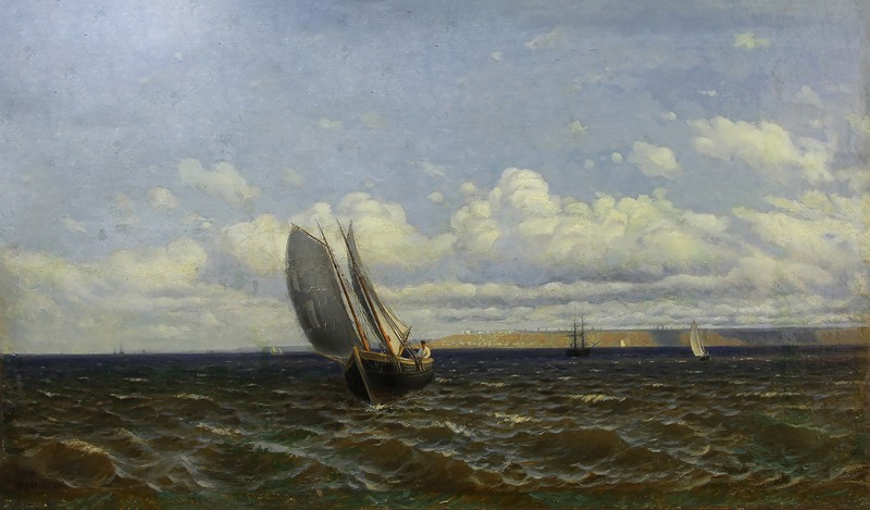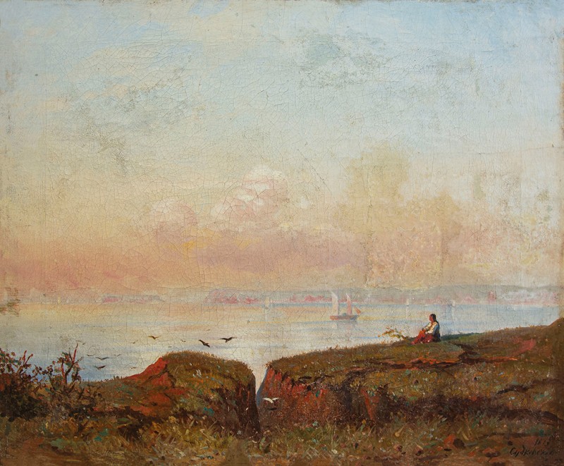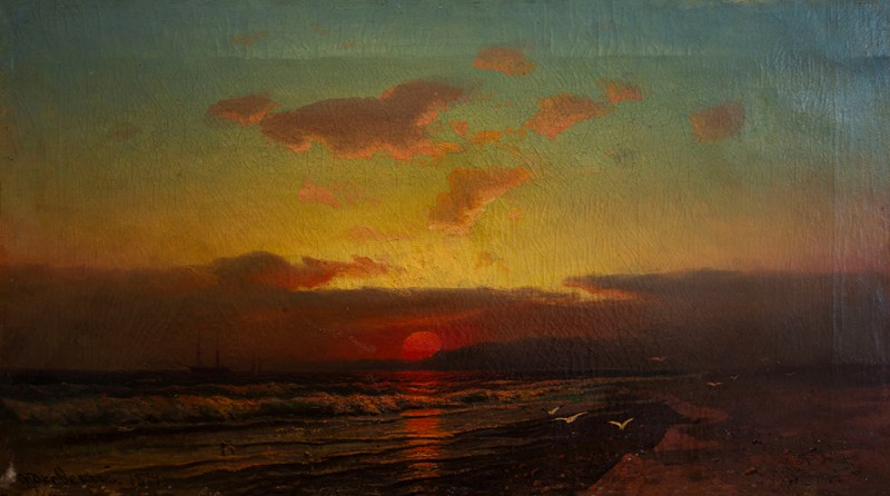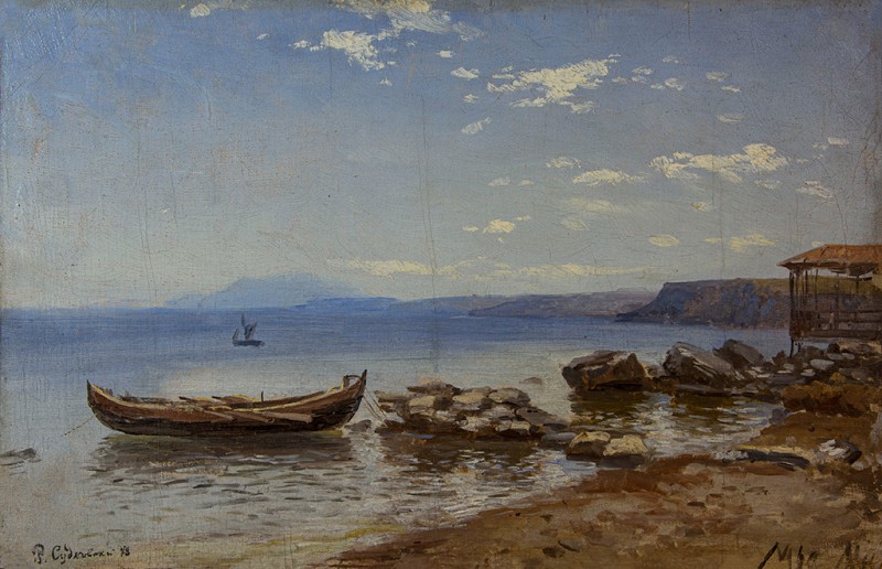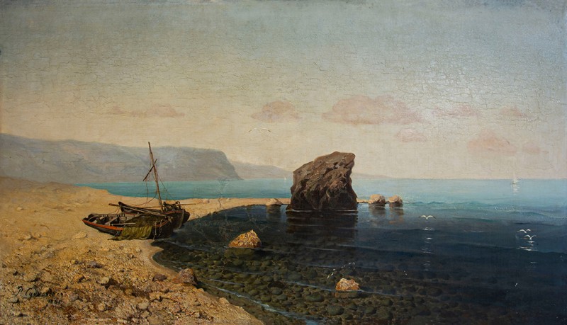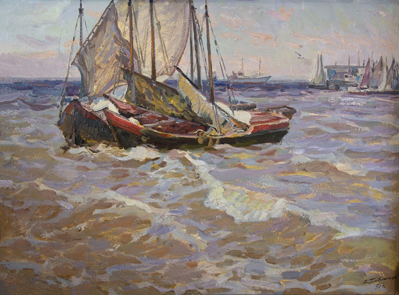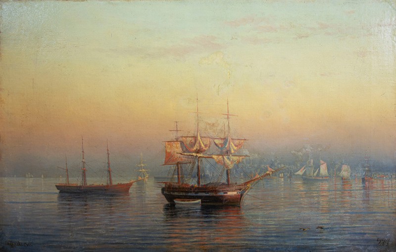 Зображено блакитне спокійне море з рожевими, жовтими і зеленими рефлексами, над яким праворуч дві чайки. У центрі - трищогловий баркас із білою ватерлінією та частково піднятими світлими вітрилами, до якого причалений білий човен. Зліва, віддалік таке ж судно з опущеними вітрилами. У глибині - різні вітрильні судна та берег із силуетами міських будівель. Небо жовтувато-бірюзове, рожеве до горизонту з невеликими світлими хмарами. Ліворуч унизу чорною фарбою: Судковский. Справа внизу: Одесса 1876