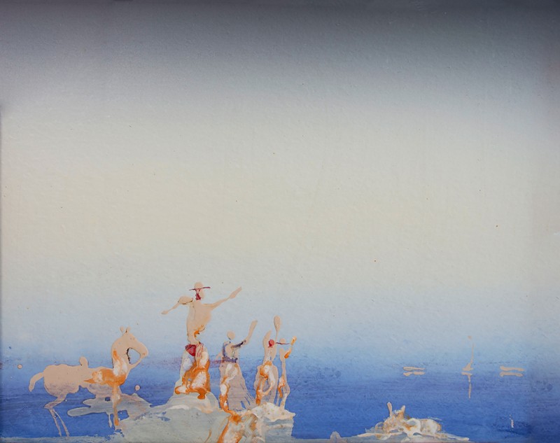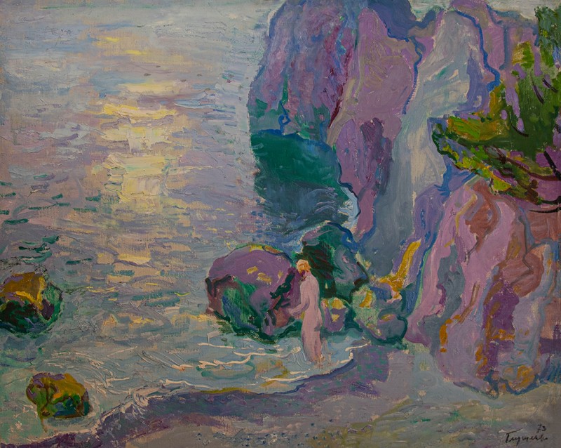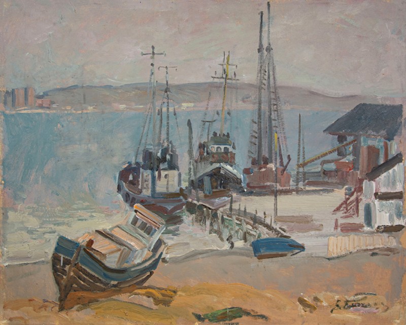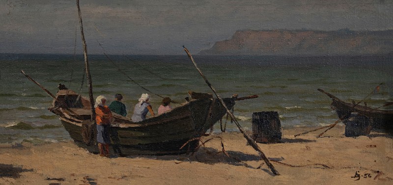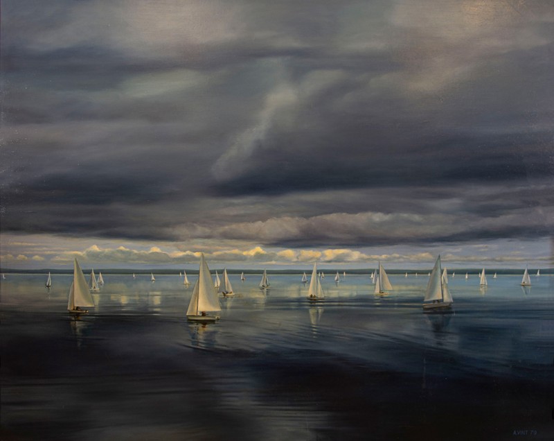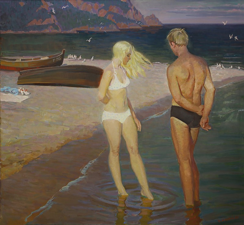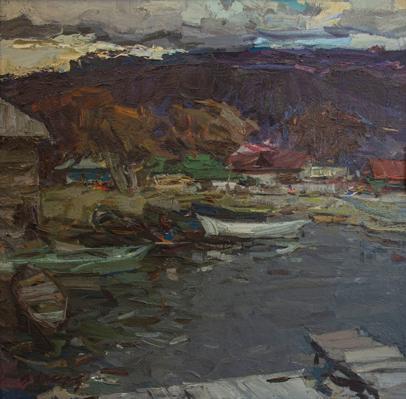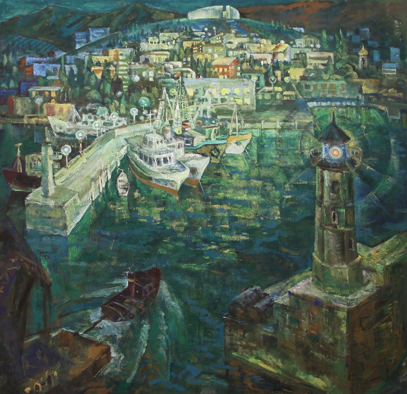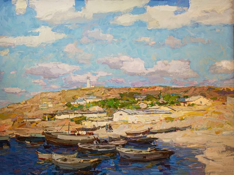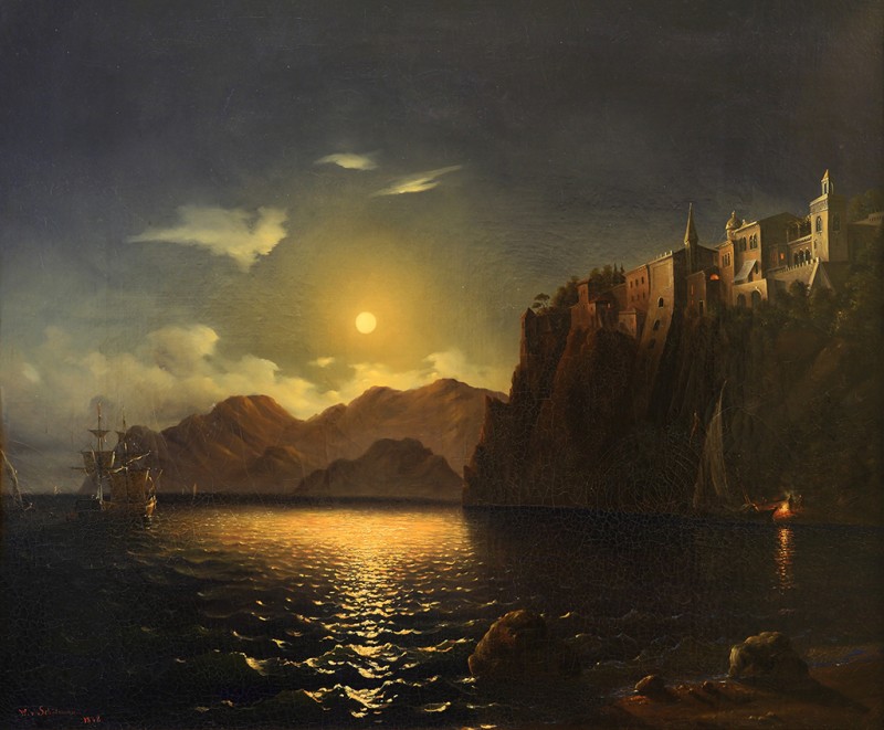 Зображено блакитне спокійне море з рожевими, жовтими і зеленими рефлексами, над яким праворуч дві чайки. У центрі - трищогловий баркас із білою ватерлінією та частково піднятими світлими вітрилами, до якого причалений білий човен. Зліва, віддалік таке ж судно з опущеними вітрилами. У глибині - різні вітрильні судна та берег із силуетами міських будівель. Небо жовтувато-бірюзове, рожеве до горизонту з невеликими світлими хмарами. Ліворуч унизу чорною фарбою: Судковский. Справа внизу: Одесса 1876