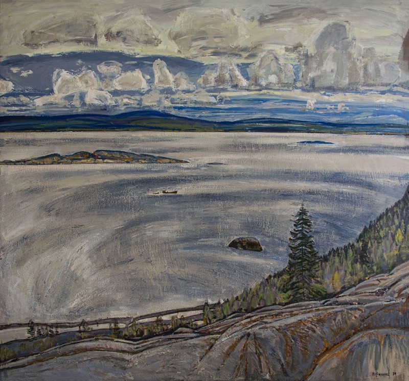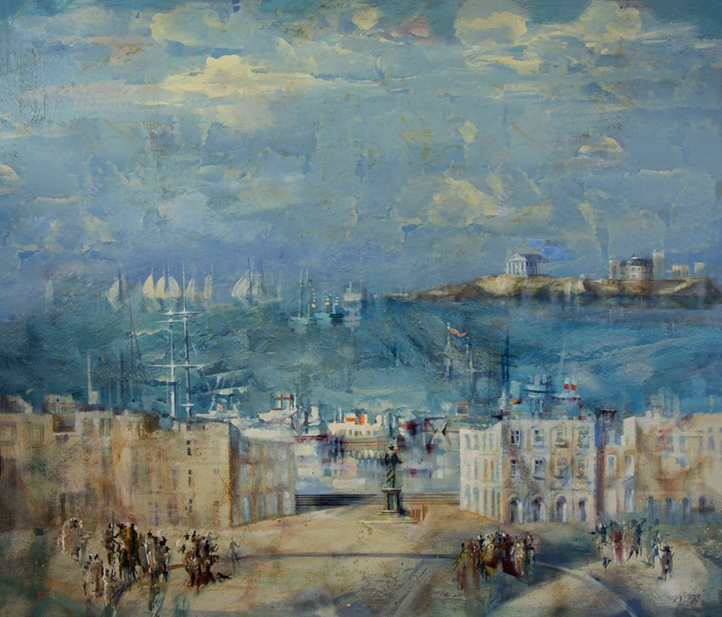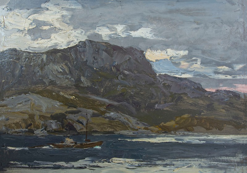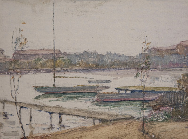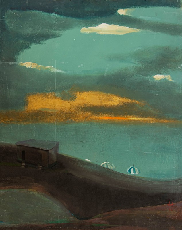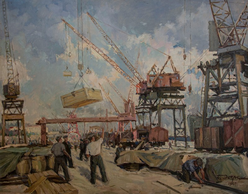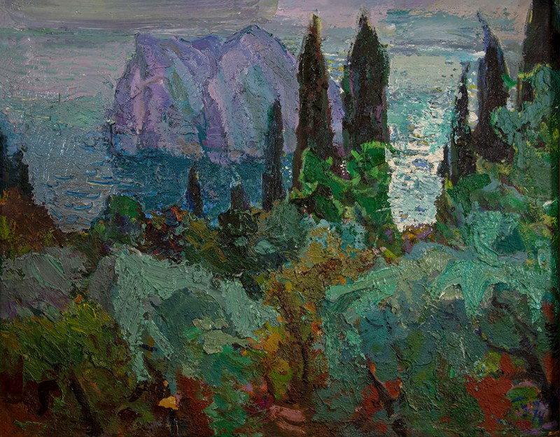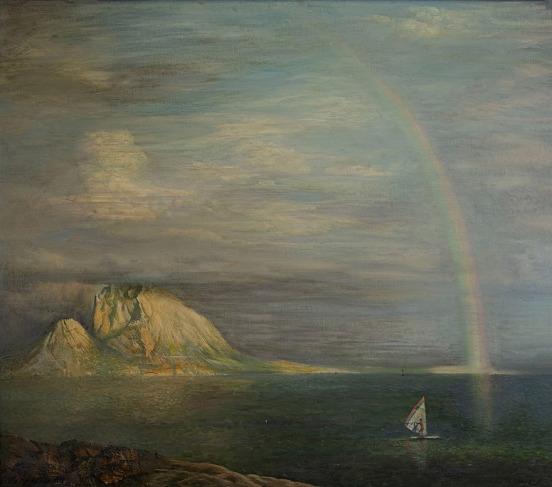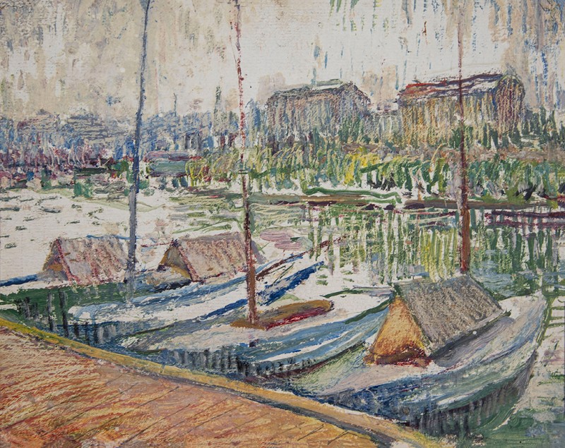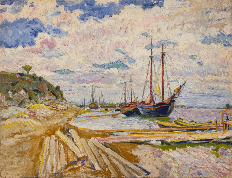 Зображено блакитне спокійне море з рожевими, жовтими і зеленими рефлексами, над яким праворуч дві чайки. У центрі - трищогловий баркас із білою ватерлінією та частково піднятими світлими вітрилами, до якого причалений білий човен. Зліва, віддалік таке ж судно з опущеними вітрилами. У глибині - різні вітрильні судна та берег із силуетами міських будівель. Небо жовтувато-бірюзове, рожеве до горизонту з невеликими світлими хмарами. Ліворуч унизу чорною фарбою: Судковский. Справа внизу: Одесса 1876