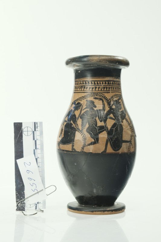 Розпис: у центрі танцюючий чоловік у плащі; по обидві сторони, лицем до нього танцюючі менади; над зображенням рослинний орнамент.