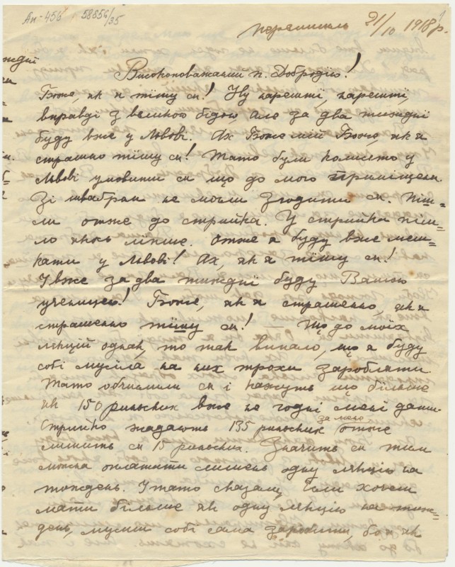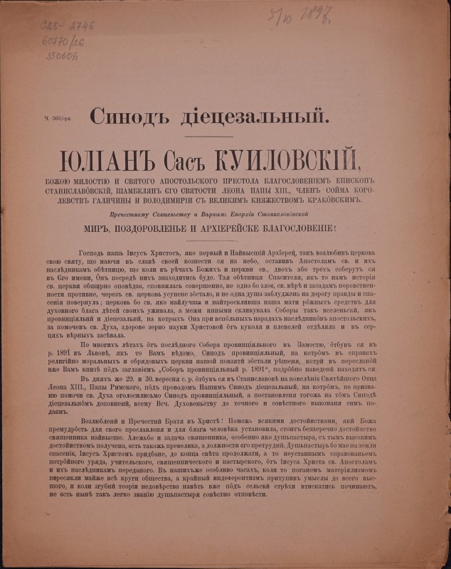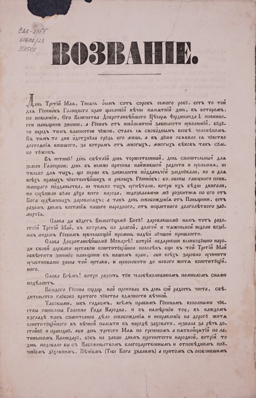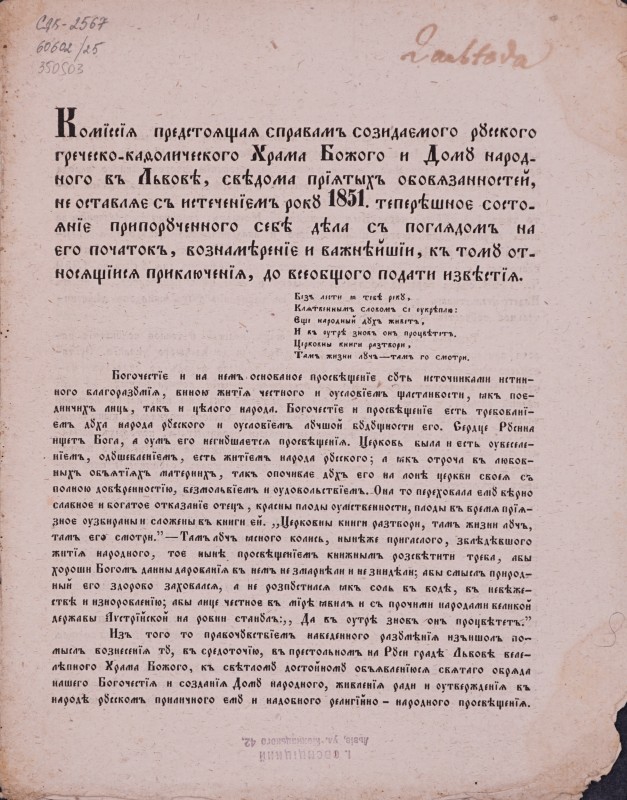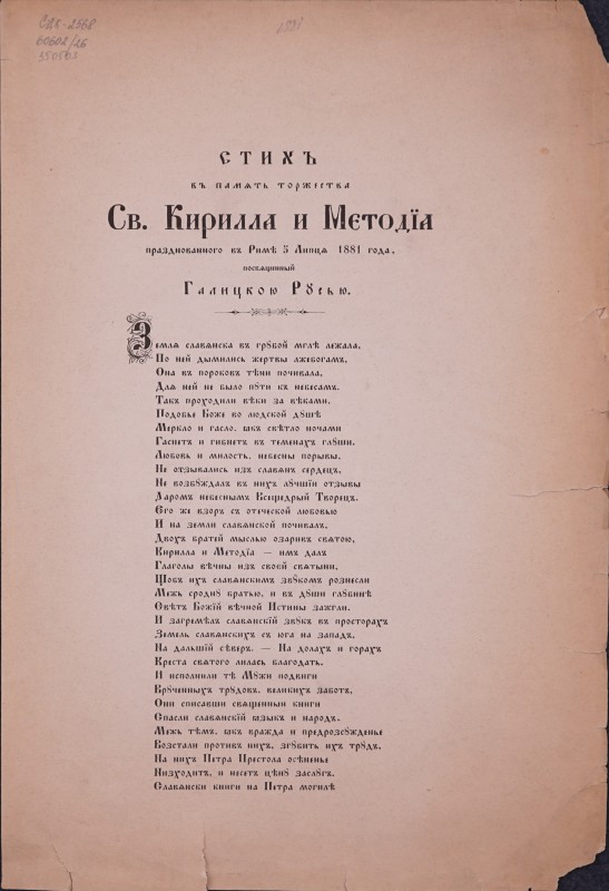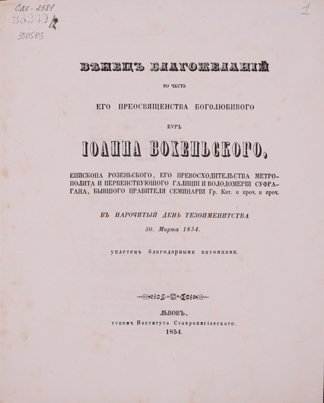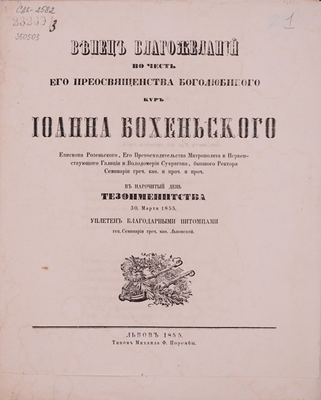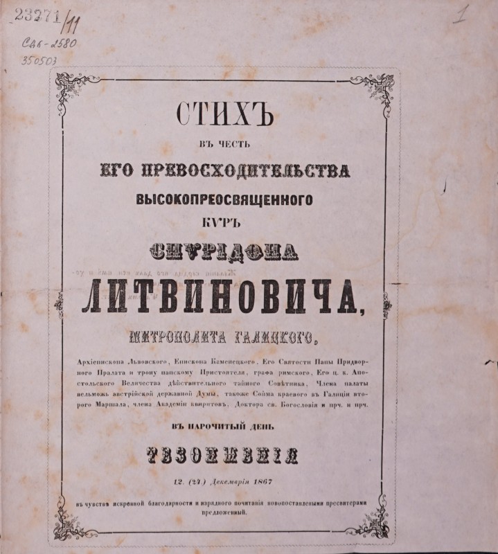 Вітальний вірш на честь єпископа Спиридона Литвиновича, складений учнями гр.-кат. Семінарії з нагоди його приїзду до Львова 22 травня (3 червня) 1857 р. - Львів: друкарня Cтавропігійського інст., 1857, [4] арк.