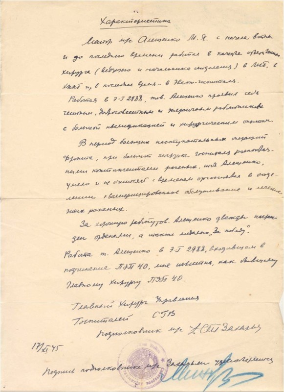 Посвідчення № 83/3 від 15.02.1945 р., видане майору м/с Алещенко М.Я. на отримання пільг. У верхньому лівому куту штамп польової пошти 40377. Посвідчення завірене печаткою військової частини та підписом начальника військової частини майором м/с Хомяком.