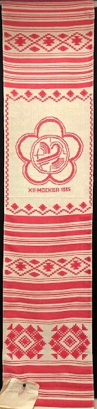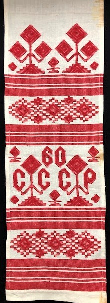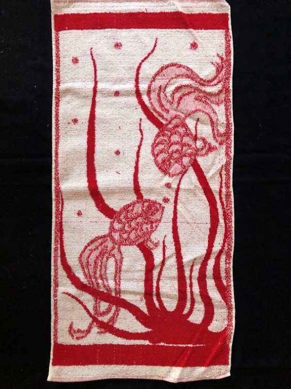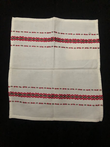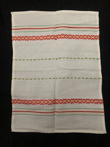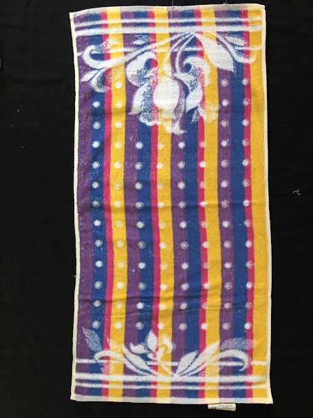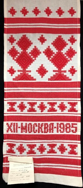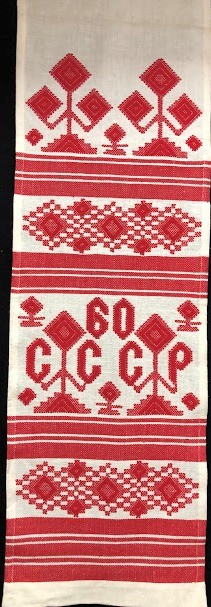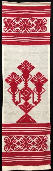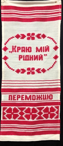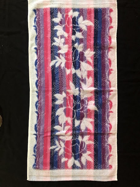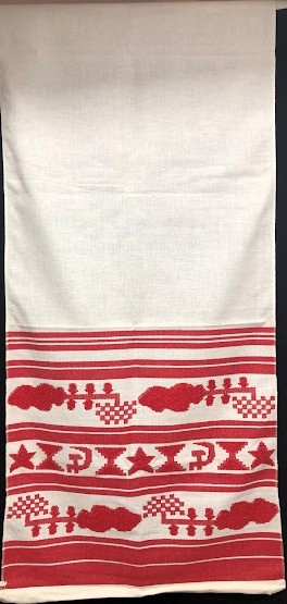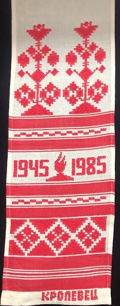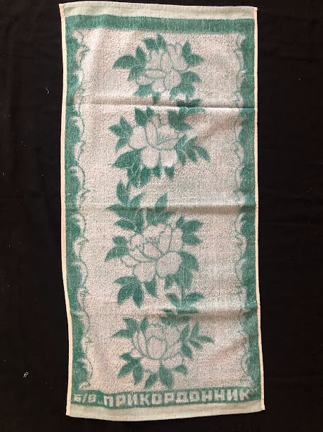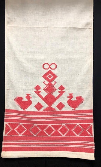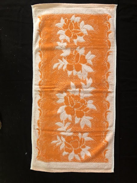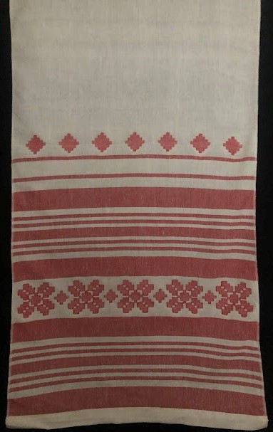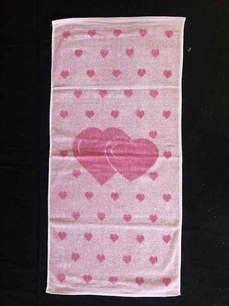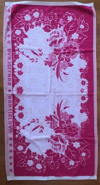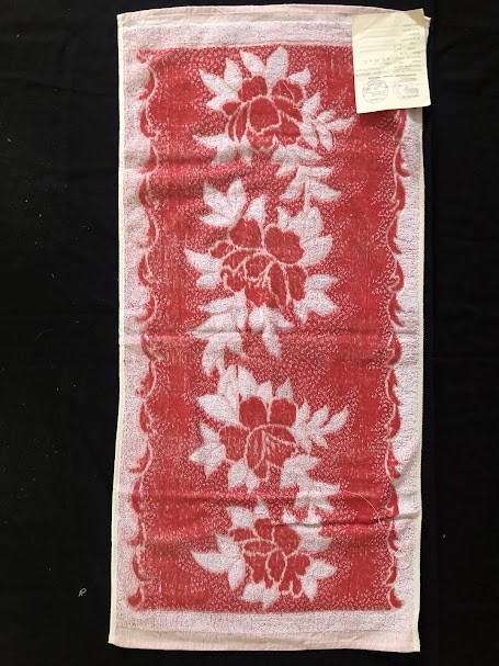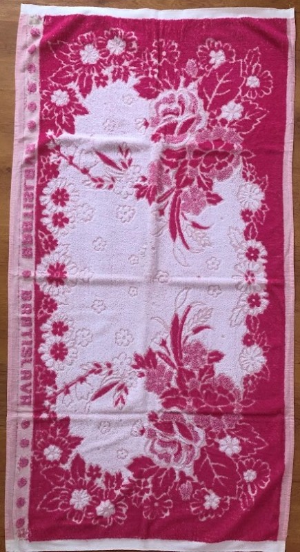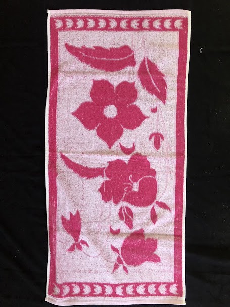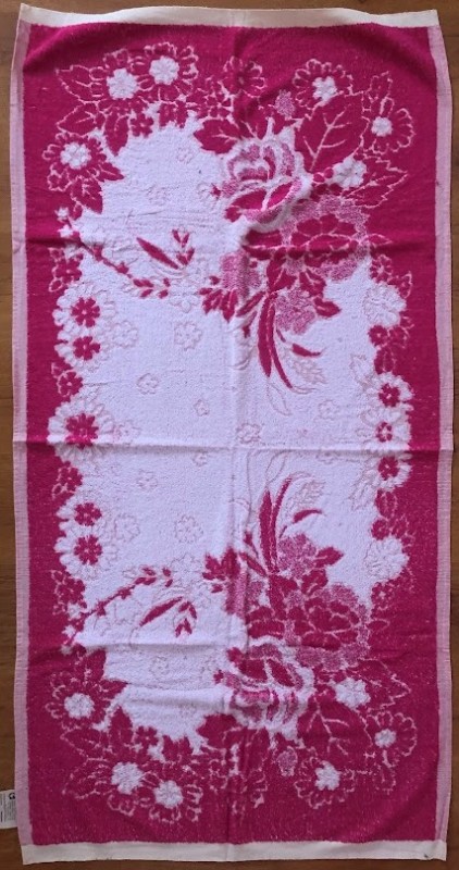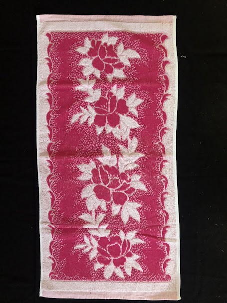 Рушник махровий. Виготовлено наприкінці ХХ століття на кролевецькій фабриці художнього ткацтва. Напівмеханічне ткацтво - жаккардова махра. Полотно виробу з білої та рожевої нитки. Орнамент квітковий двосторонній, утворений переплетенням ниток двох кольорів. Підрублено на швейній машинці з чотирьох сторін.