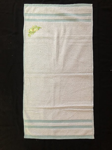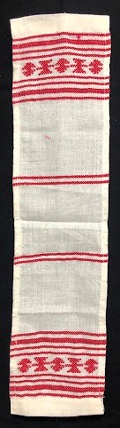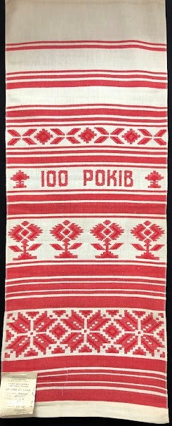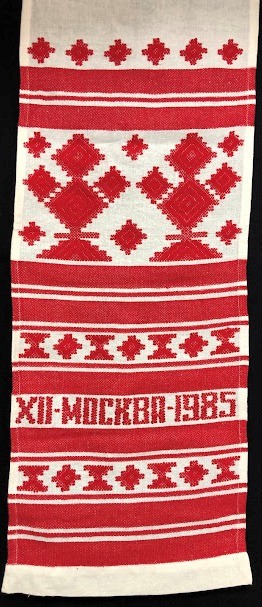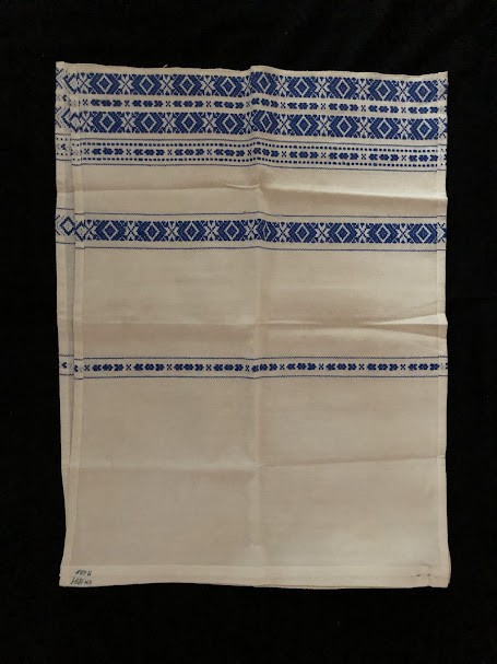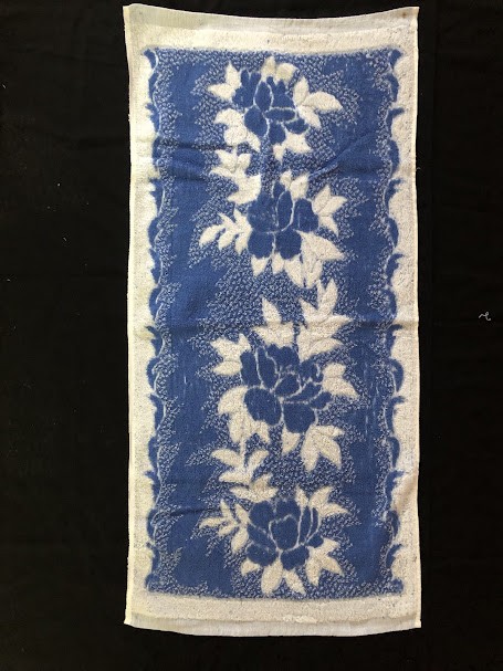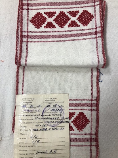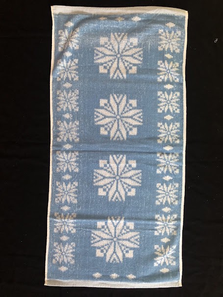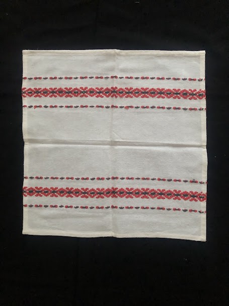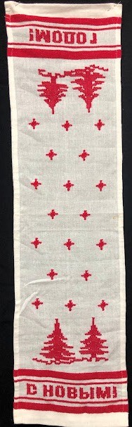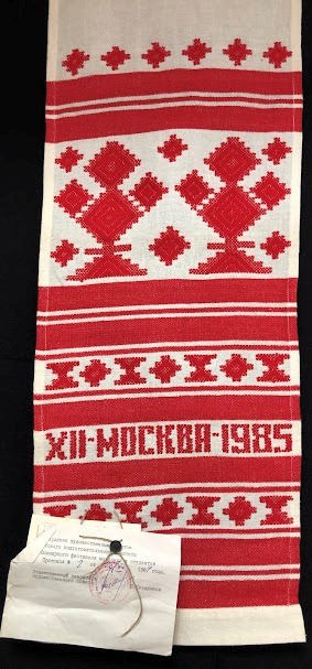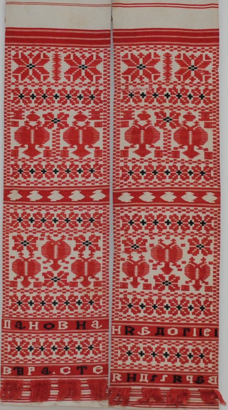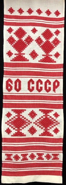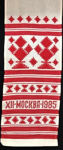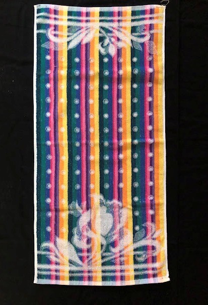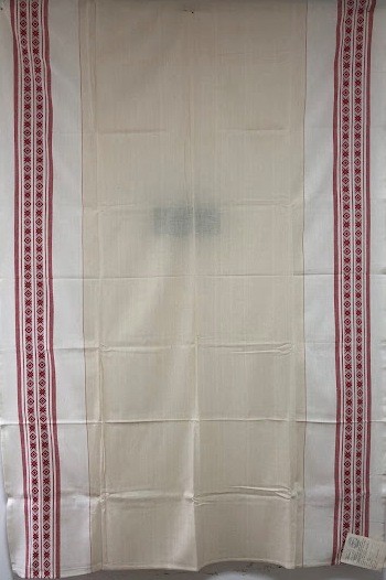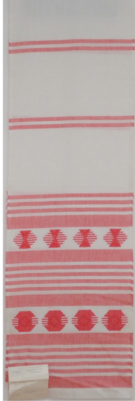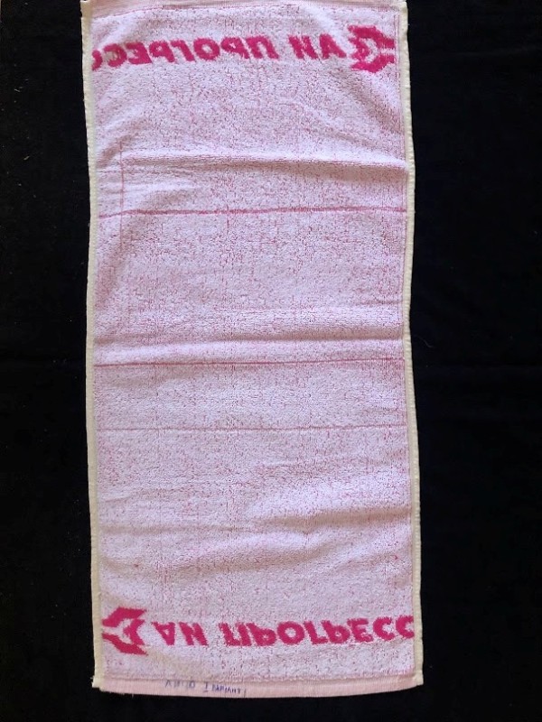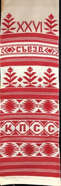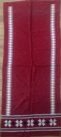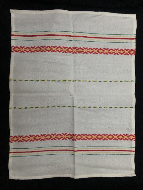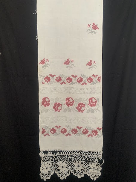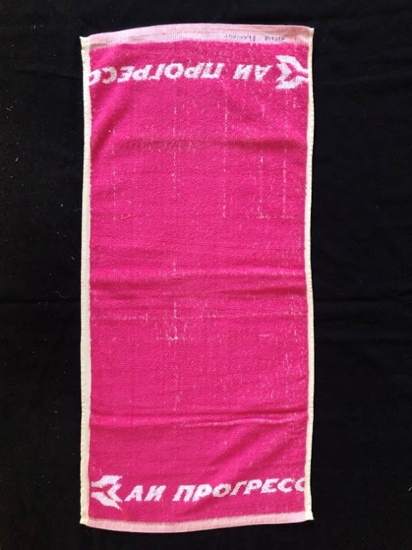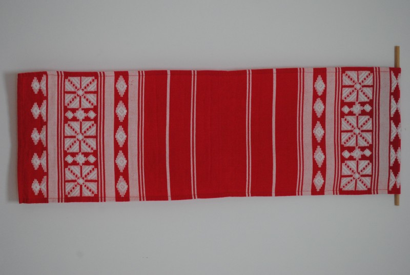 Рушник махровий. Виготовлено наприкінці ХХ століття на кролевецькій фабриці художнього ткацтва. Напівмеханічне ткацтво - жаккардова махра. Полотно виробу з білої та рожевої нитки. Орнамент квітковий двосторонній, утворений переплетенням ниток двох кольорів. Підрублено на швейній машинці з чотирьох сторін.