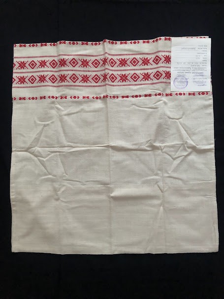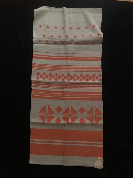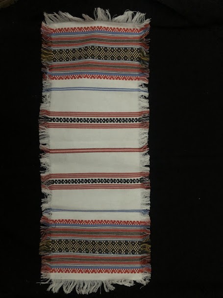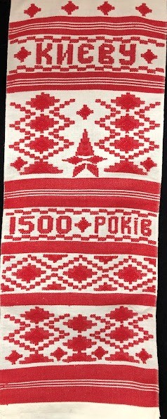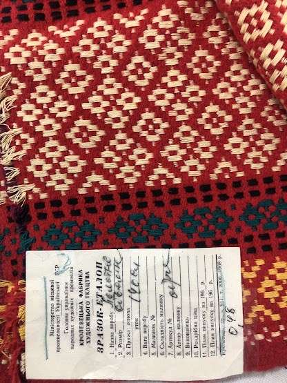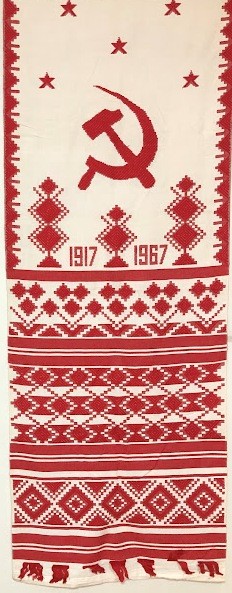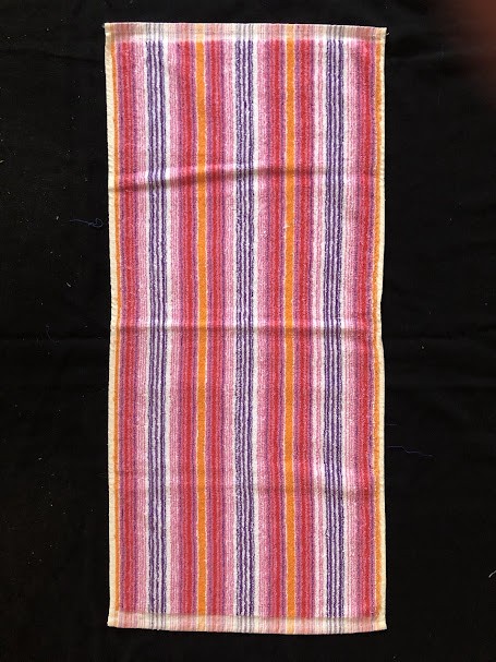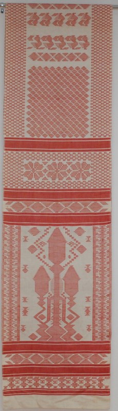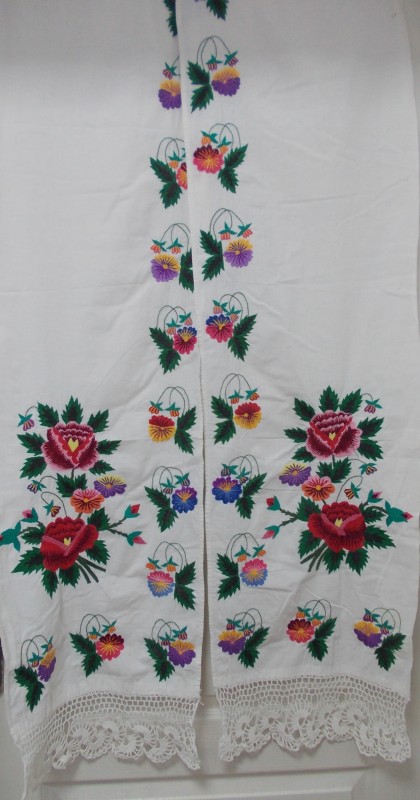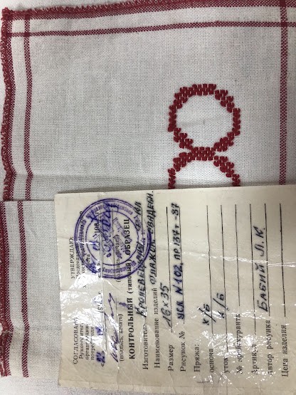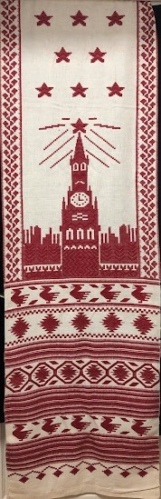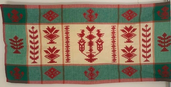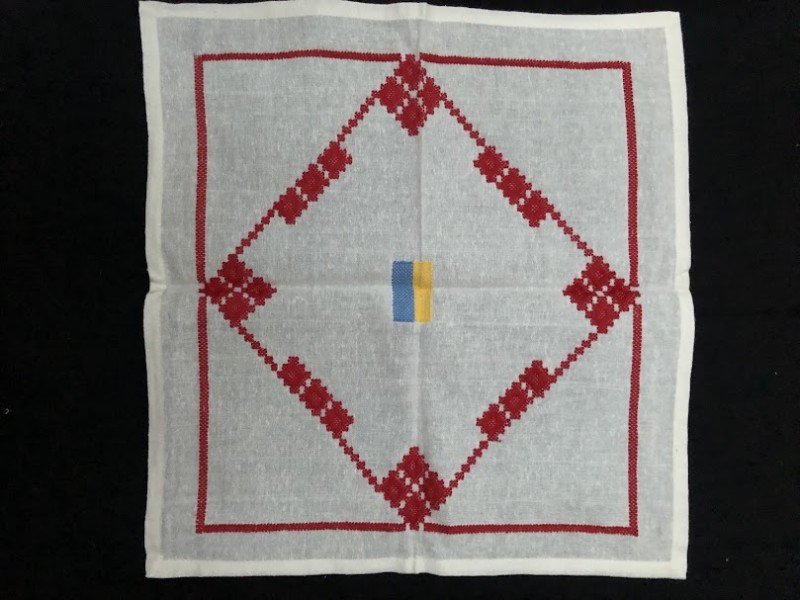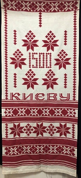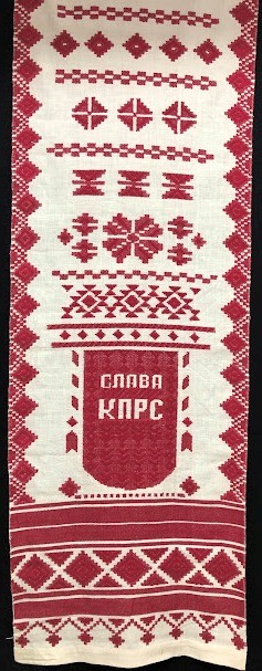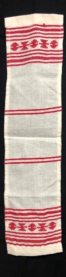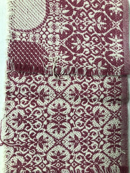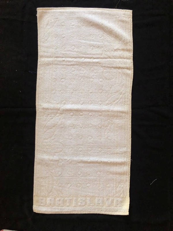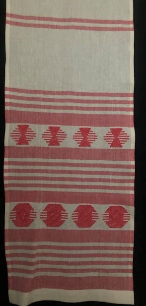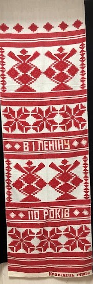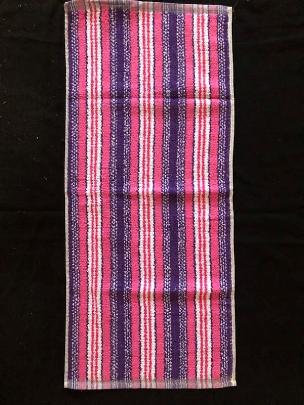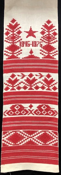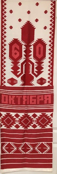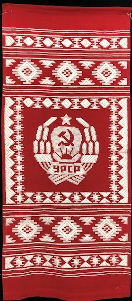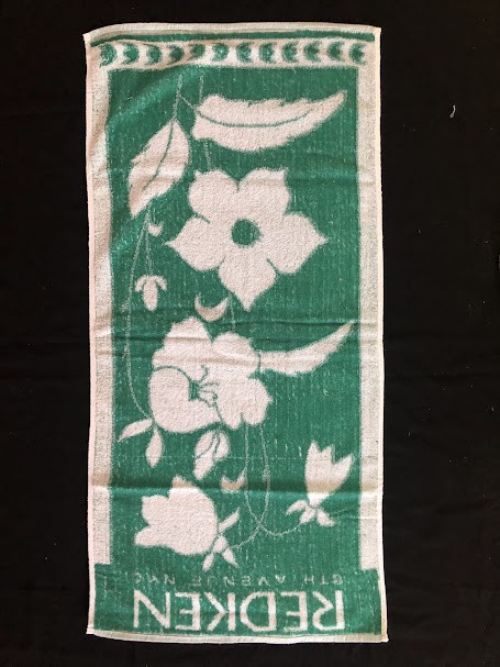 Рушник махровий. Виготовлено наприкінці ХХ століття на кролевецькій фабриці художнього ткацтва. Напівмеханічне ткацтво - жаккардова махра. Полотно виробу з білої та рожевої нитки. Орнамент квітковий двосторонній, утворений переплетенням ниток двох кольорів. Підрублено на швейній машинці з чотирьох сторін.