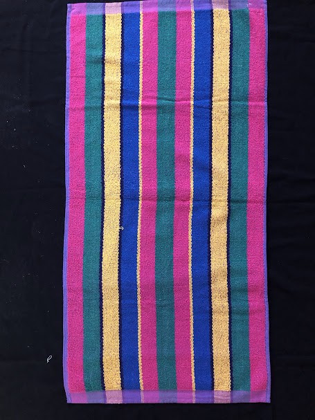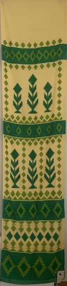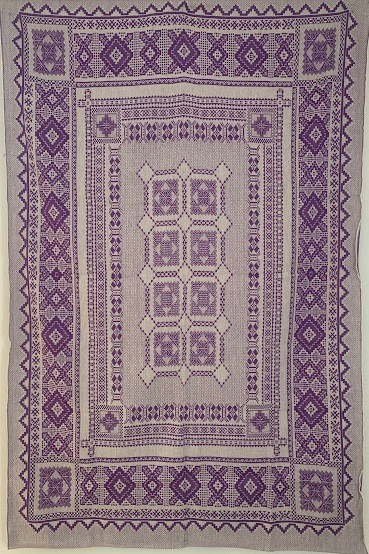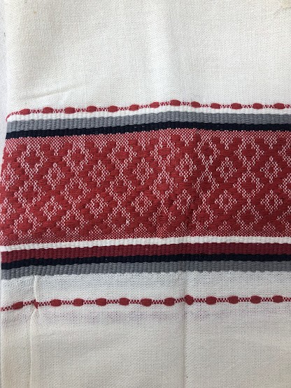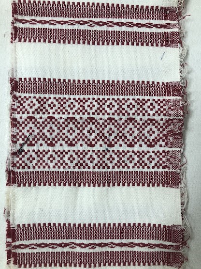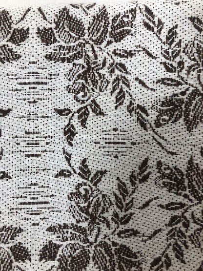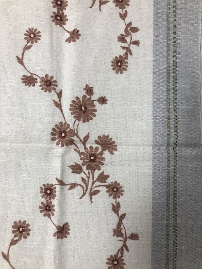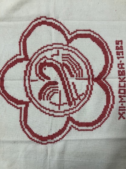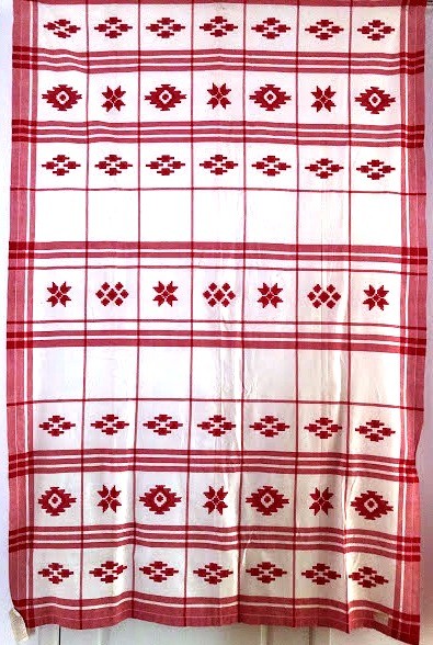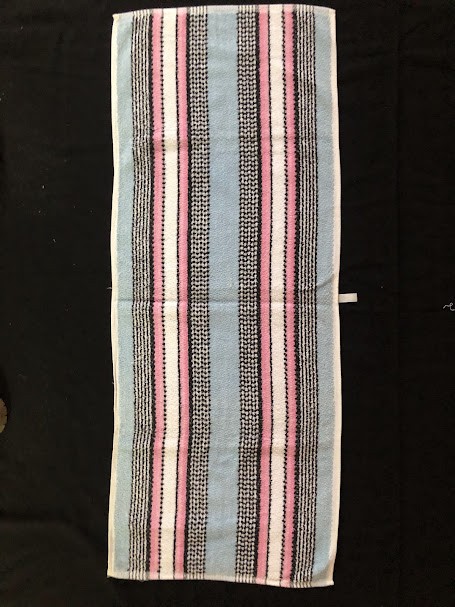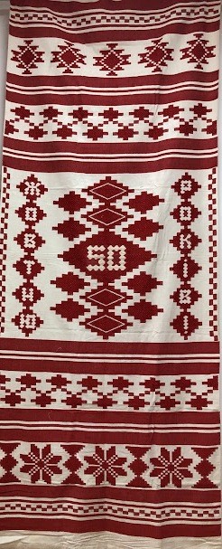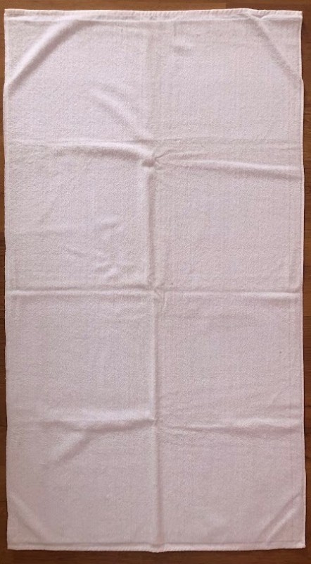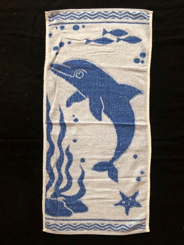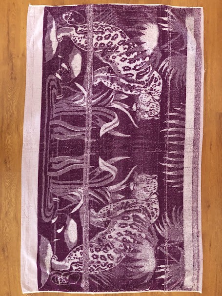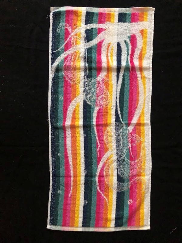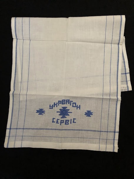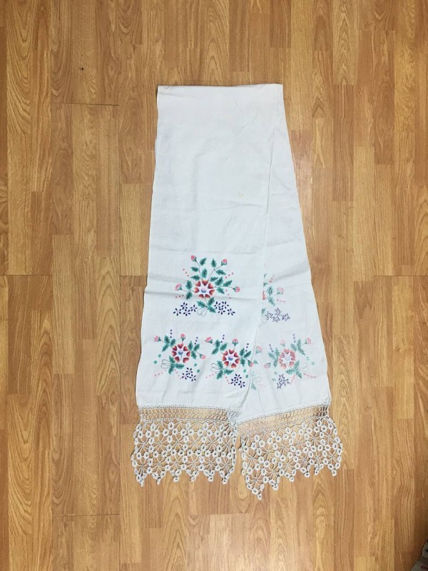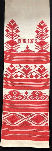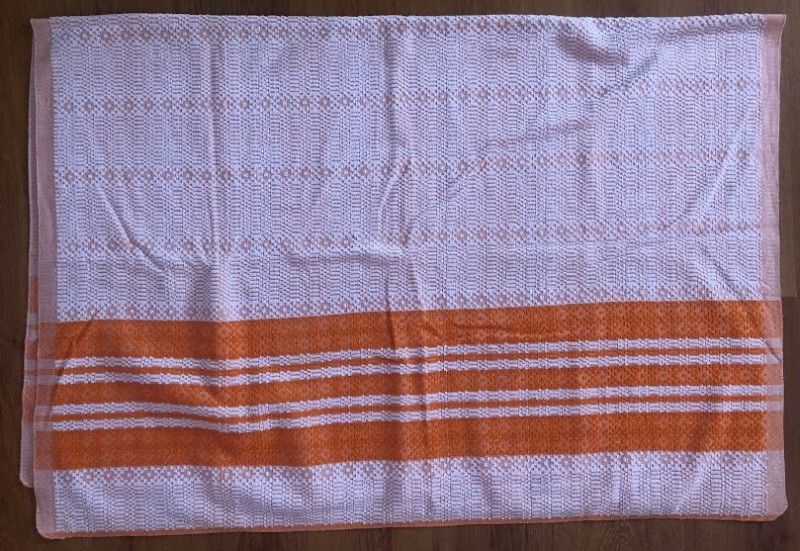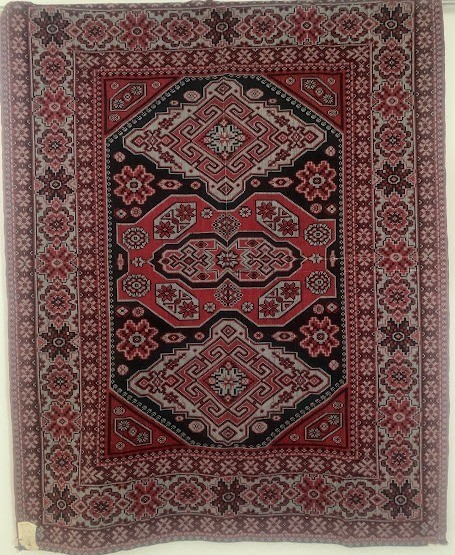 Рушник махровий. Виготовлено наприкінці ХХ століття на кролевецькій фабриці художнього ткацтва. Напівмеханічне ткацтво - жаккардова махра. Полотно виробу з білої та рожевої нитки. Орнамент квітковий двосторонній, утворений переплетенням ниток двох кольорів. Підрублено на швейній машинці з чотирьох сторін.