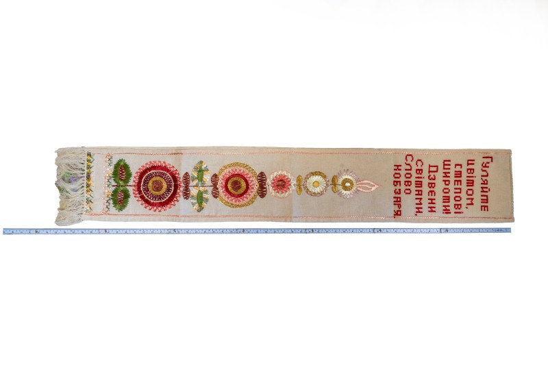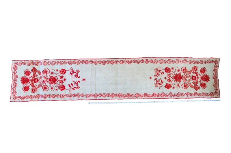 Рушник виготовлений з фабричного полотна. Краї рушника підрублені та оздоблені обметицею, ниткою червоного кольору. Рушник прикрашений вишитим орнаментом у техніці «гладь». По периметру рушник оздоблений рамкою з дубового гілля та стилізованих жолудів світло-коричневого кольору. Середина ( ⅓ рушника) порожня. Основна частина рушника по краях дзеркально орнаментована. Композиція - «дерево життя», на гілках якого сидять пташки. Листя світло-коричневого та зеленого кольорів. У птахів червоні гребінці, пір’я хвостів зелені та коричневі, у дзьобах вони тримають гілочки з ягодами синього кольору.