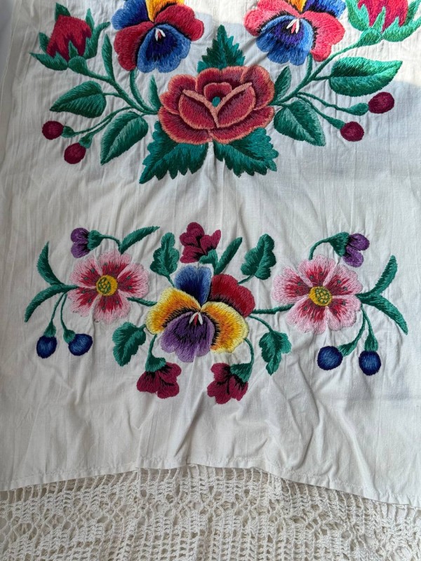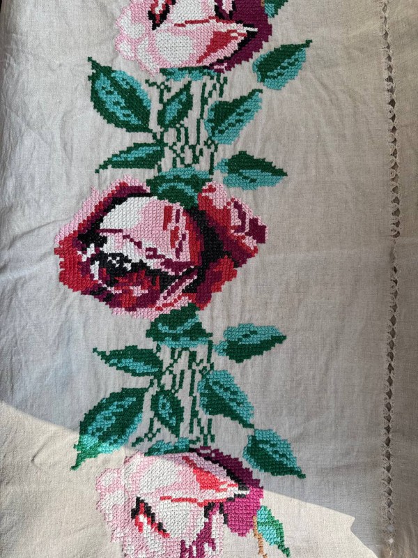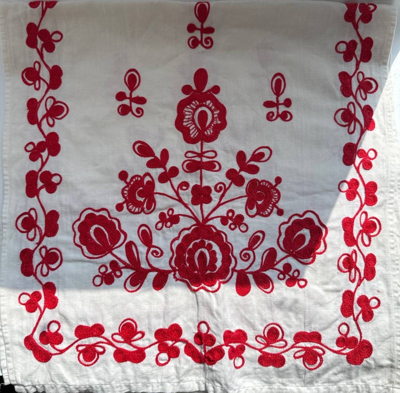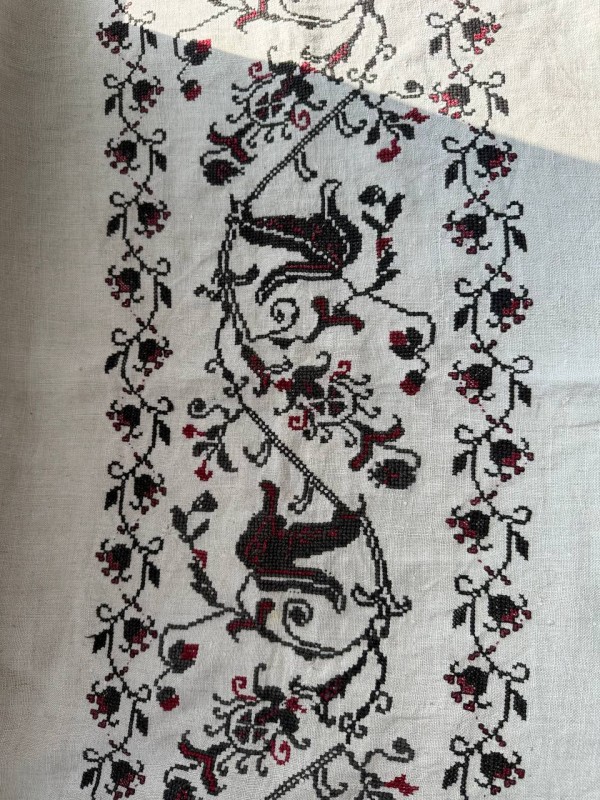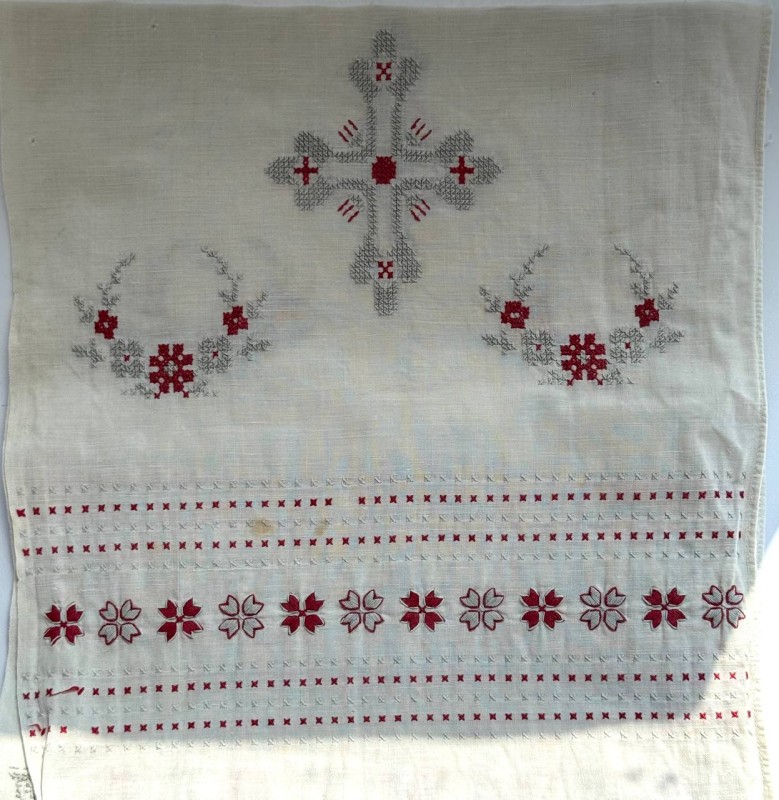 Рушник вишитий хрестиком, нитками червоного та чорного кольорів. Орнамент рослинний та геометричний, повторюється на обох кінцях рушника.
