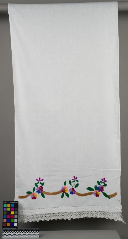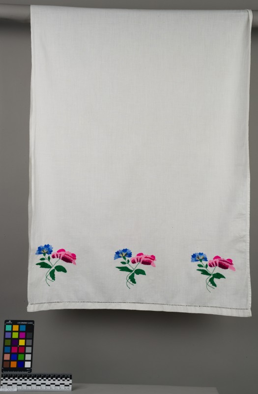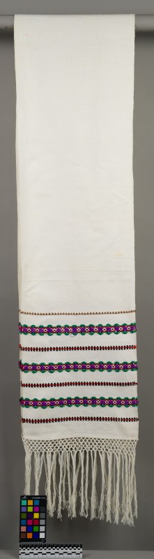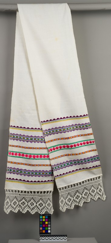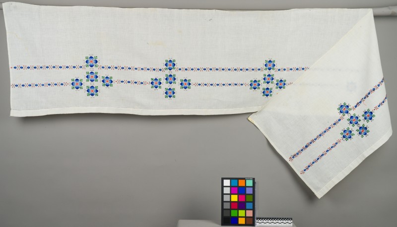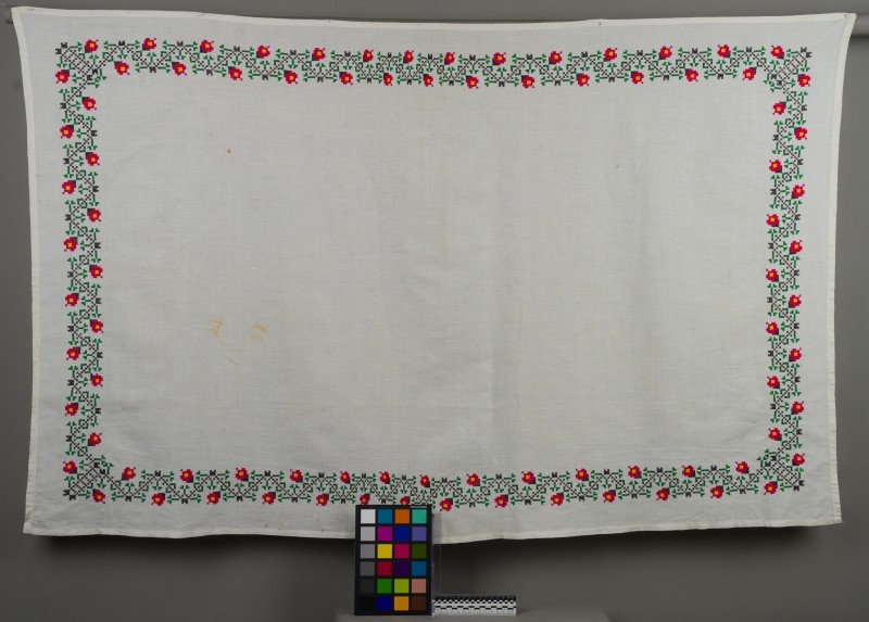 Серветка. Серветка прямокутної форми, різнокольорова; складена з окремих фрагментів круглої форми, в центрі яких «квітка конюшини» малинового кольору, два ажурні кола молочного кольору, обв'язані облямівкою зеленого кольору, і поєднані між собою фрагментами квадратної форми в червоно-бордових відтінках з «квіткою конюшини» посередині