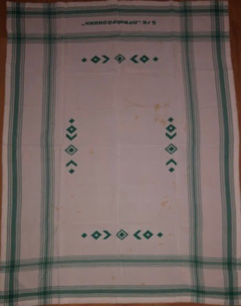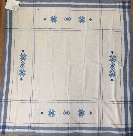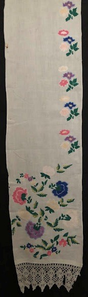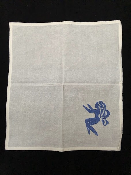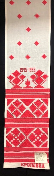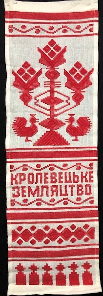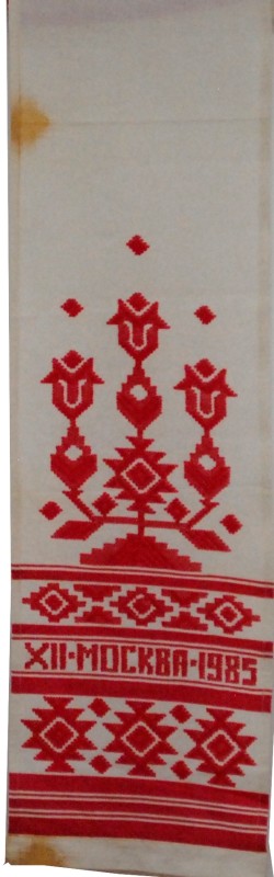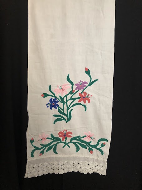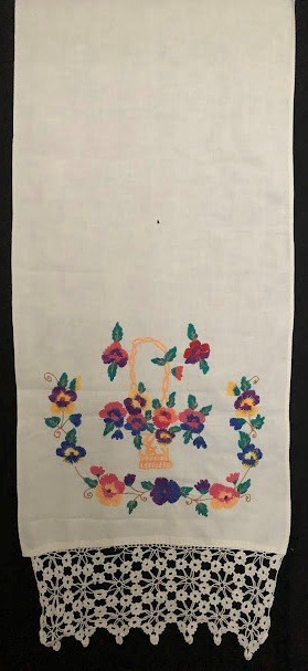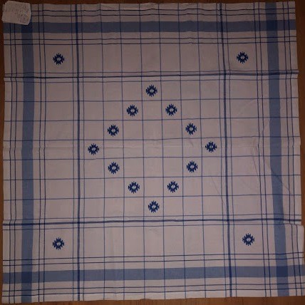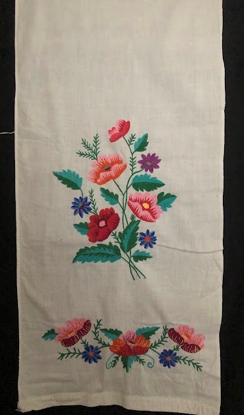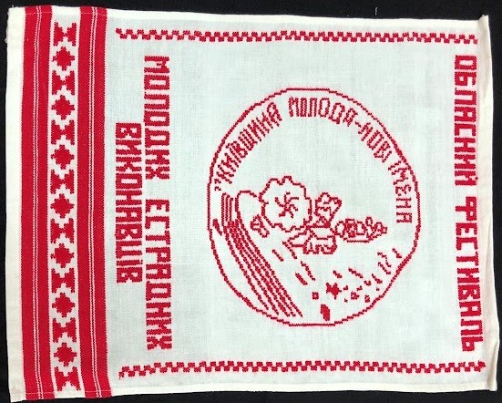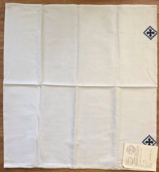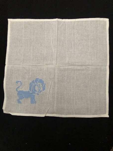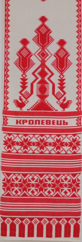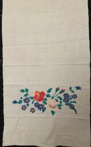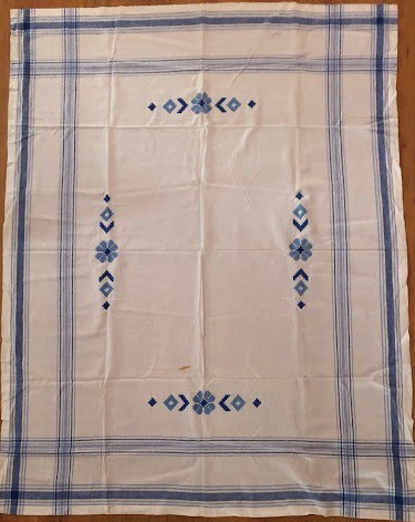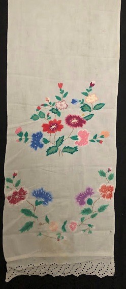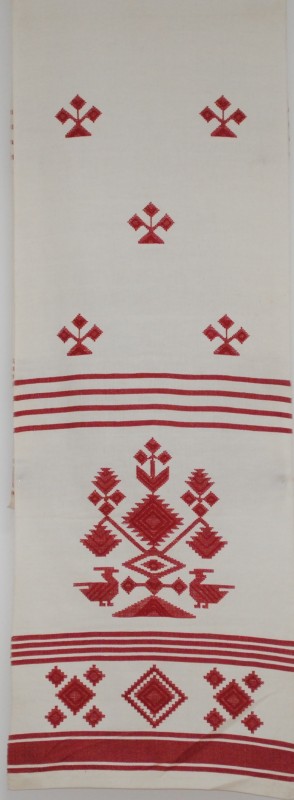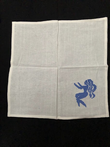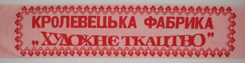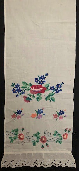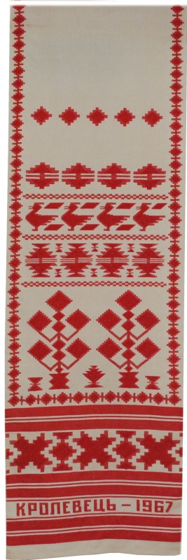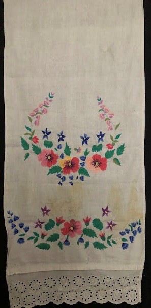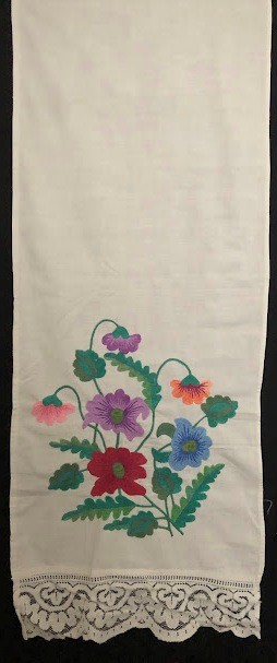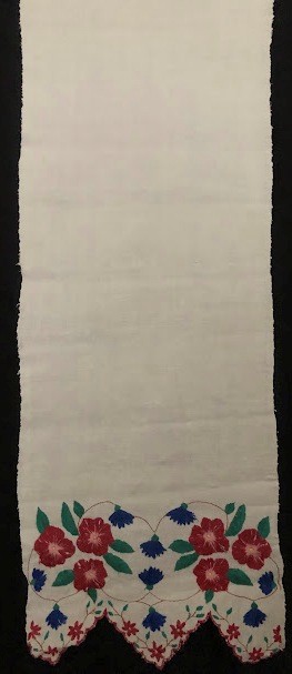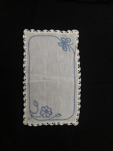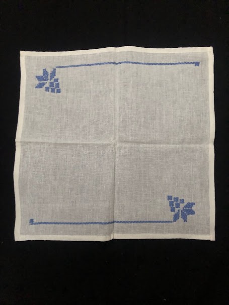Серветка. Виготовлено наприкінці ХХ століття на кролевецькій фабриці художнього ткацтва. Полотно біле бавовняне, орнамент вишито на швейній машинці шовковими блакитними нитками. Композиція малюнка серветки складається з вишитого квіткового орнаменту. Підрублено на швейній машинці з усих сторін.