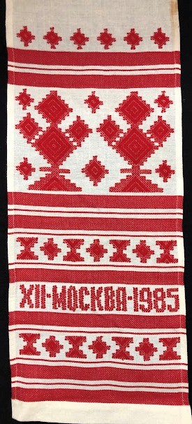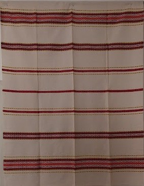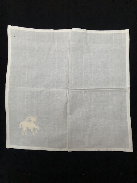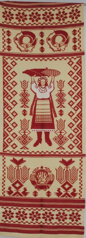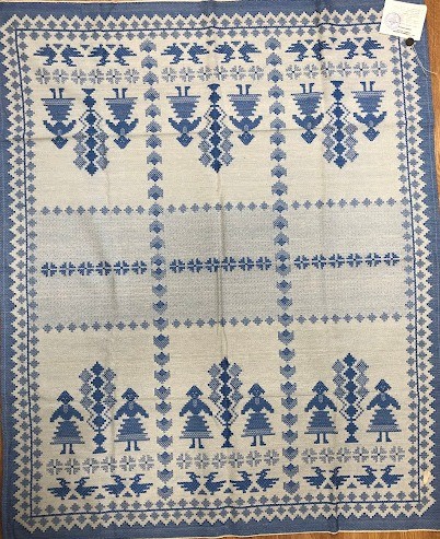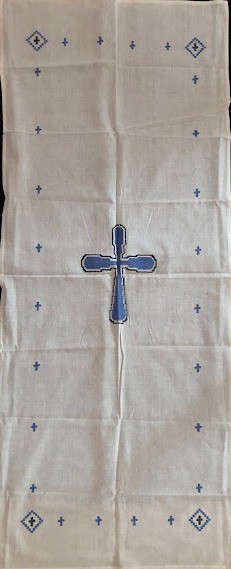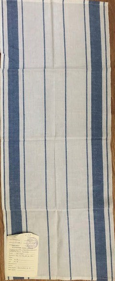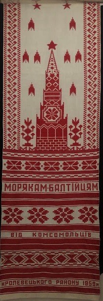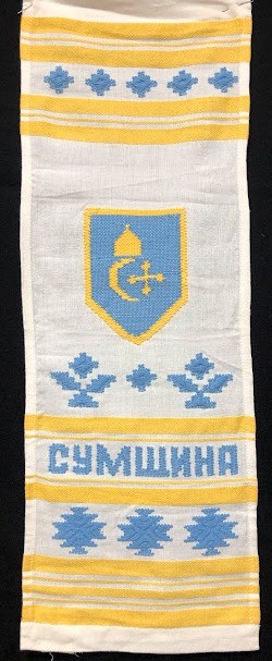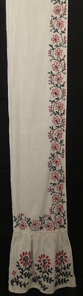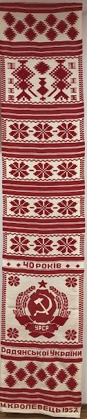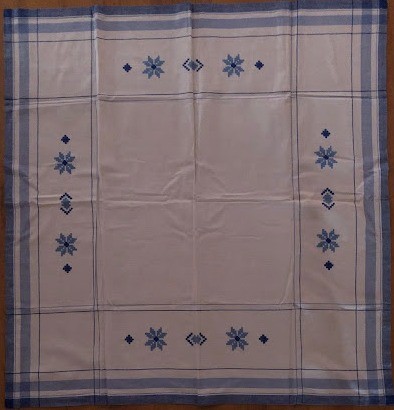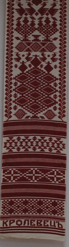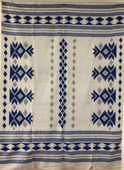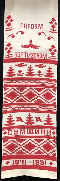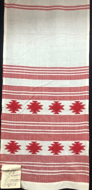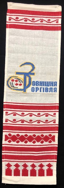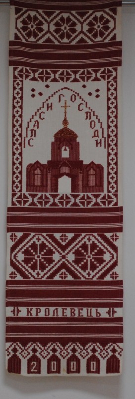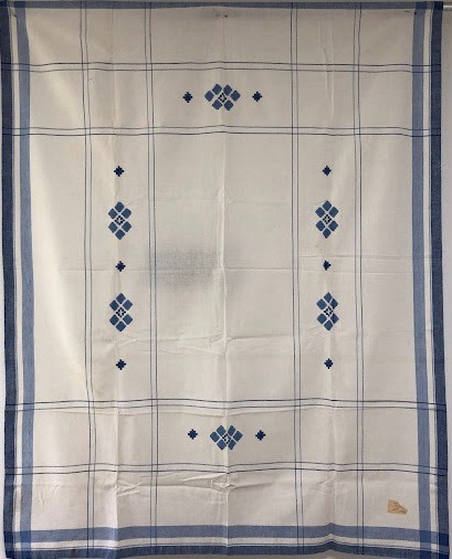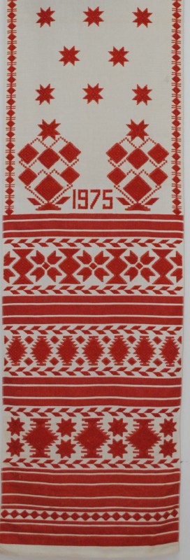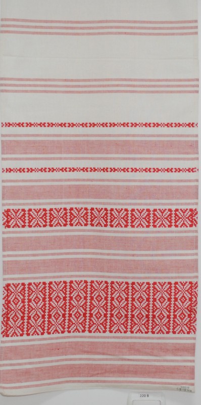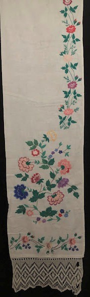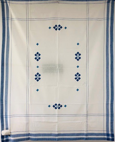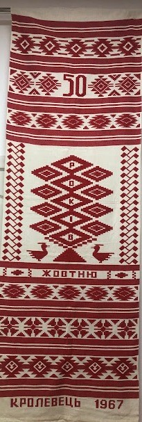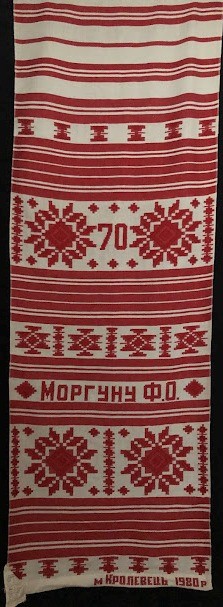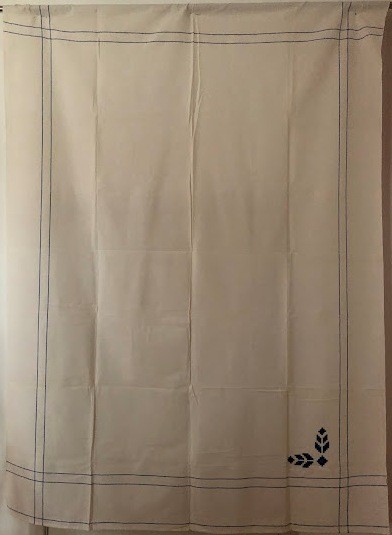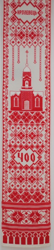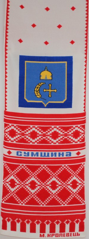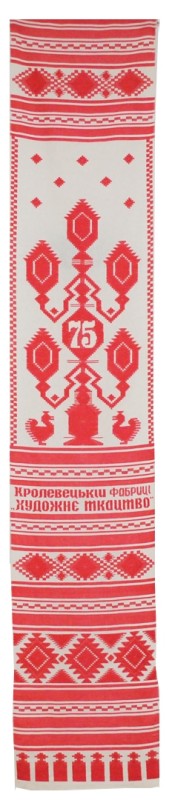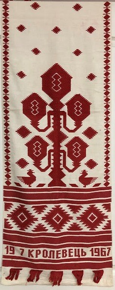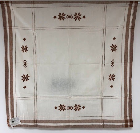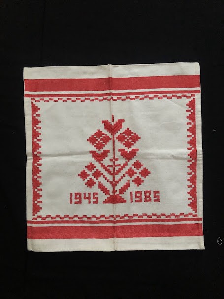Серветка. Виготовлено наприкінці ХХ століття на кролевецькій фабриці художнього ткацтва. Полотно біле бавовняне, орнамент вишито на швейній машинці шовковими блакитними нитками. Композиція малюнка серветки складається з вишитого квіткового орнаменту. Підрублено на швейній машинці з усих сторін.