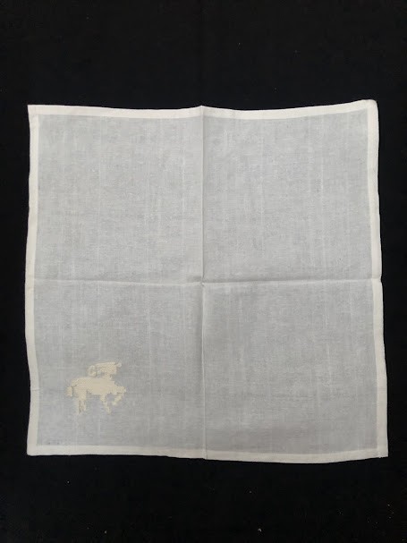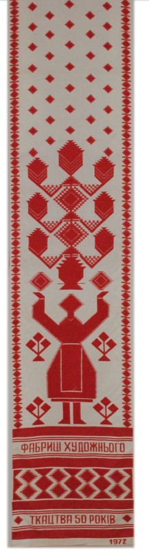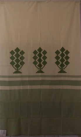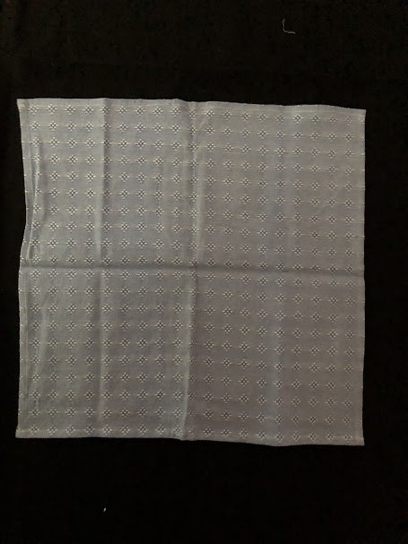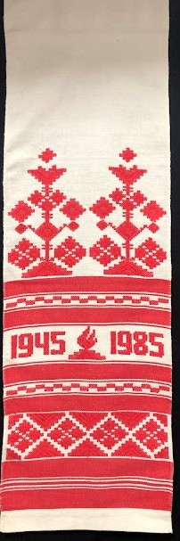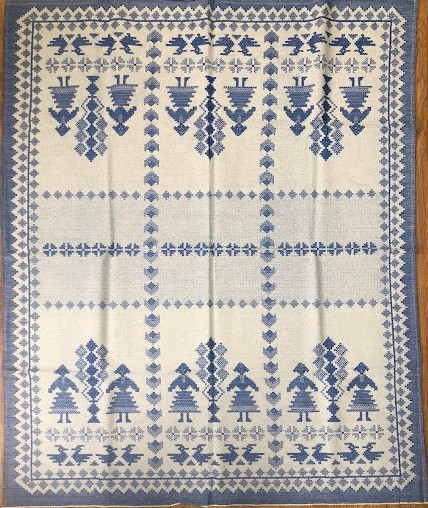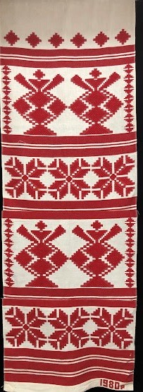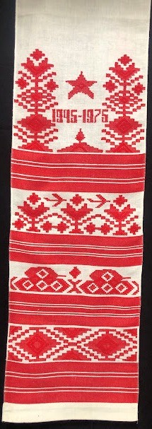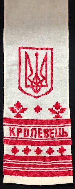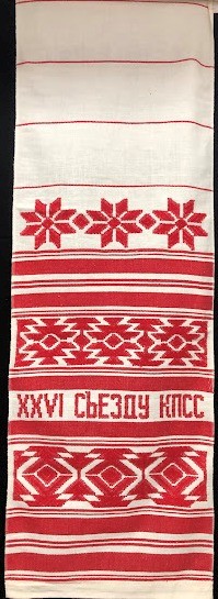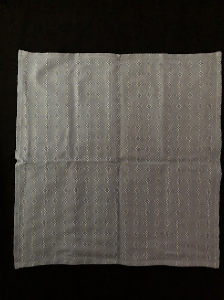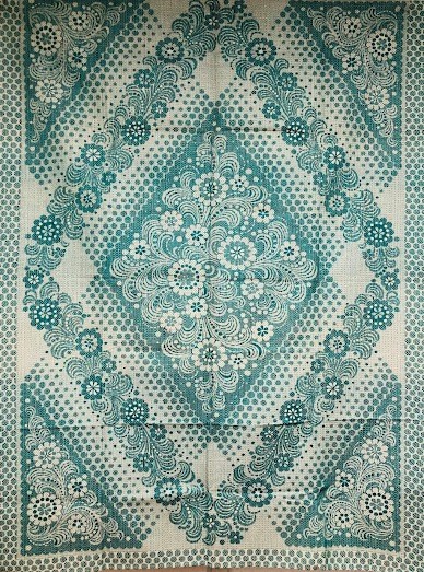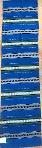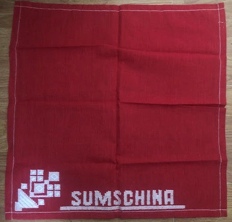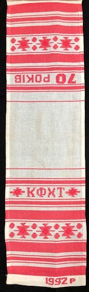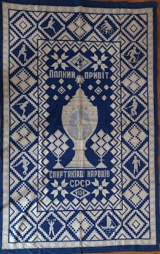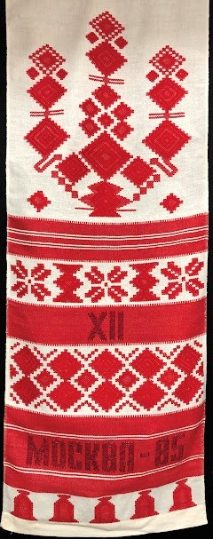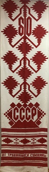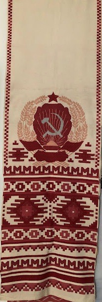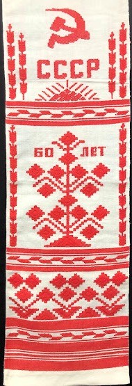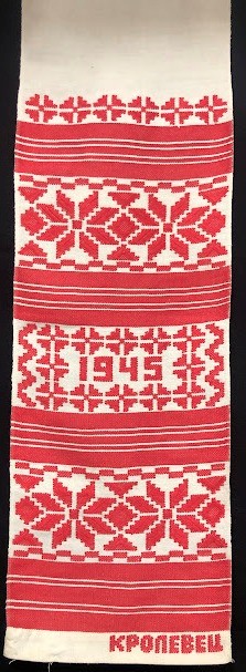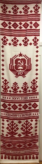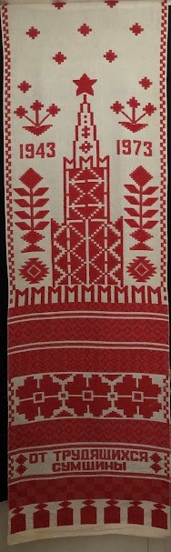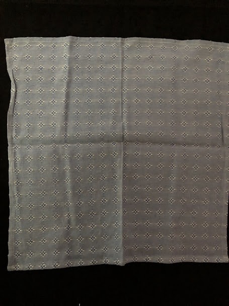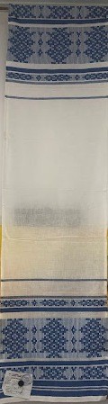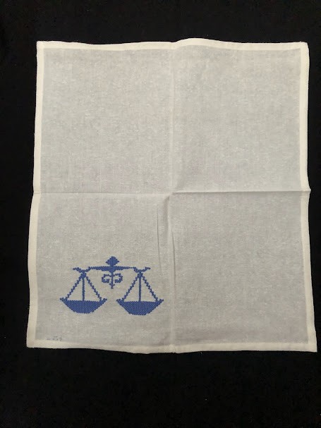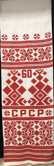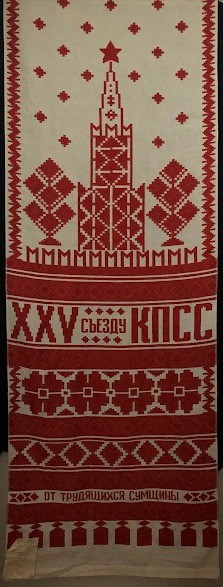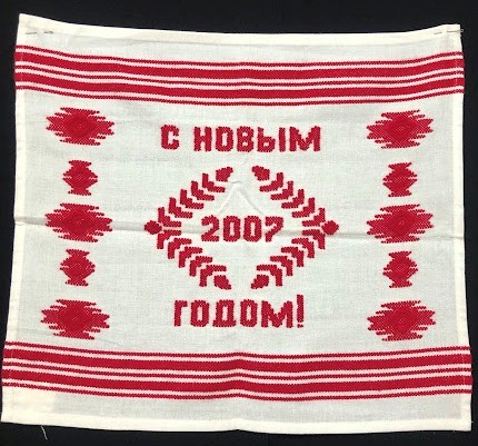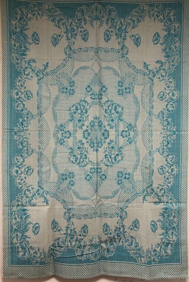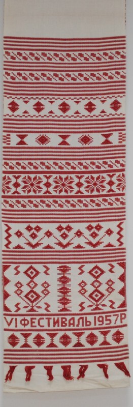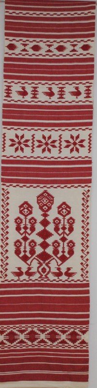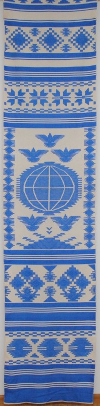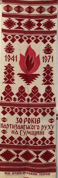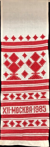 Серветка. Виготовлено наприкінці ХХ століття на кролевецькій фабриці художнього ткацтва. Полотно біле бавовняне, орнамент вишито на швейній машинці шовковими блакитними нитками. Композиція малюнка серветки складається з вишитого квіткового орнаменту. Підрублено на швейній машинці з усих сторін.