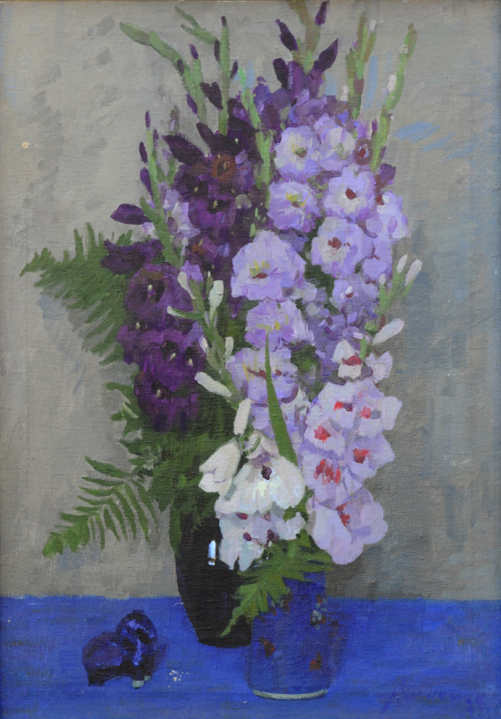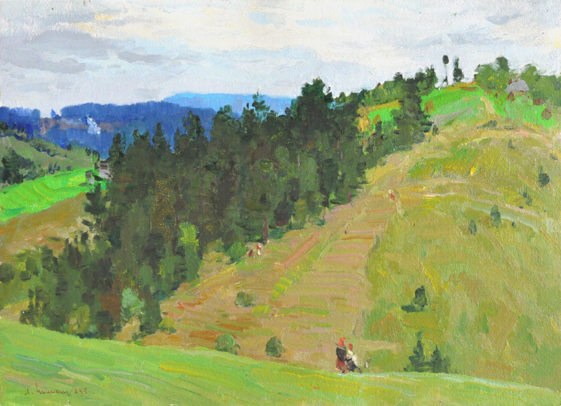 Автор Безуглий Данило Іванович. Фронтальна композиція. На передньому плані сірувато - зелене море з жовтуватими відблисками ліворуч. На другому плані сіруватий силует міських забудов: будинків, мінаретів, соборів з куполами. Небо сіре. У нижньому лівому куті підпис Д. Безуглый.