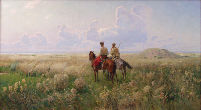 Автор Базилянський Едуард Йосипович. Вигляд на двір перед багатоповерховим білим будинком з дверима та вікнами арочної форми. Перед дверима – велика калюжа, у якій відображається стіна будинку. Ліворуч та праворуч – темно-коричневі будівлі, дерева з жовтіючим листям. Ліворуч – білизна на мотузці, натягнута на двох стовпах. У центрі переднього плану два чорних кота та синьо-червоний м’яч. У верхній частині композиції ліворуч – верхній поверх та дах багатоповерхового будинку. По центру та ліворуч – дахи будинків, баштові крани, темне нічне небо. У нижньому правому куті – Е. Базилянський.