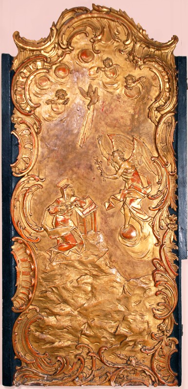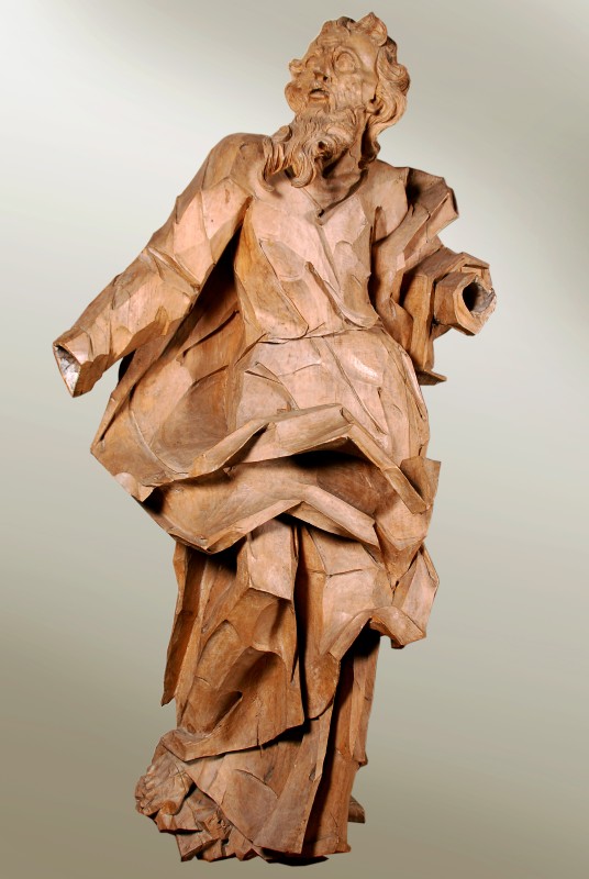Декоративна скульптура апостола Павла у повний зріст. Його голова піднята й повернута у 3/4 вліво. Прямий довгий ніс, довгі вуса прикривають верхню губу й спадають на коротку бороду, уста привідкриті. Руки зігнуті, у лівій тримає розгорнуту книгу, нижній край якої торкається бедра. Кисть правої руки відсутня. Апостол одягнений у хітон, з під якого видно босі стопи. На торцях книги - залишки позолоти по левкасу.