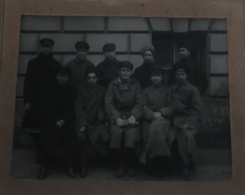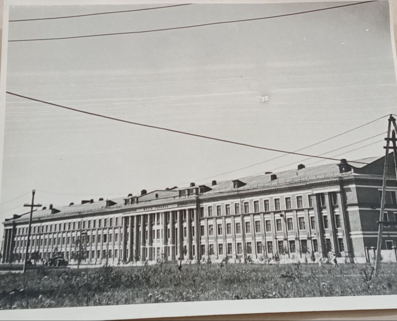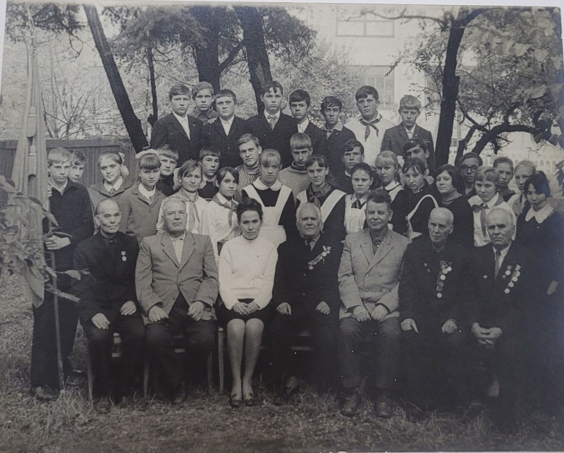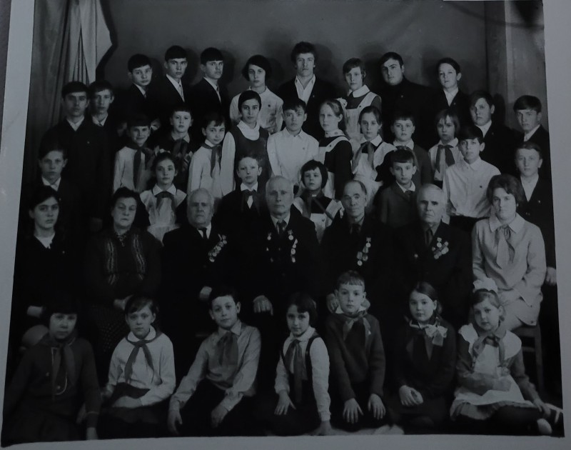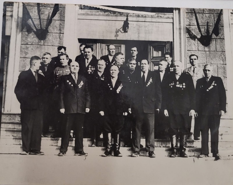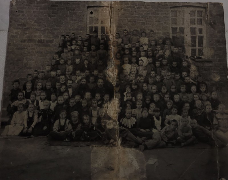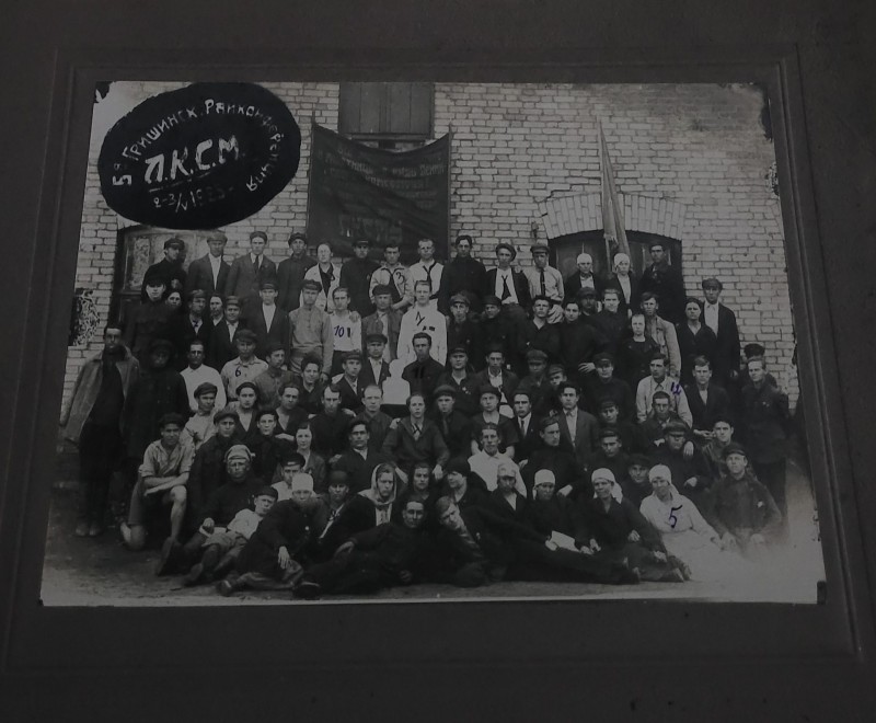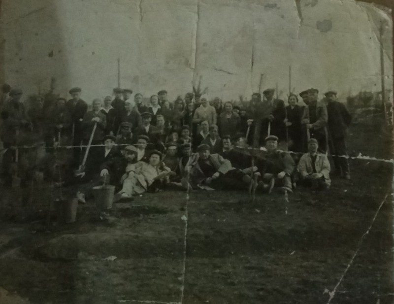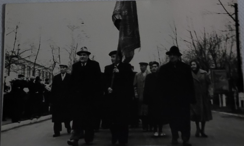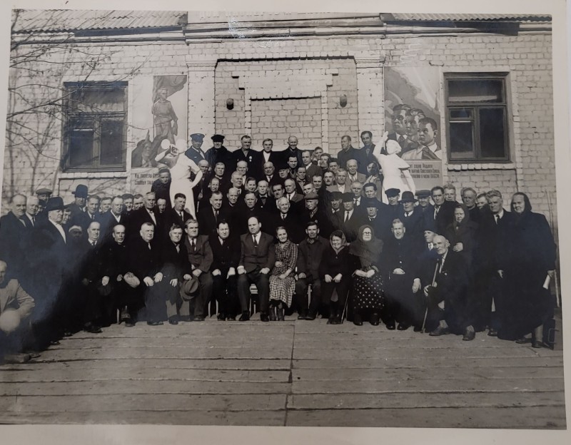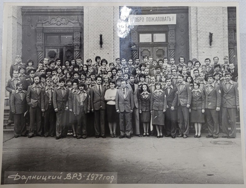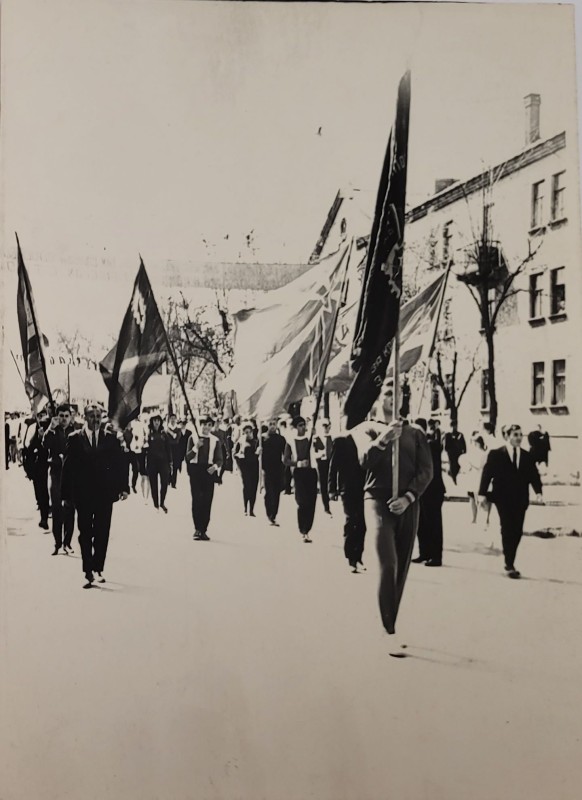 Зображення учнів та викладачів в декілька рядів. Перший ряд – хлопці напівлежачі. Праворуч чорна пляма. На з.п. фрагмент будівлі з двома вікнами. Посередині транспарант з написом білим кольором «1-е Травня».