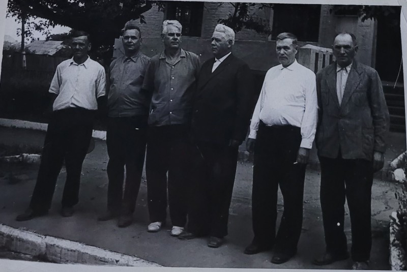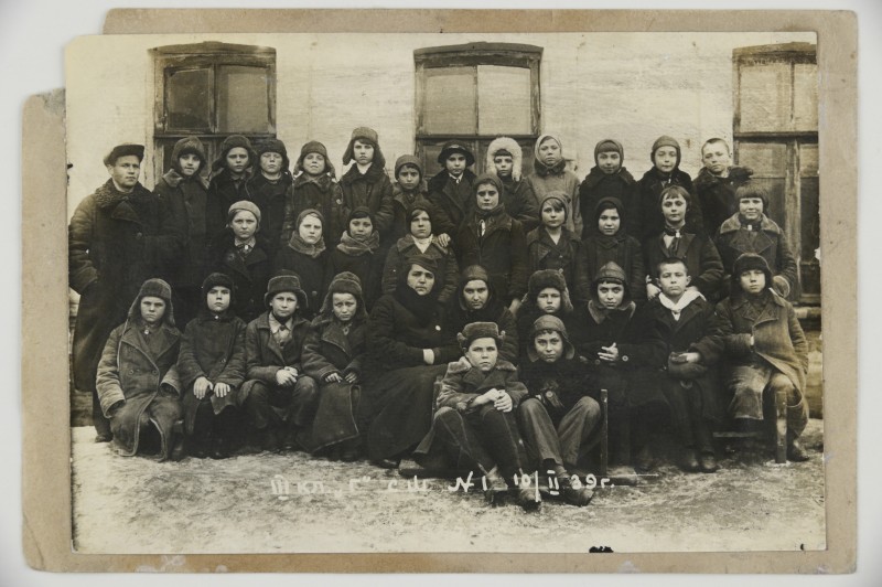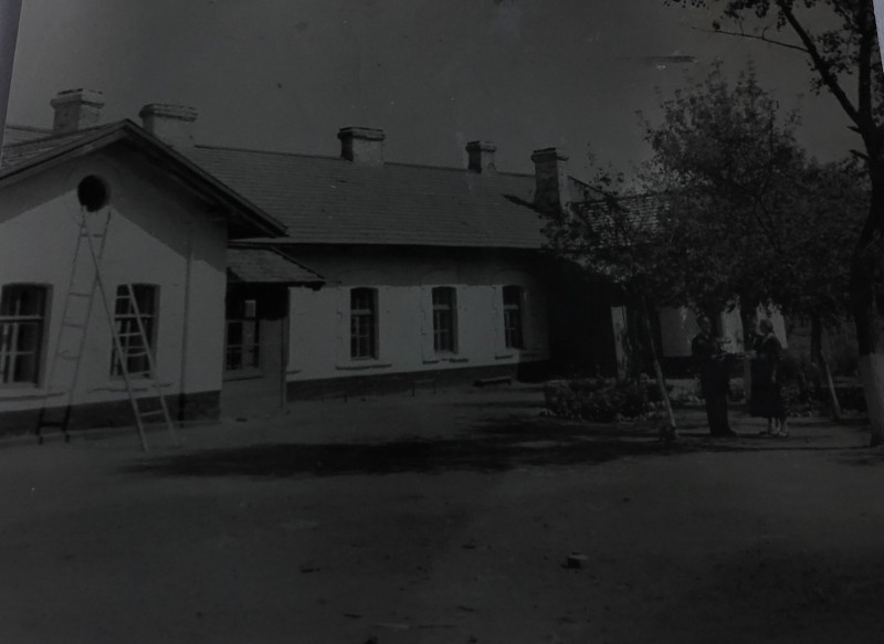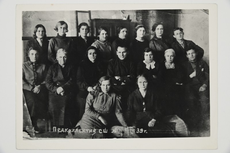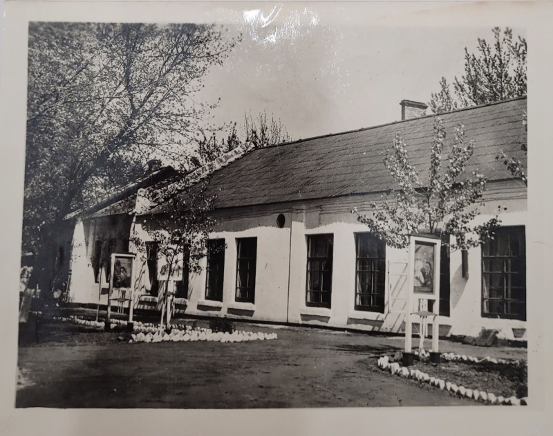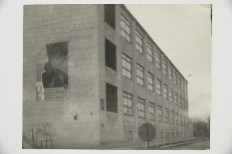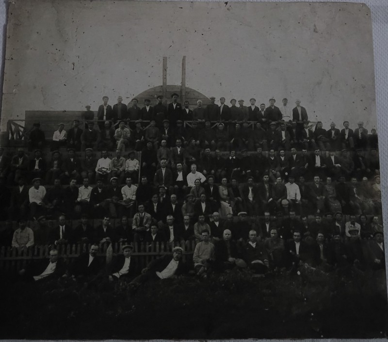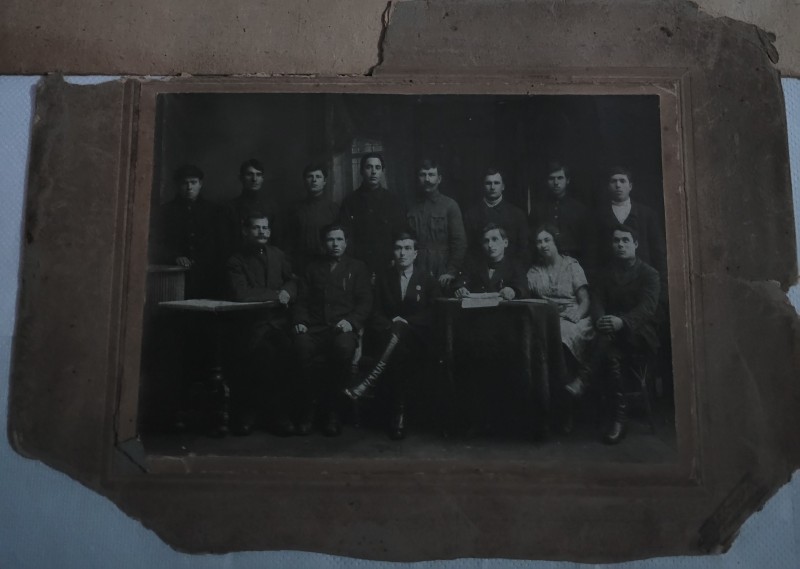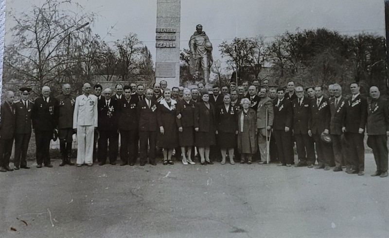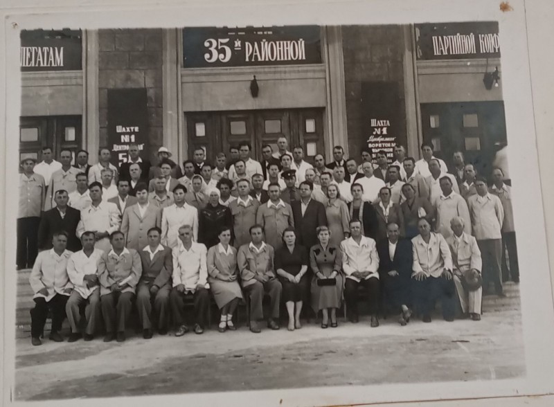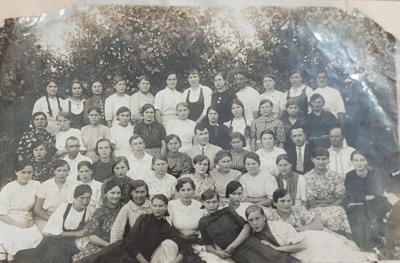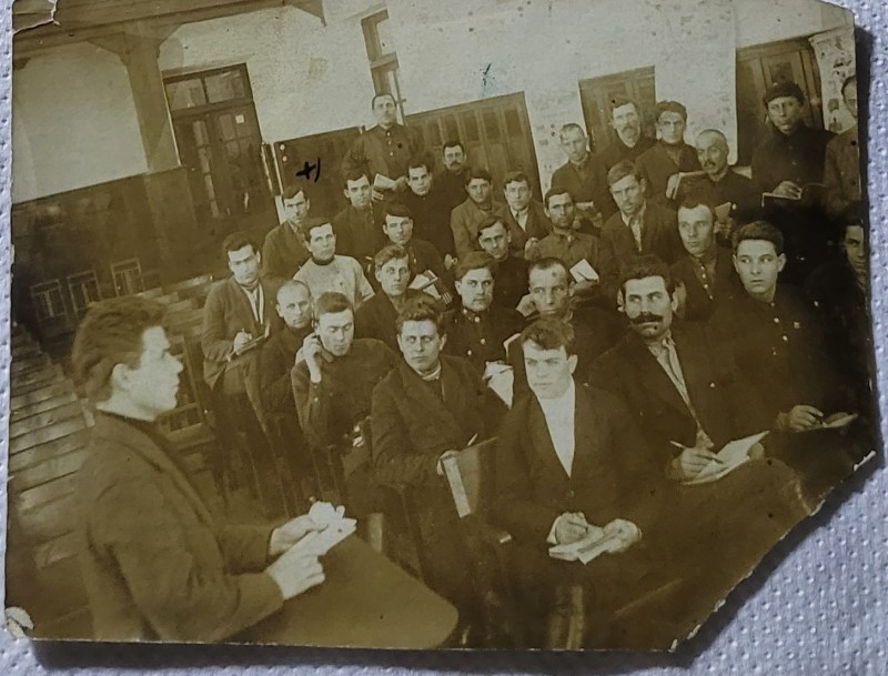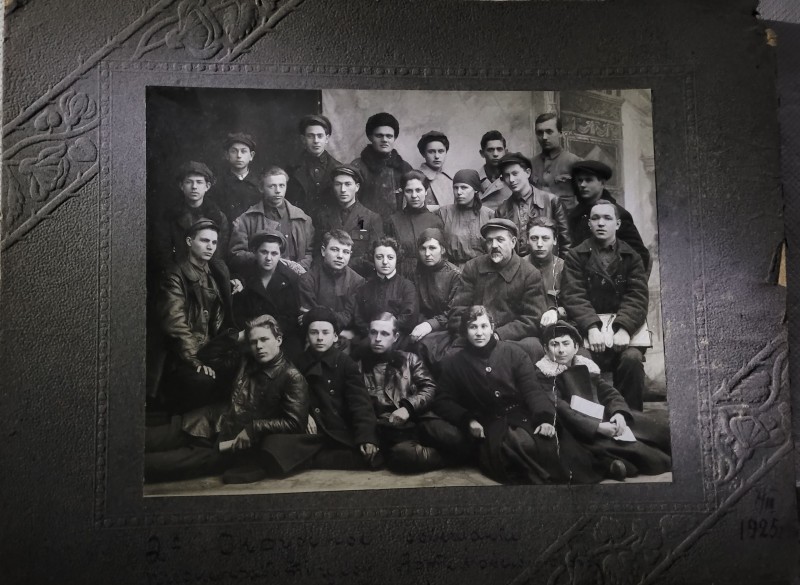 Зображення учнів та викладачів в декілька рядів. Перший ряд – хлопці напівлежачі. Праворуч чорна пляма. На з.п. фрагмент будівлі з двома вікнами. Посередині транспарант з написом білим кольором «1-е Травня».