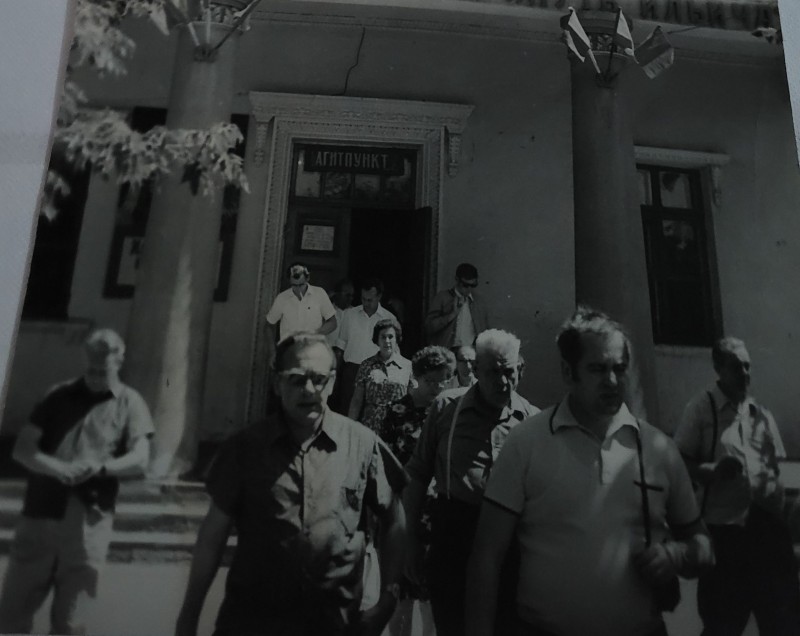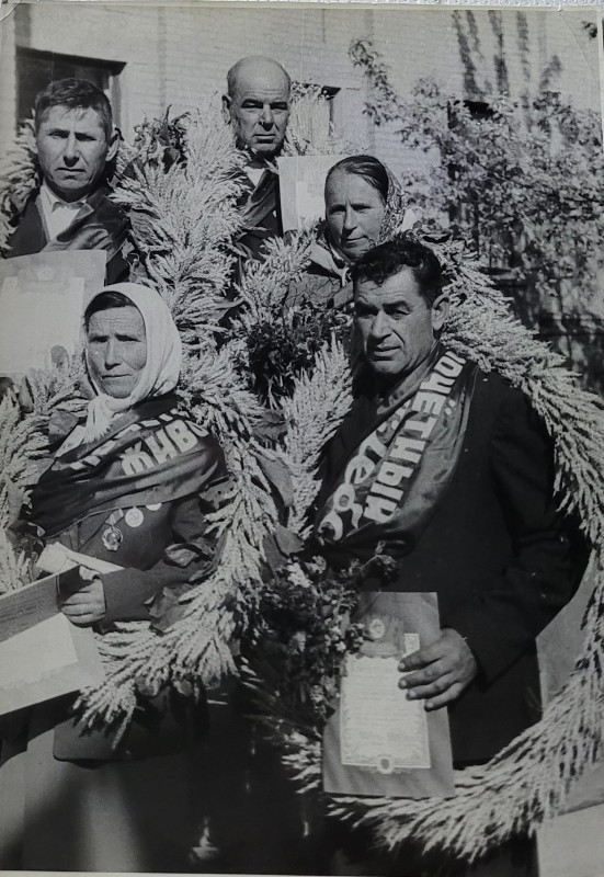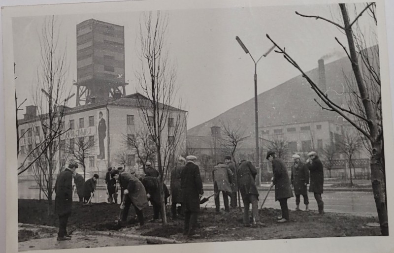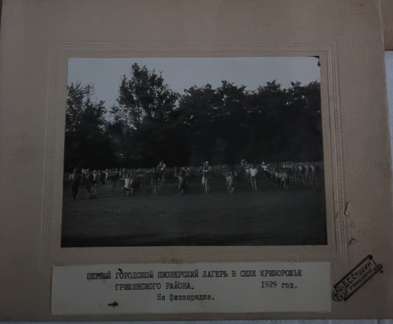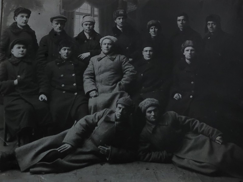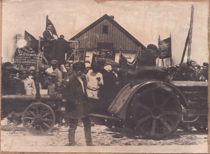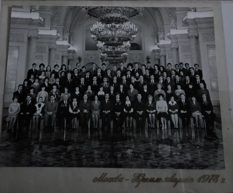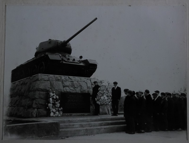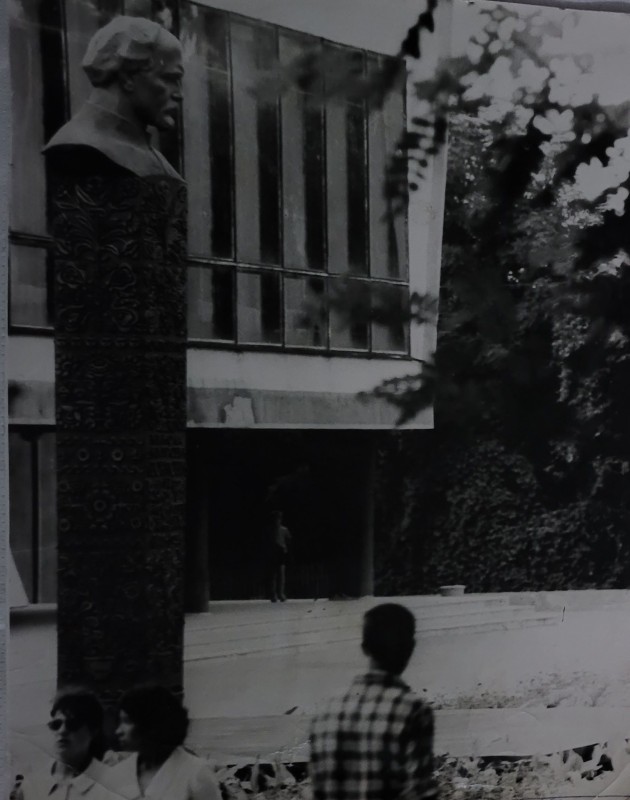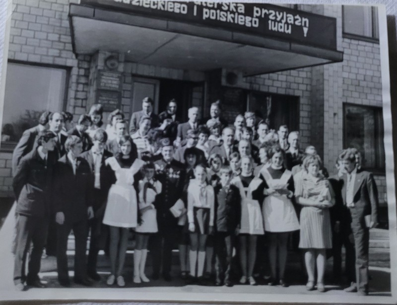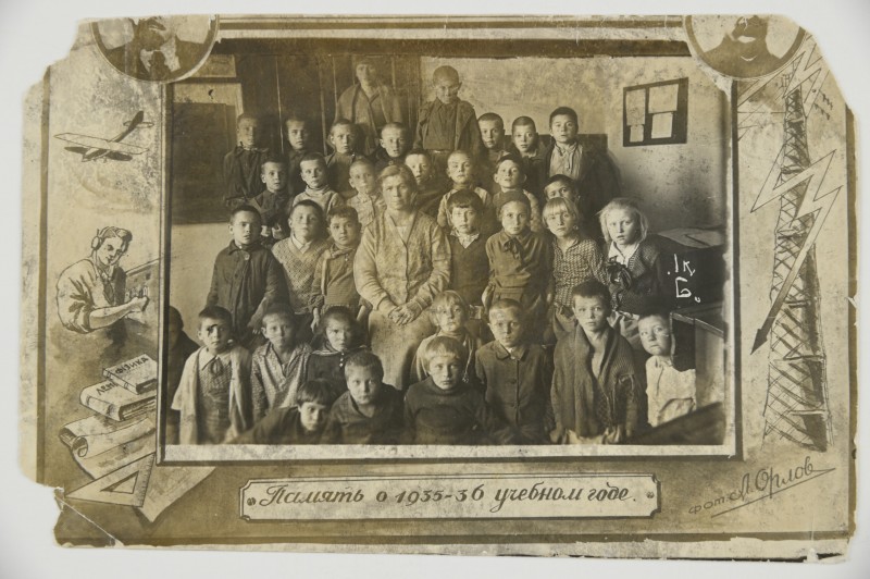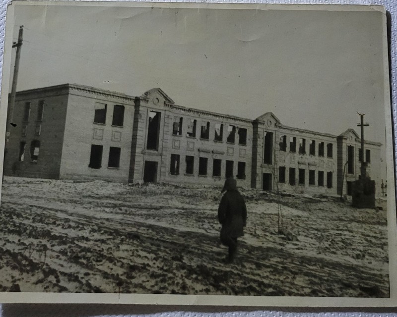 Зображення учнів та викладачів в декілька рядів. Перший ряд – хлопці напівлежачі. Праворуч чорна пляма. На з.п. фрагмент будівлі з двома вікнами. Посередині транспарант з написом білим кольором «1-е Травня».