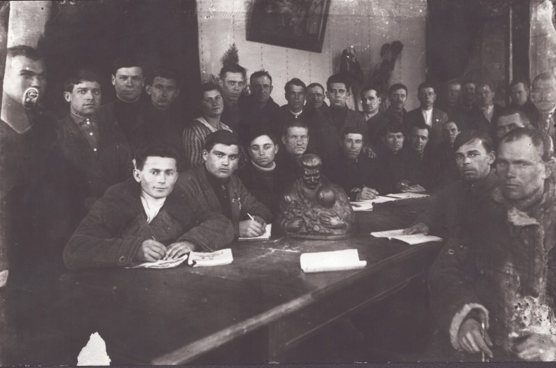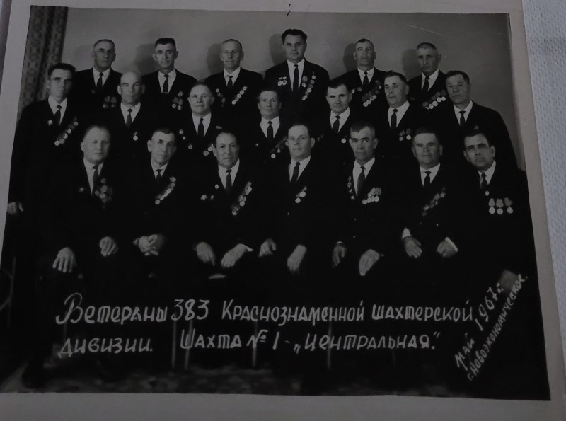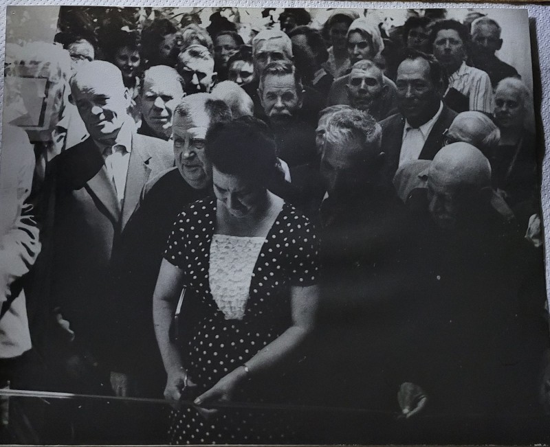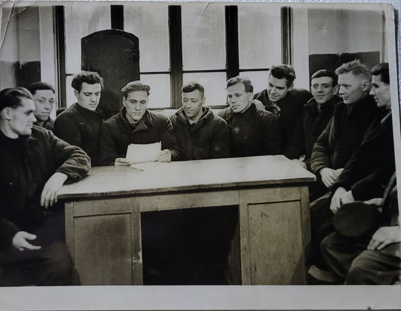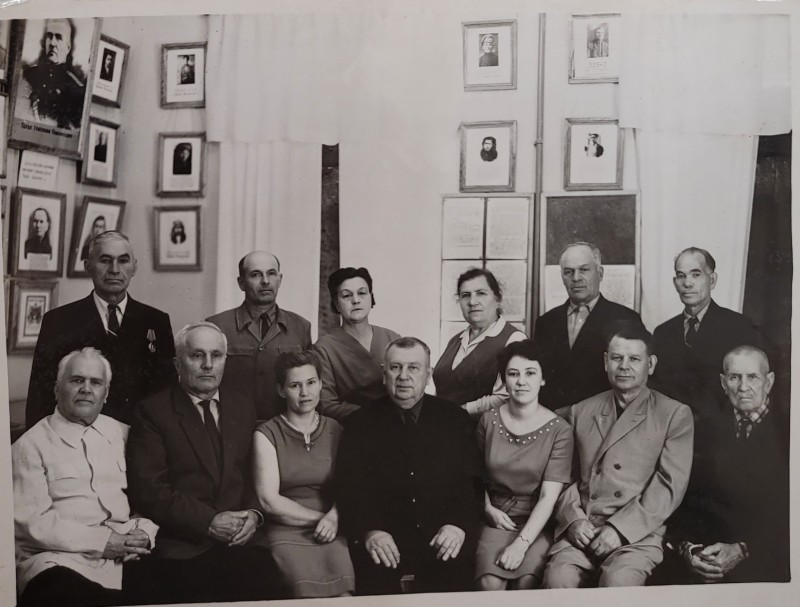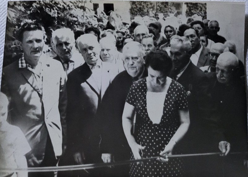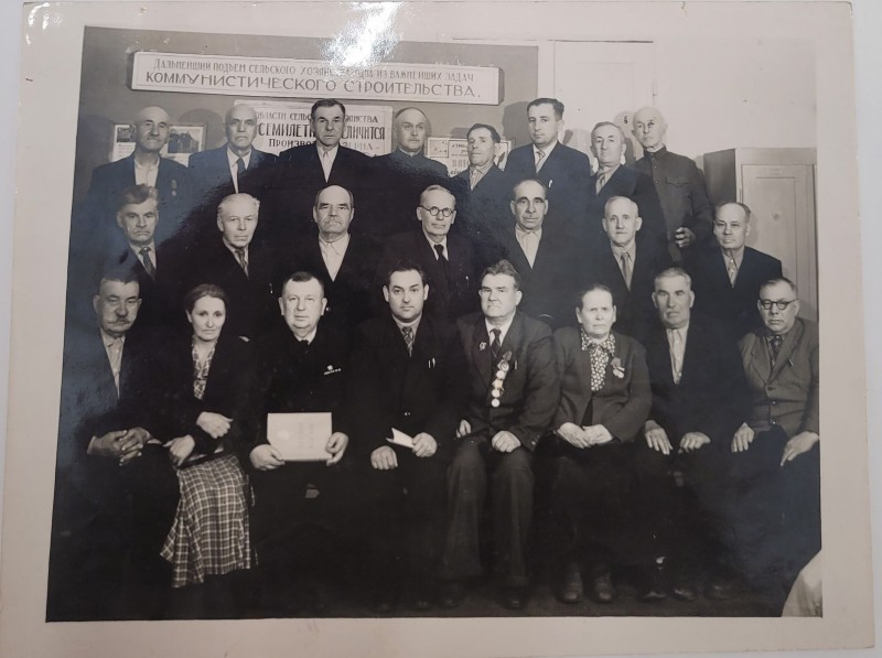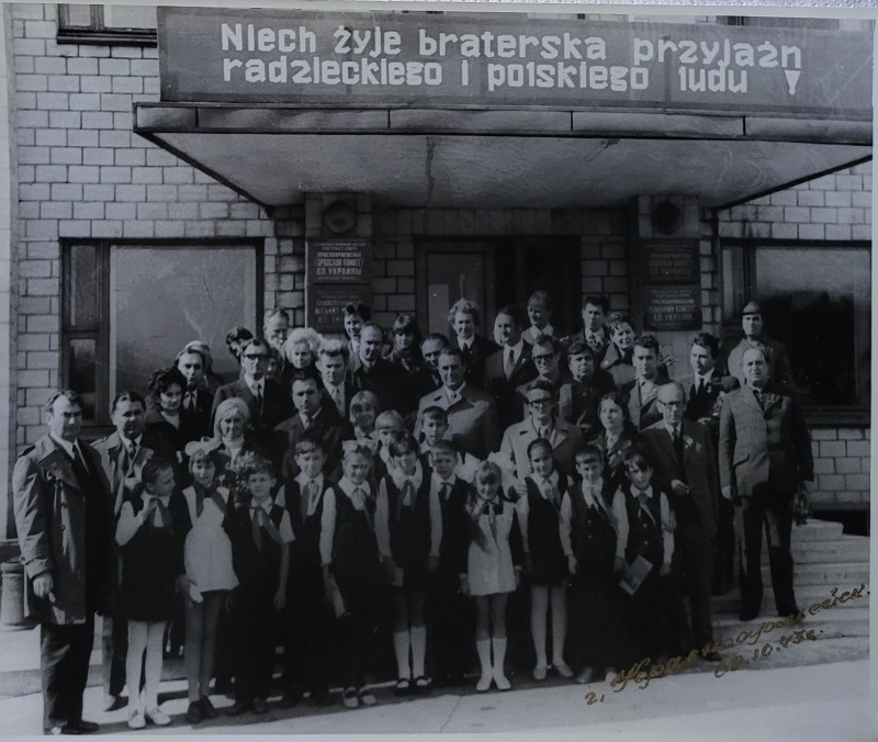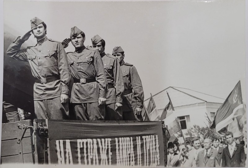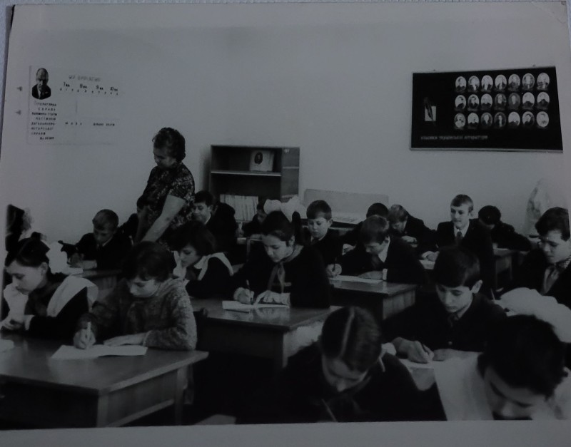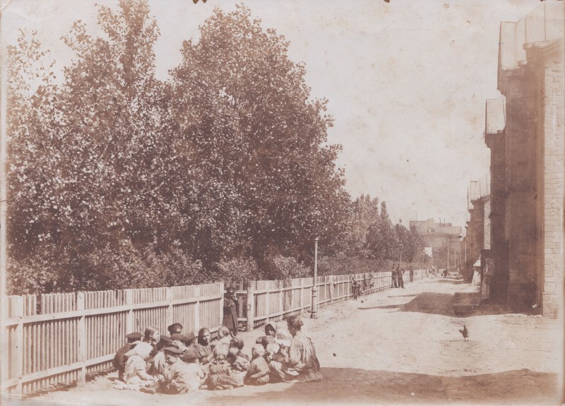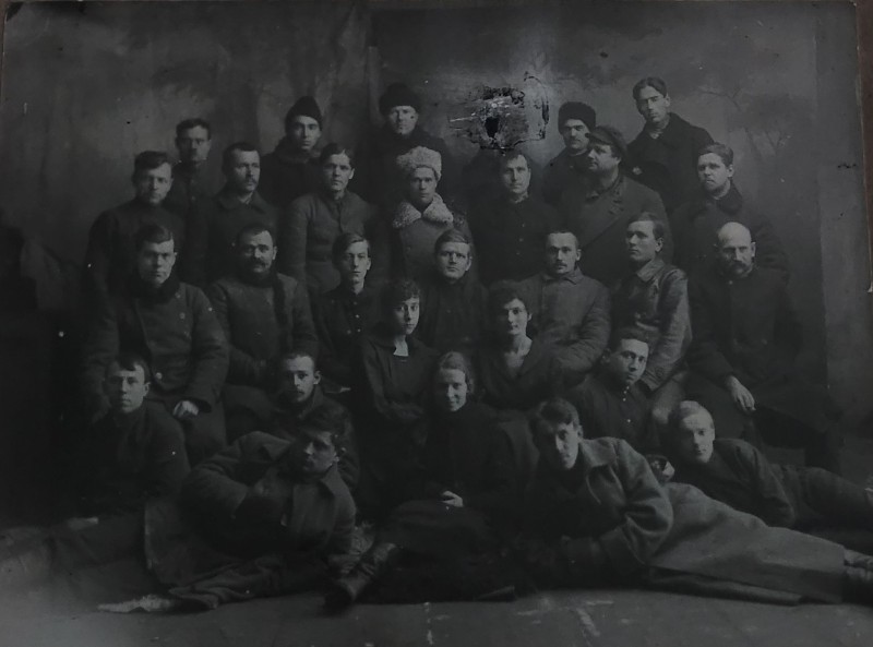 Зображення учнів та викладачів в декілька рядів. Перший ряд – хлопці напівлежачі. Праворуч чорна пляма. На з.п. фрагмент будівлі з двома вікнами. Посередині транспарант з написом білим кольором «1-е Травня».