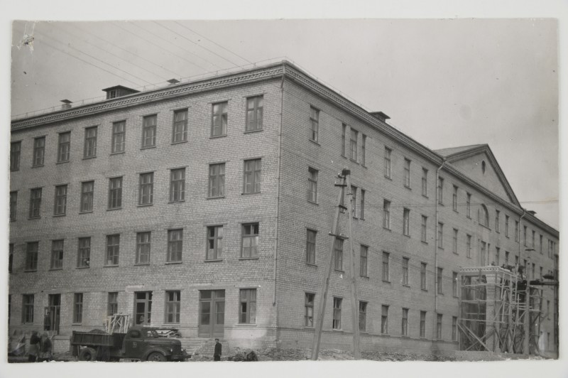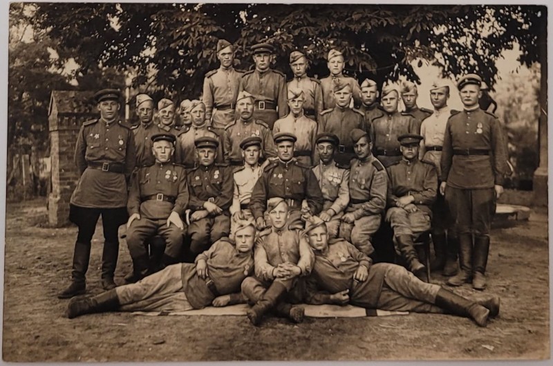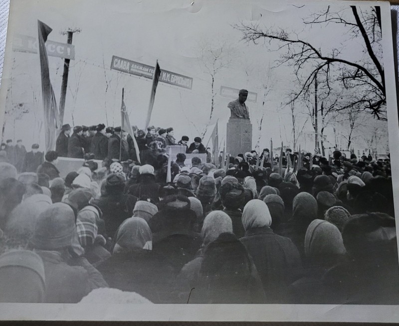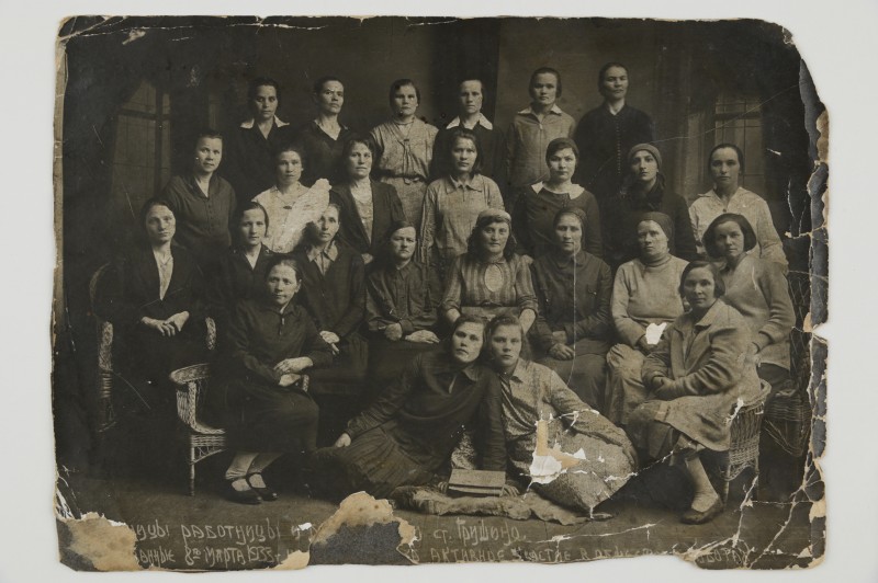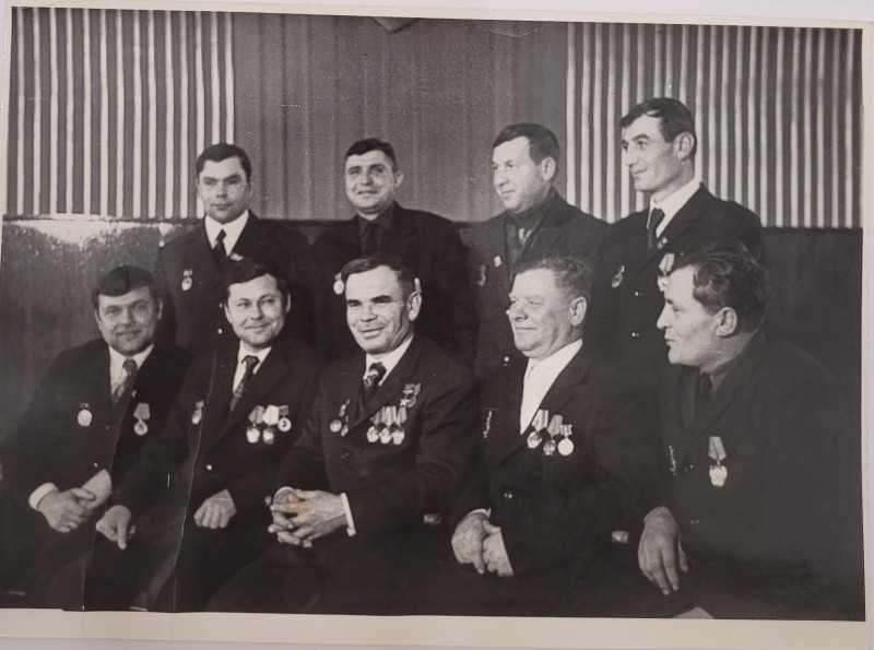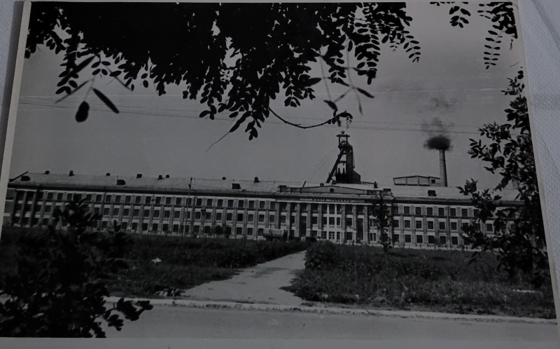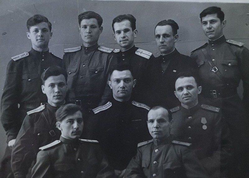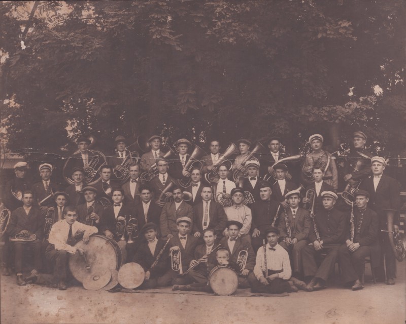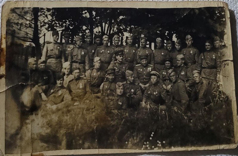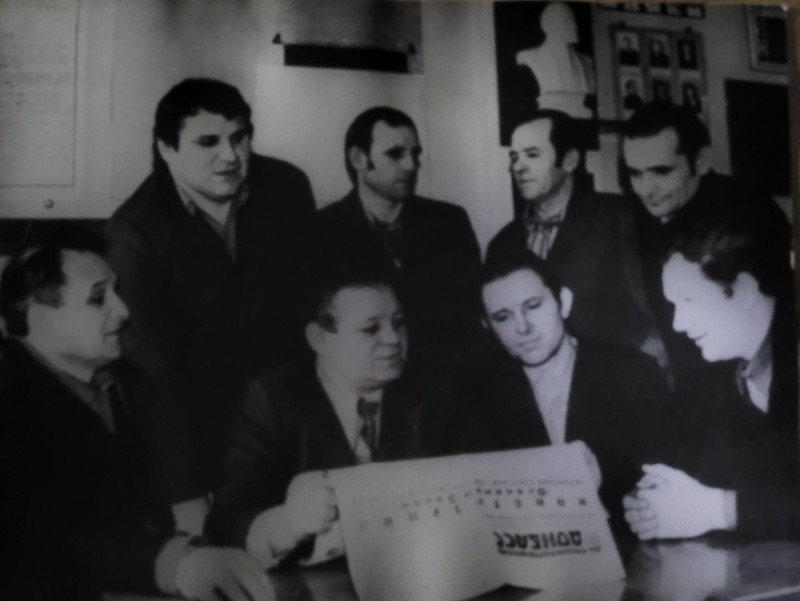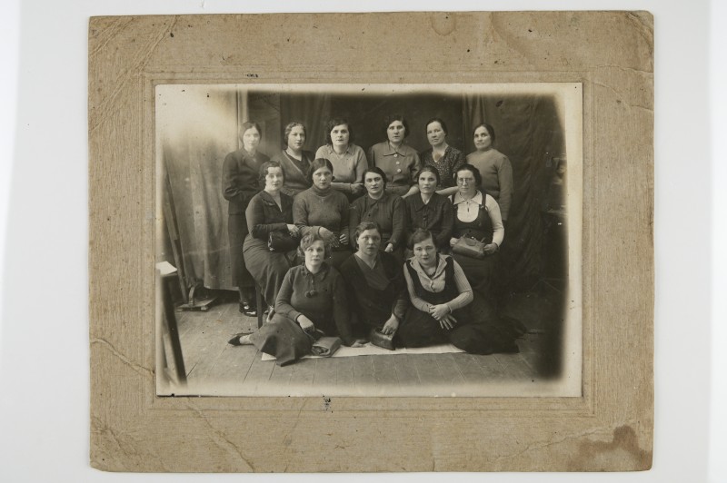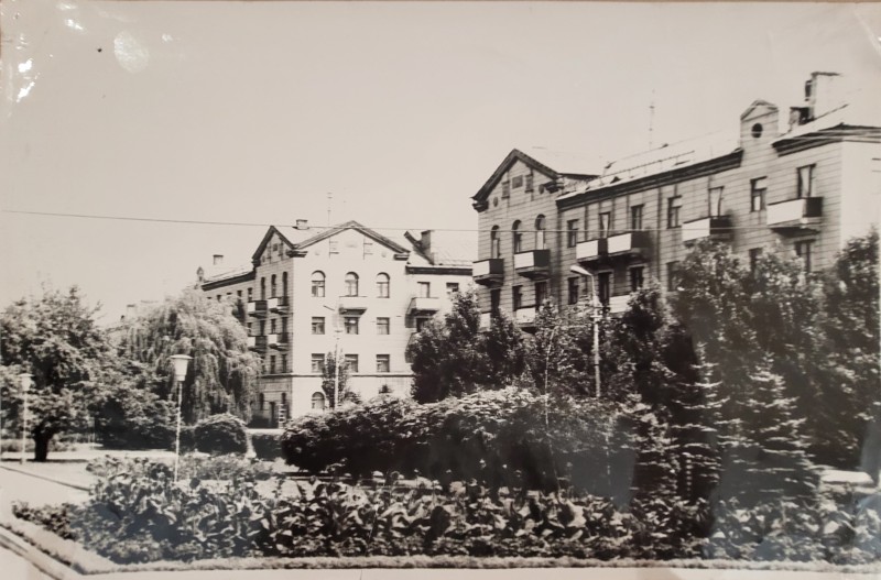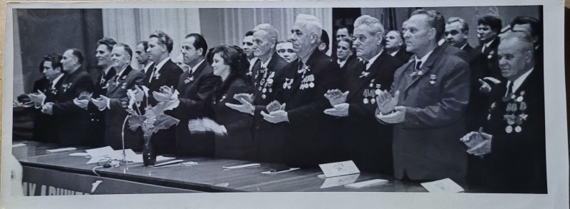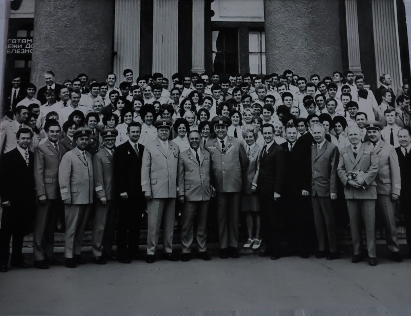 Зображення учнів та викладачів в декілька рядів. Перший ряд – хлопці напівлежачі. Праворуч чорна пляма. На з.п. фрагмент будівлі з двома вікнами. Посередині транспарант з написом білим кольором «1-е Травня».