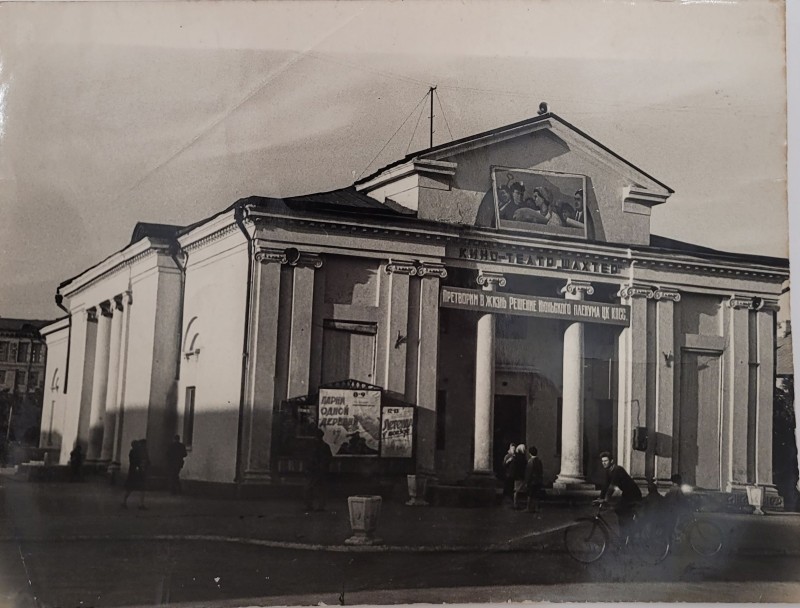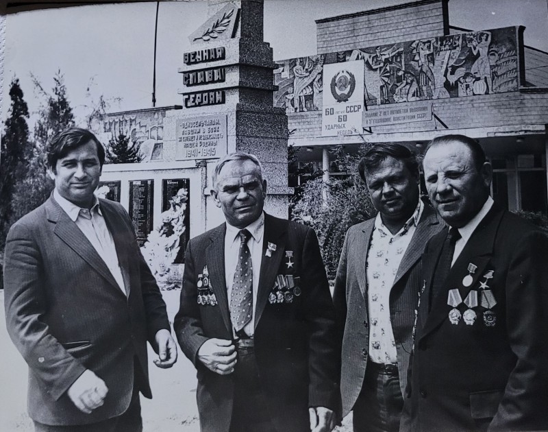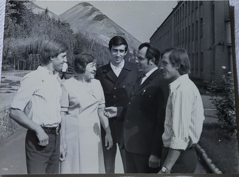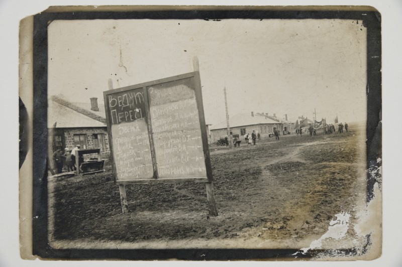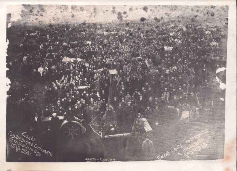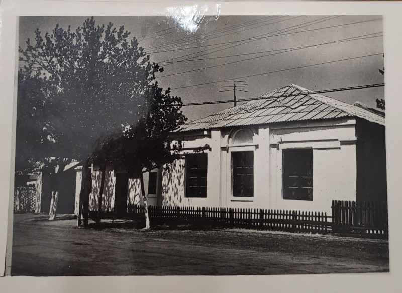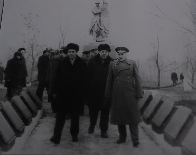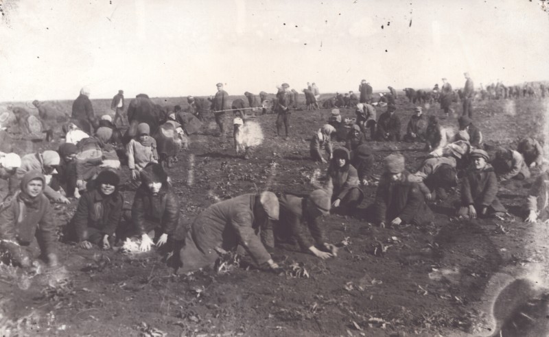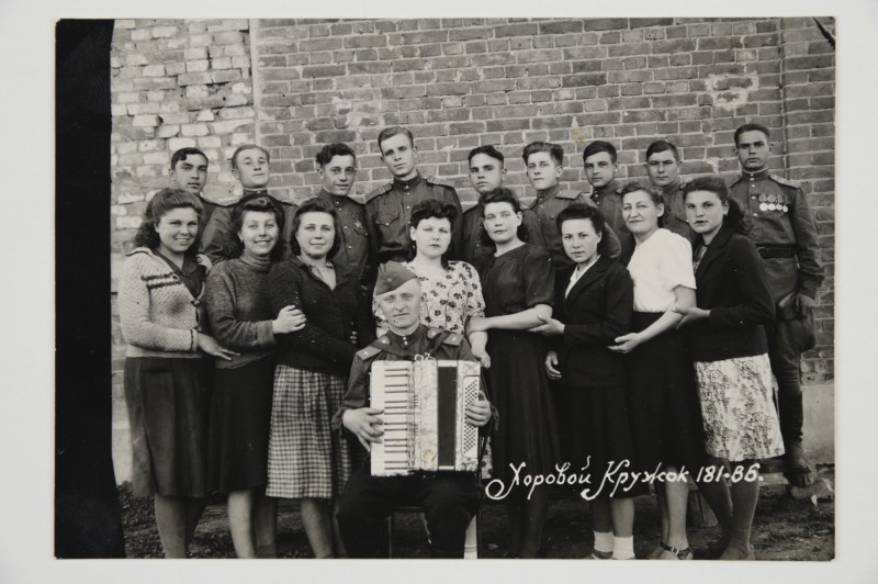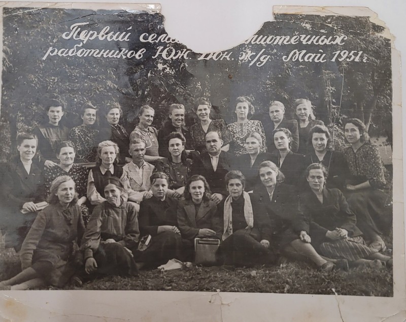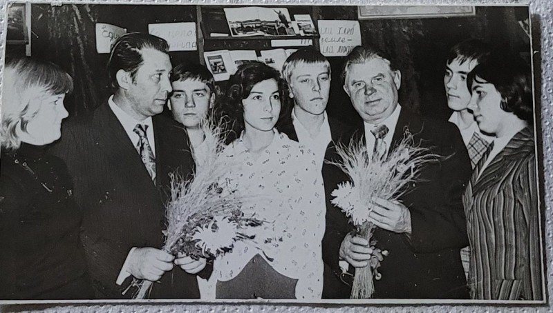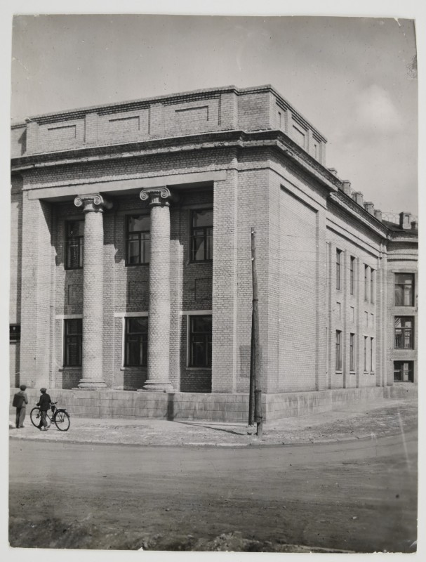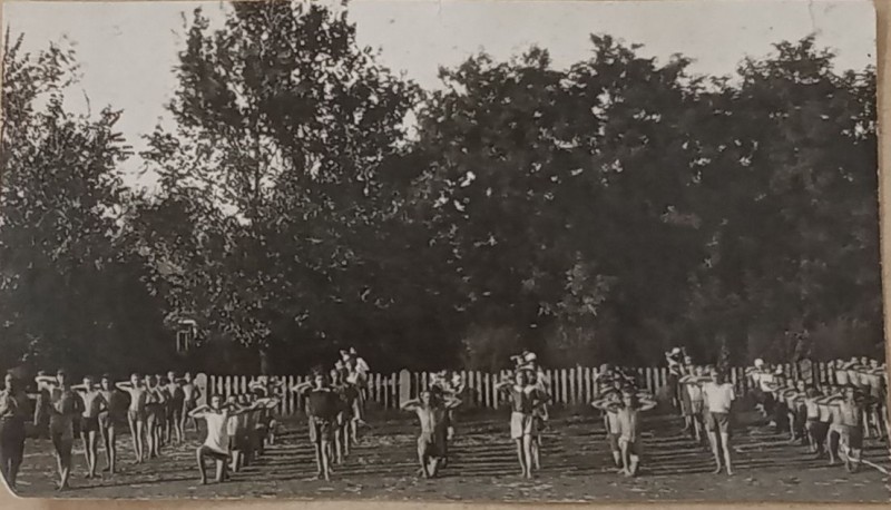 Зображення учнів та викладачів в декілька рядів. Перший ряд – хлопці напівлежачі. Праворуч чорна пляма. На з.п. фрагмент будівлі з двома вікнами. Посередині транспарант з написом білим кольором «1-е Травня».