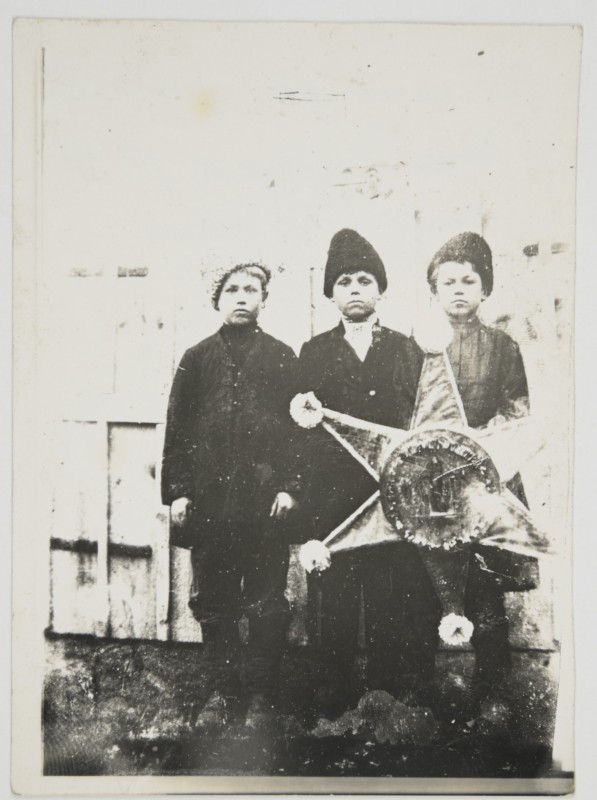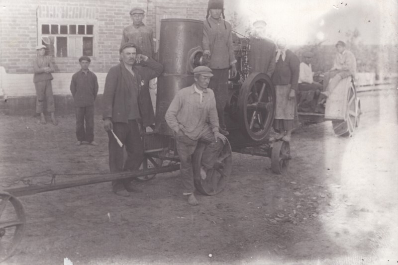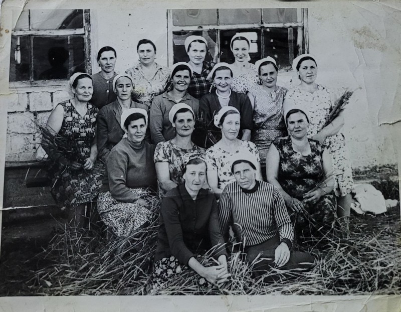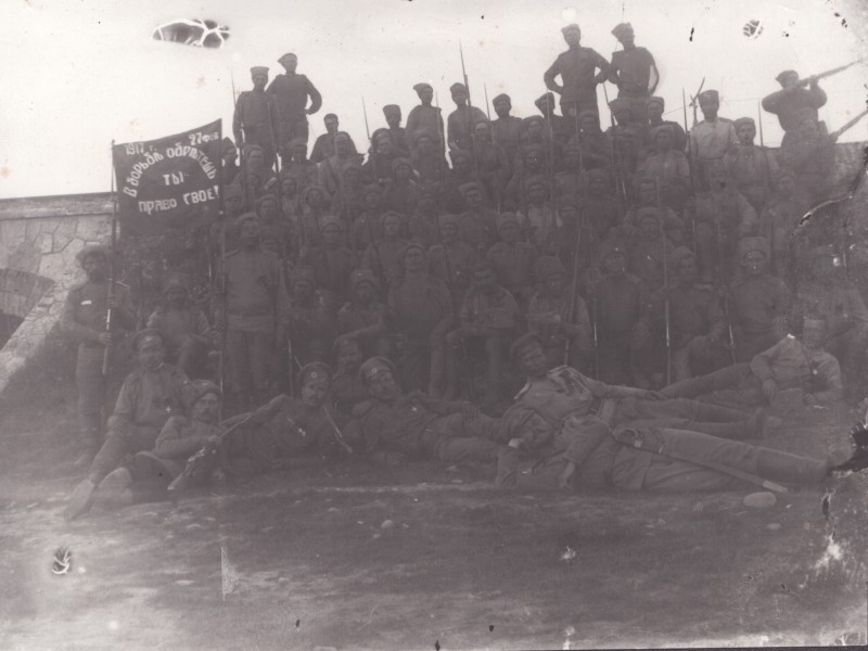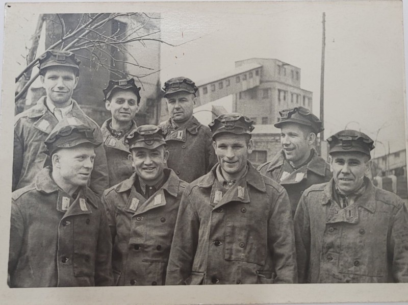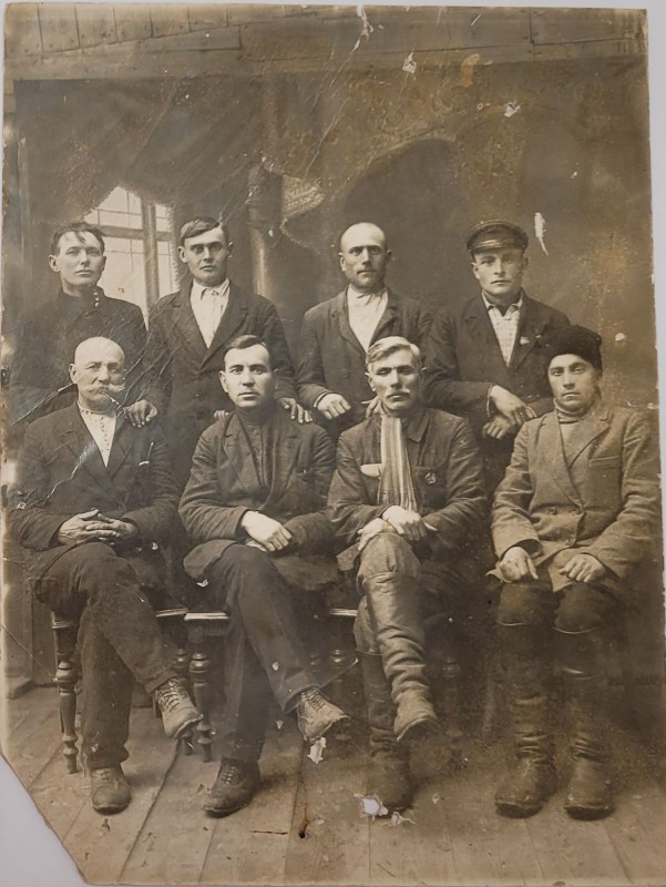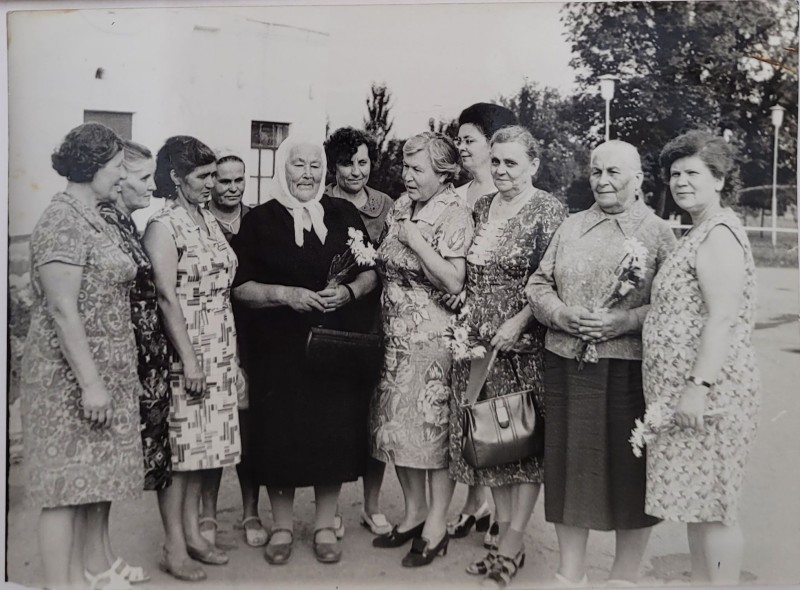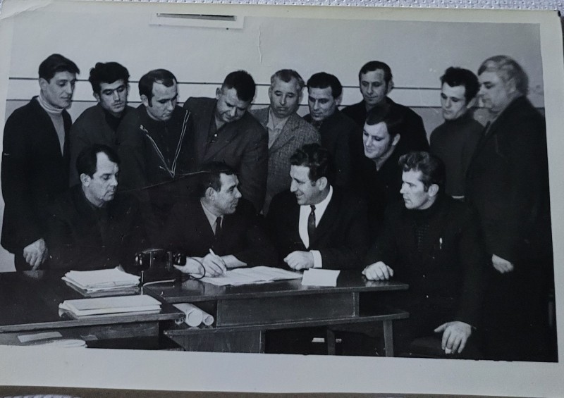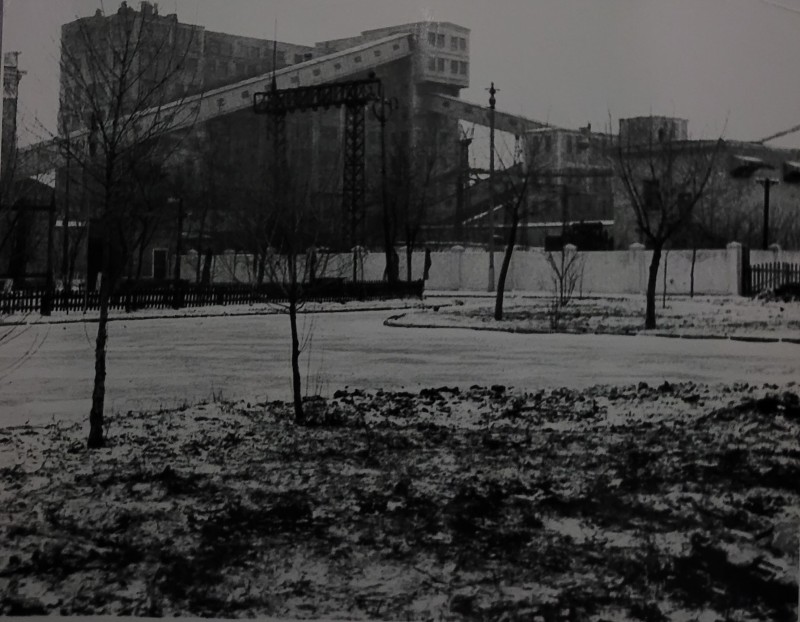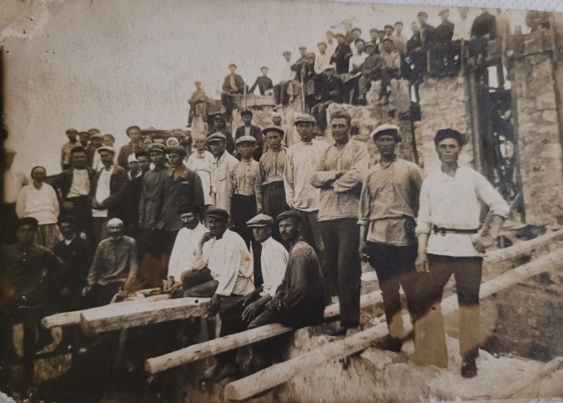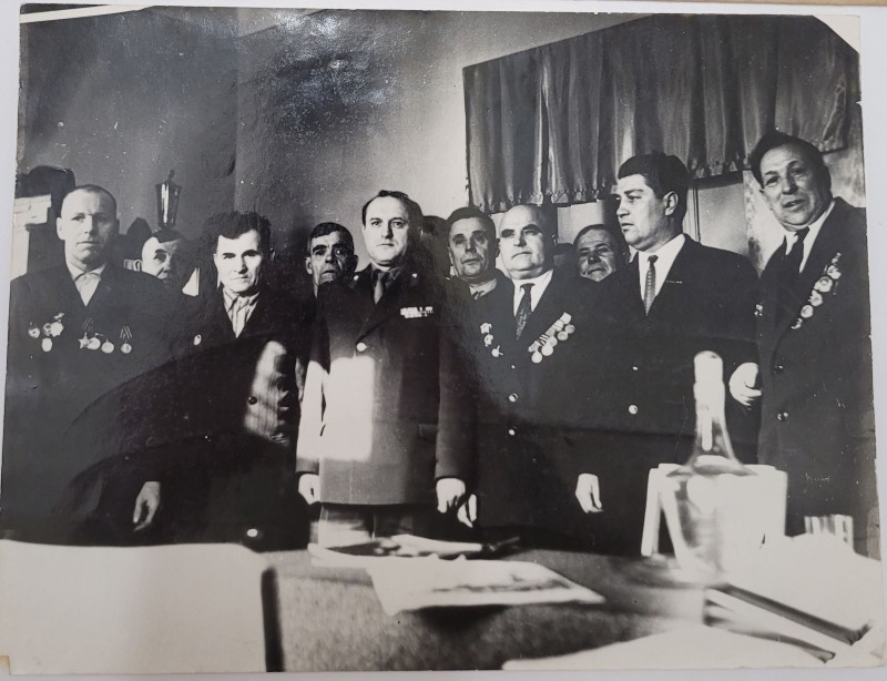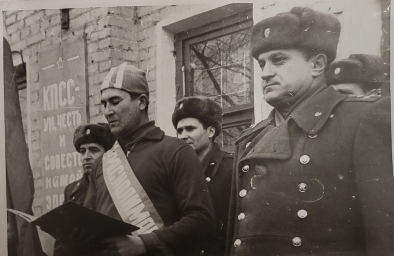 Зображення учнів та викладачів в декілька рядів. Перший ряд – хлопці напівлежачі. Праворуч чорна пляма. На з.п. фрагмент будівлі з двома вікнами. Посередині транспарант з написом білим кольором «1-е Травня».