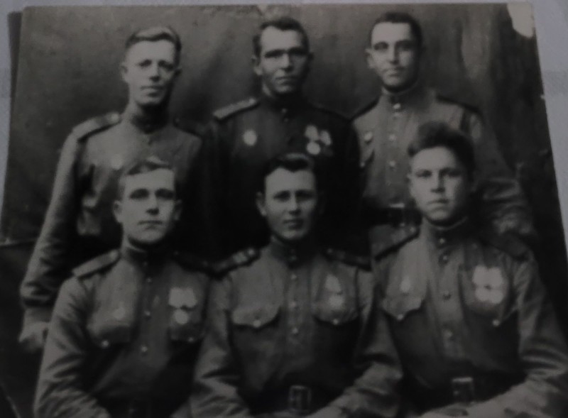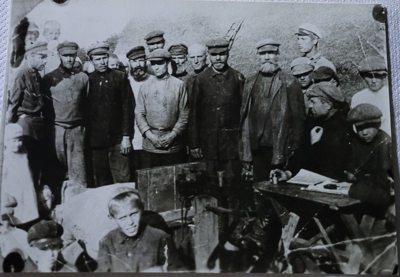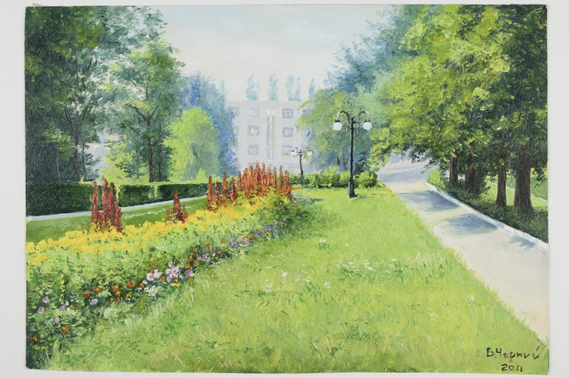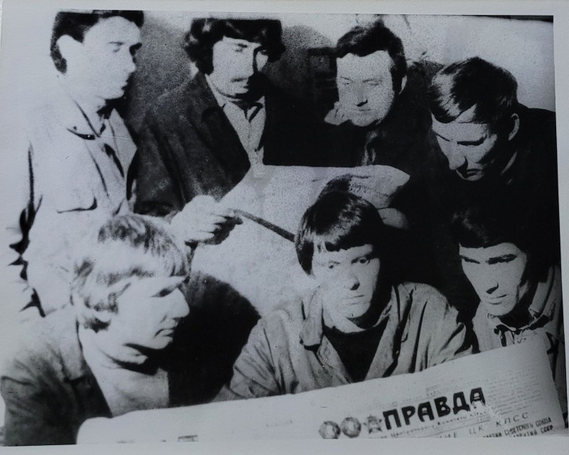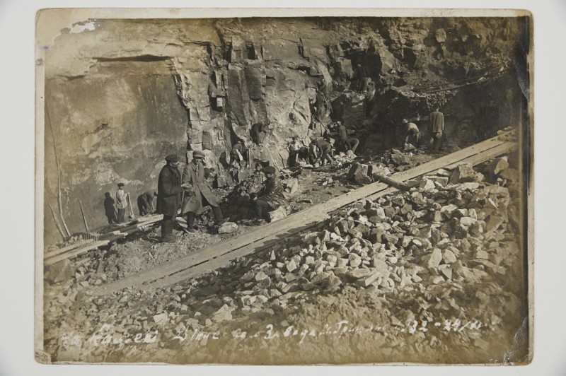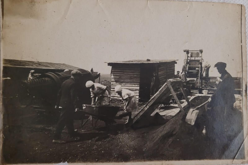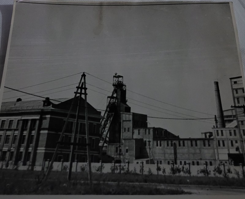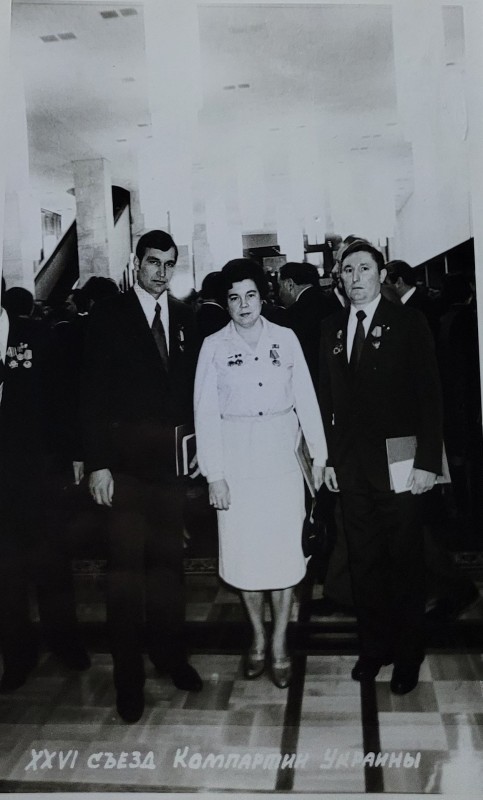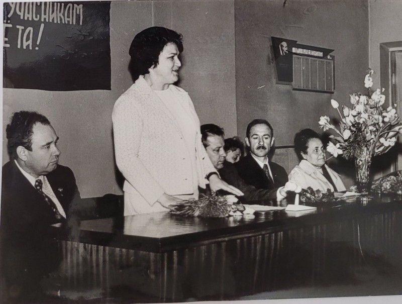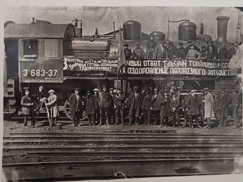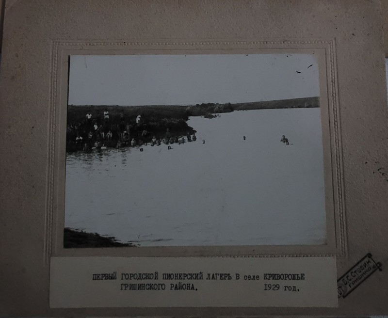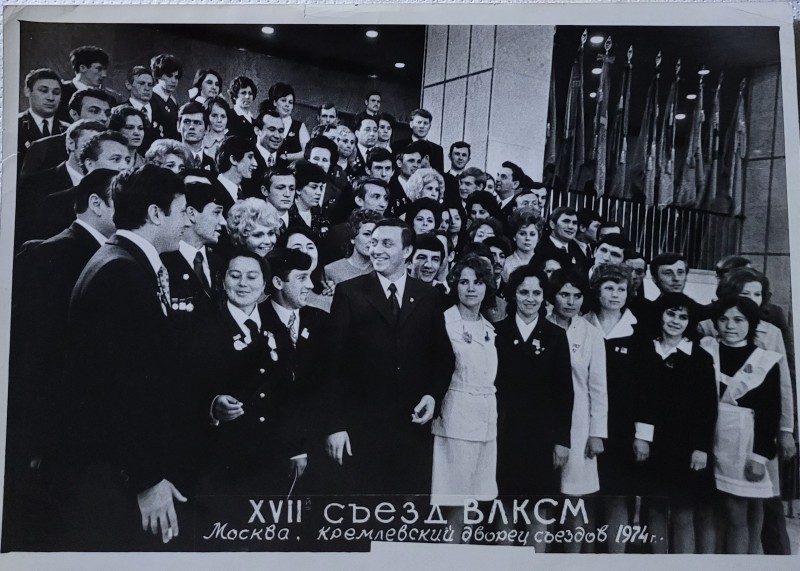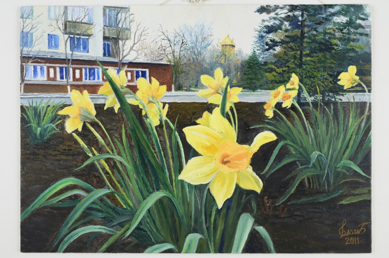 Зображення учнів та викладачів в декілька рядів. Перший ряд – хлопці напівлежачі. Праворуч чорна пляма. На з.п. фрагмент будівлі з двома вікнами. Посередині транспарант з написом білим кольором «1-е Травня».