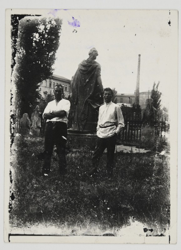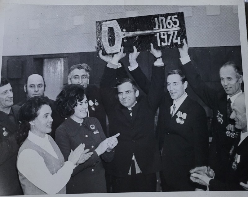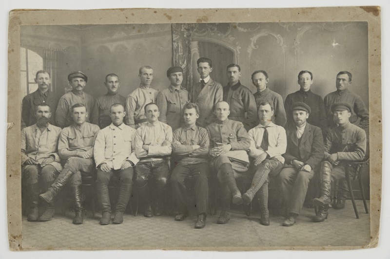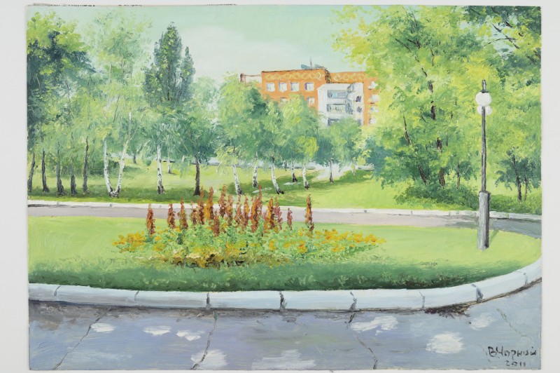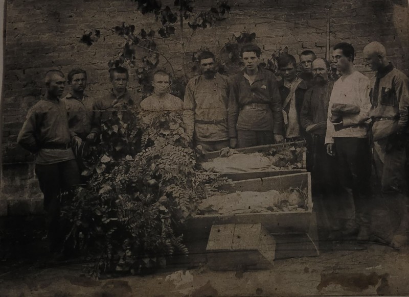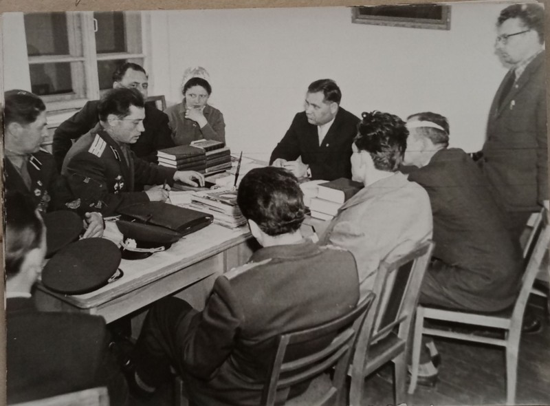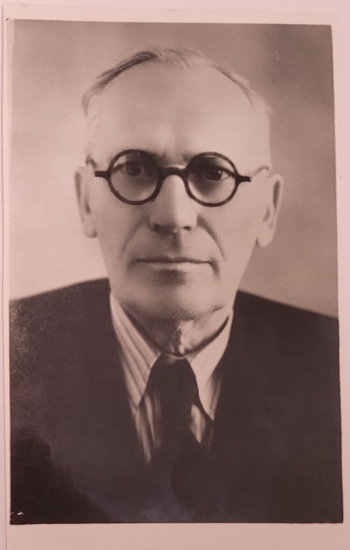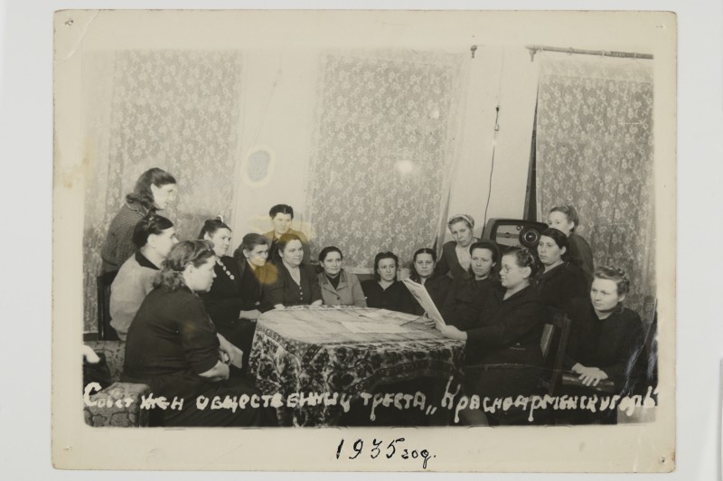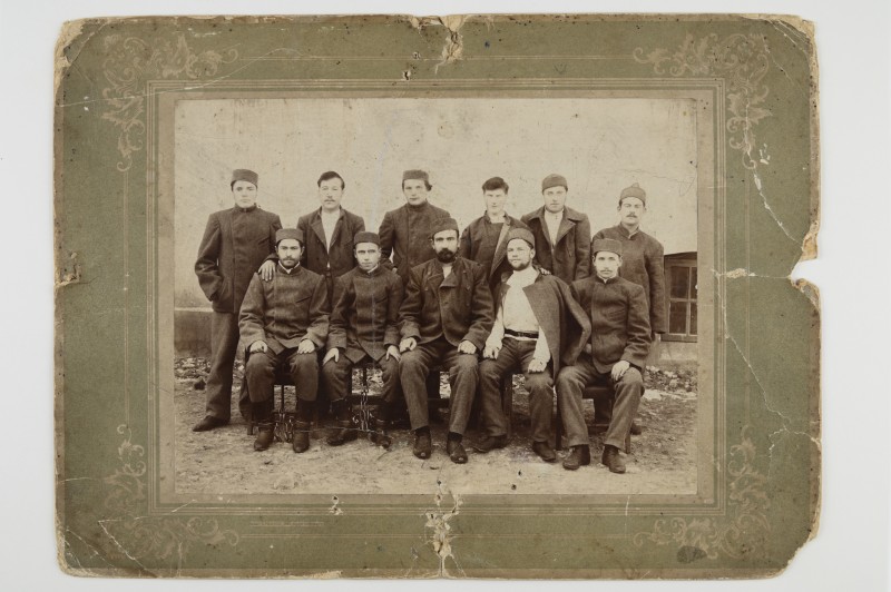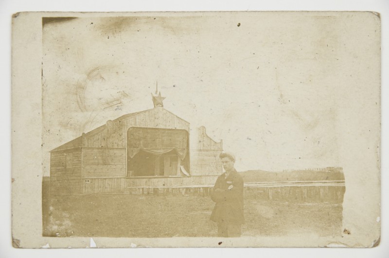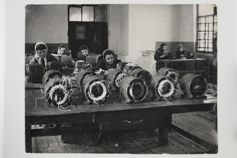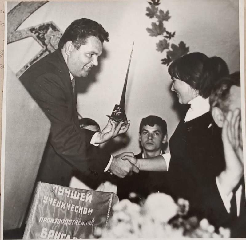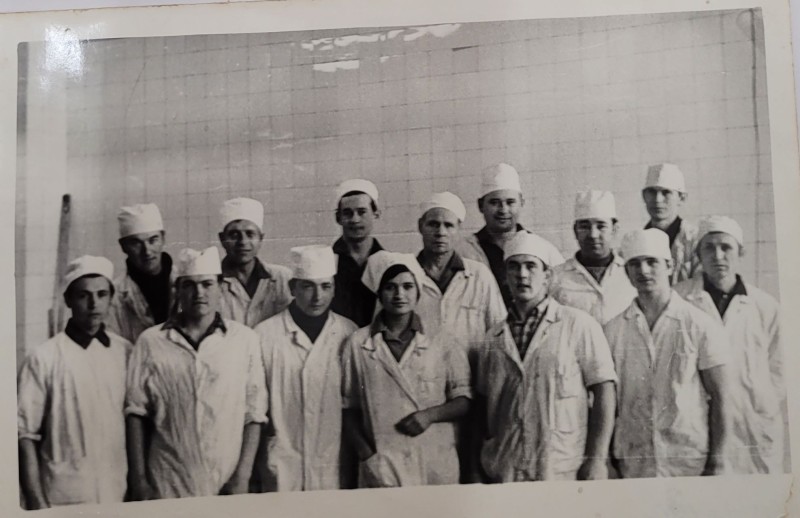 Зображення учнів та викладачів в декілька рядів. Перший ряд – хлопці напівлежачі. Праворуч чорна пляма. На з.п. фрагмент будівлі з двома вікнами. Посередині транспарант з написом білим кольором «1-е Травня».