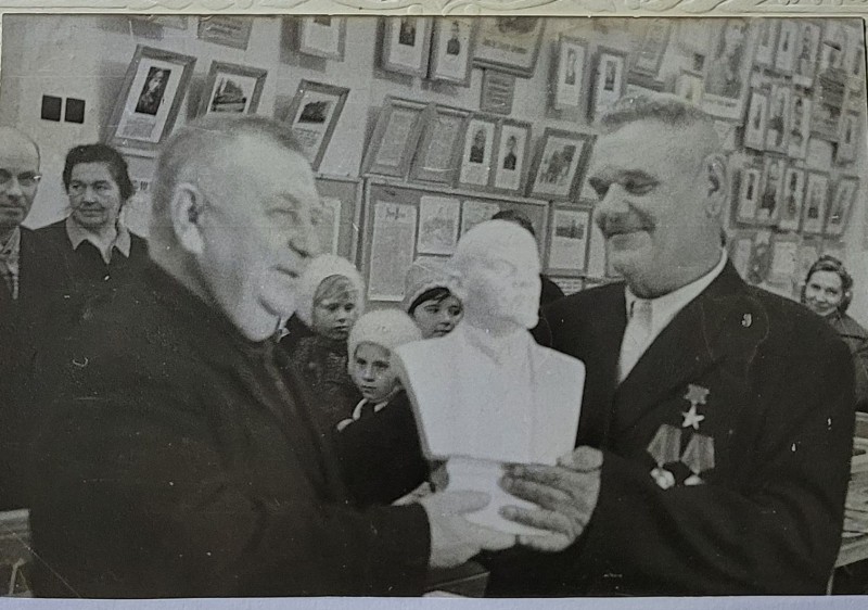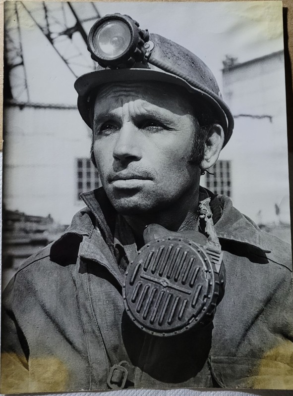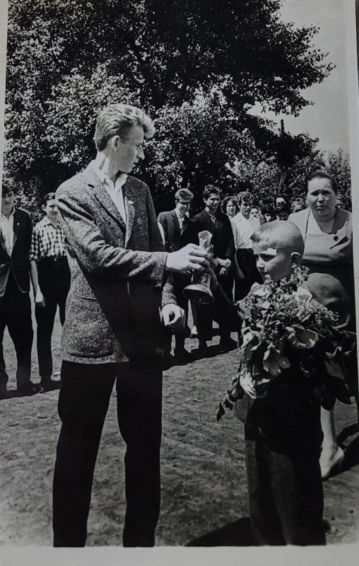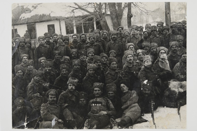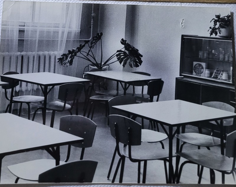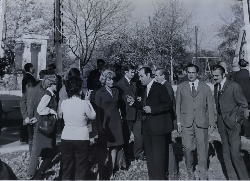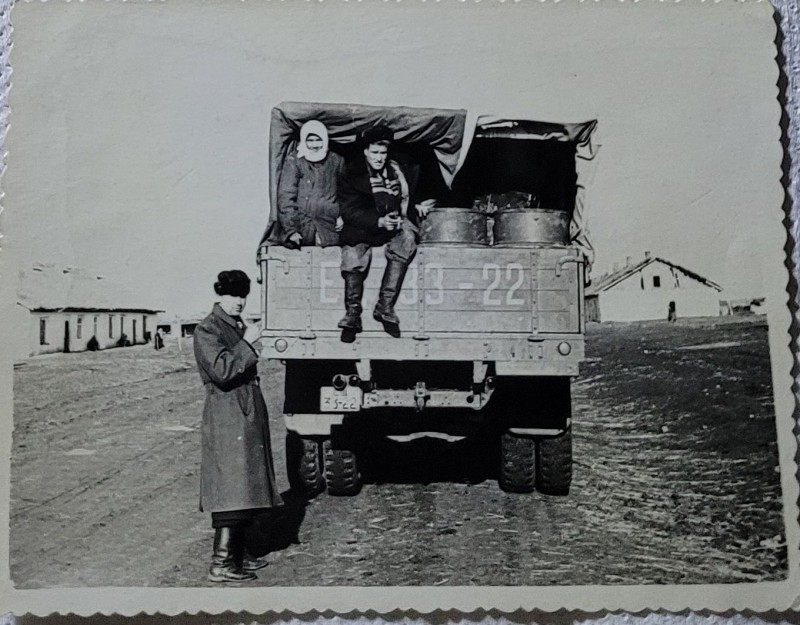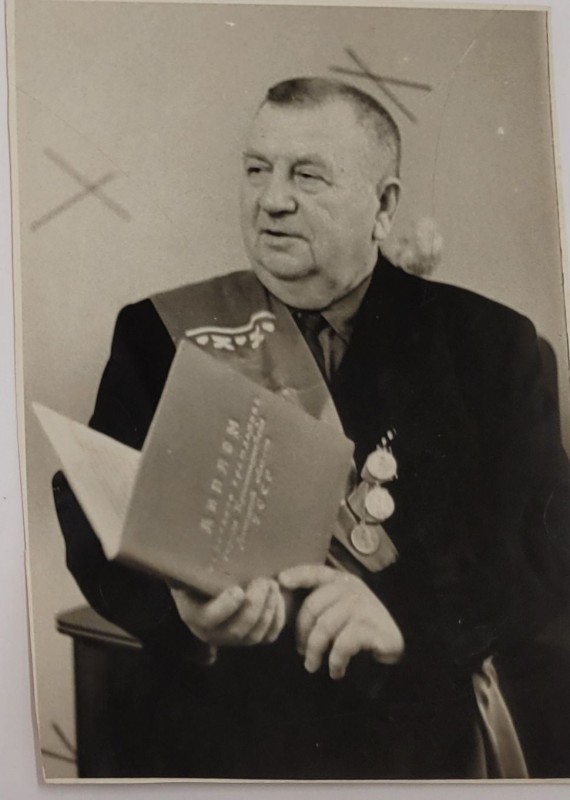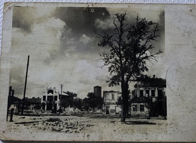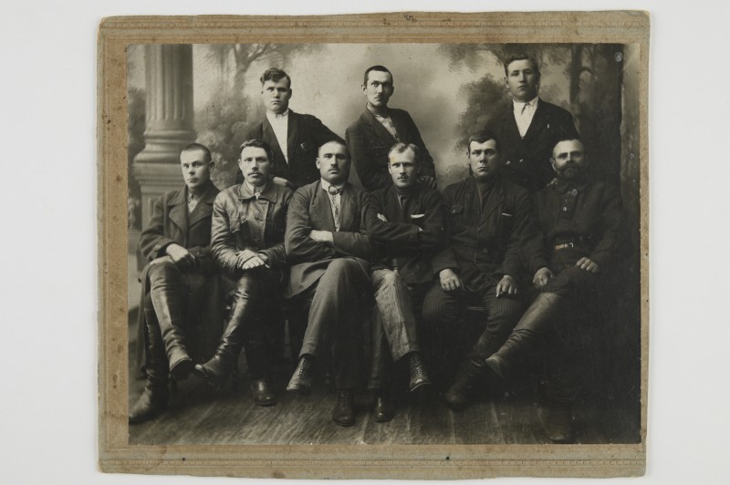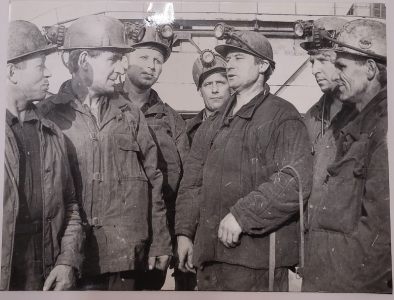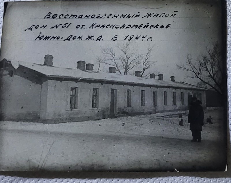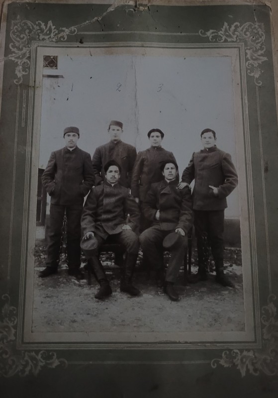 Зображення учнів та викладачів в декілька рядів. Перший ряд – хлопці напівлежачі. Праворуч чорна пляма. На з.п. фрагмент будівлі з двома вікнами. Посередині транспарант з написом білим кольором «1-е Травня».