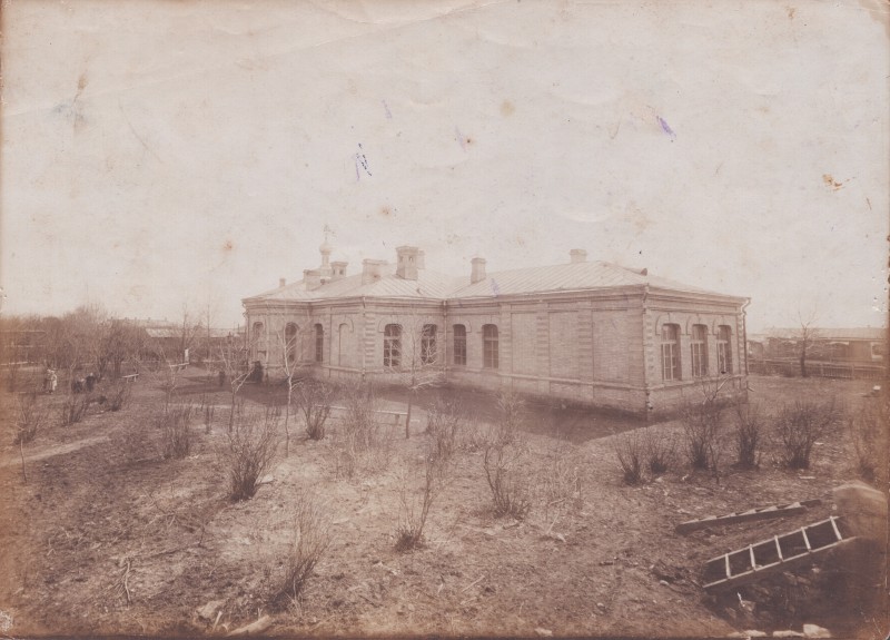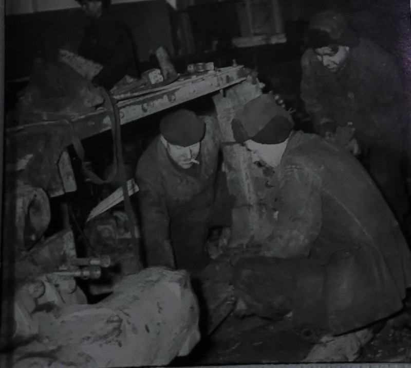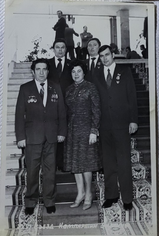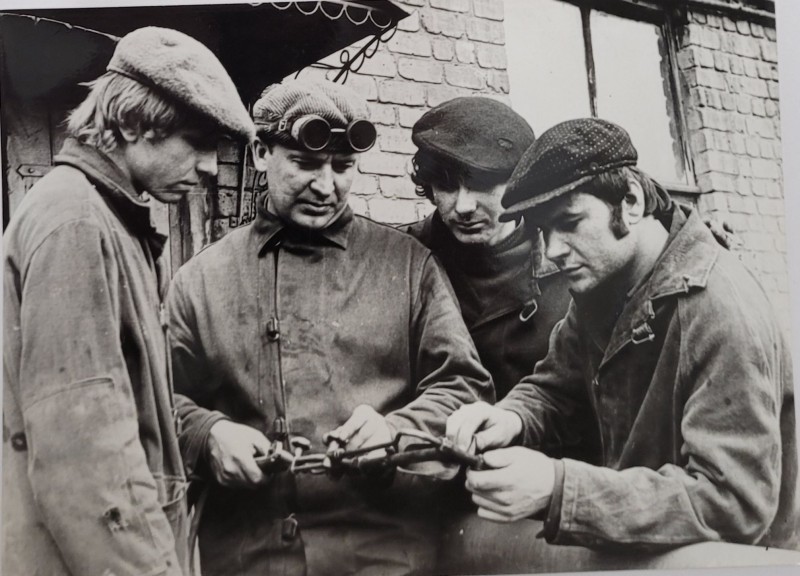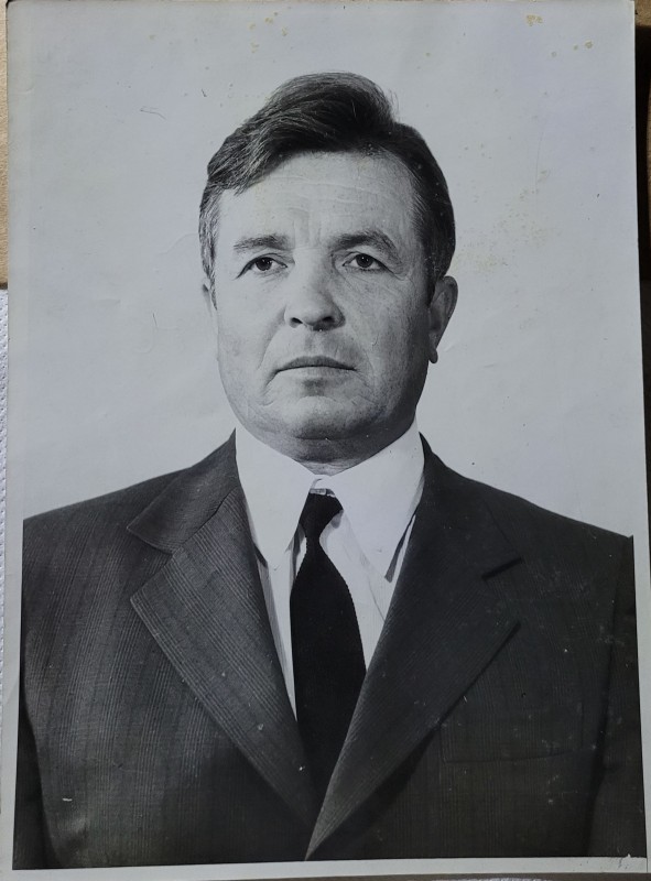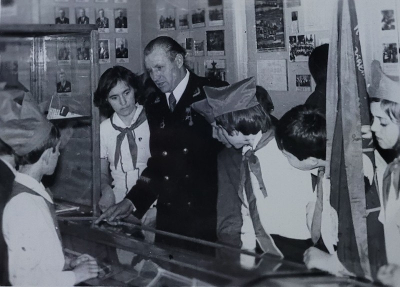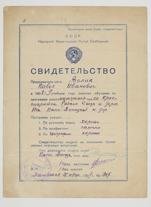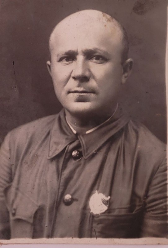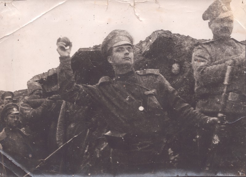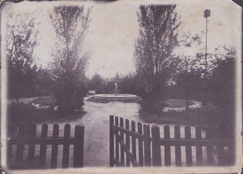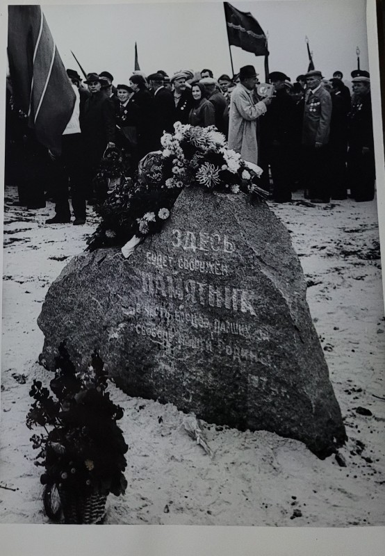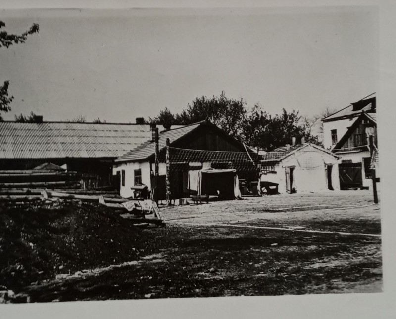 Зображення учнів та викладачів в декілька рядів. Перший ряд – хлопці напівлежачі. Праворуч чорна пляма. На з.п. фрагмент будівлі з двома вікнами. Посередині транспарант з написом білим кольором «1-е Травня».
