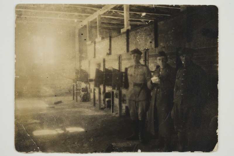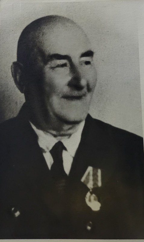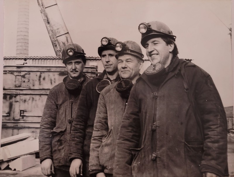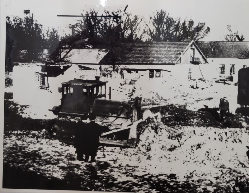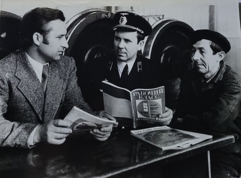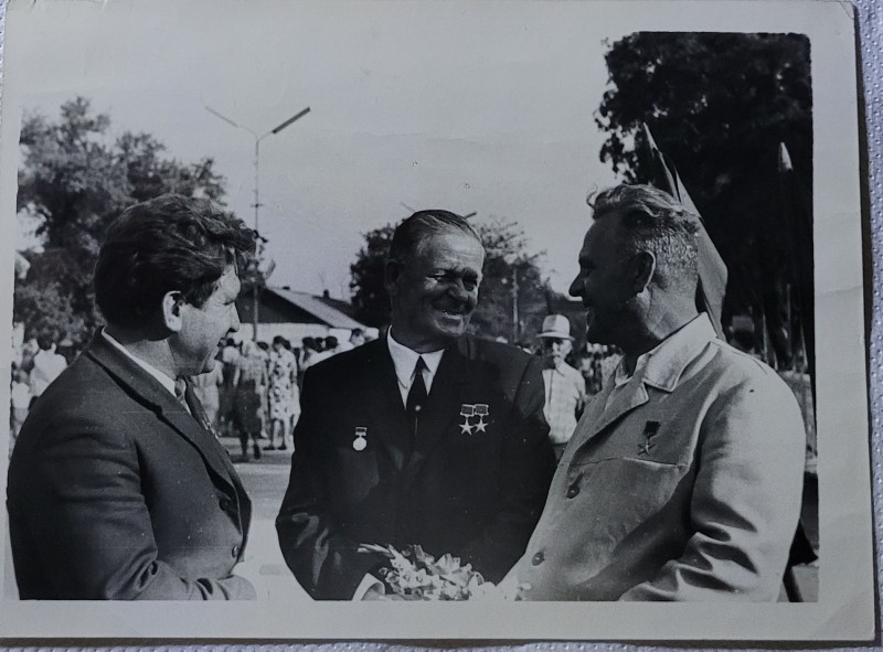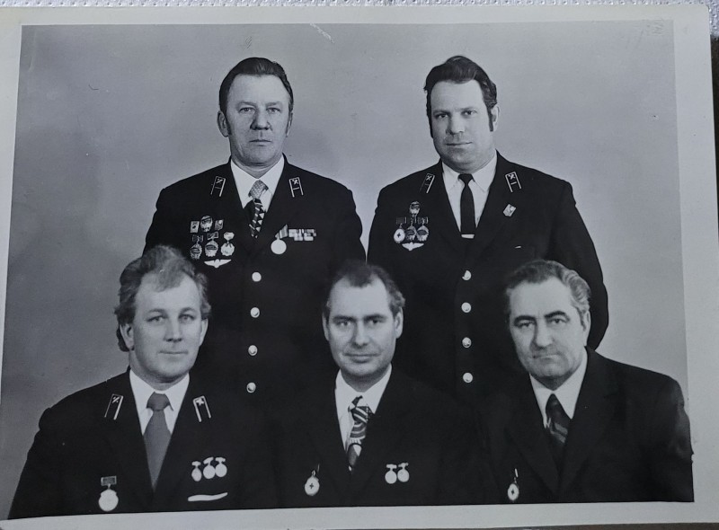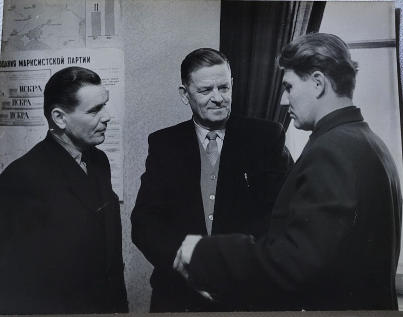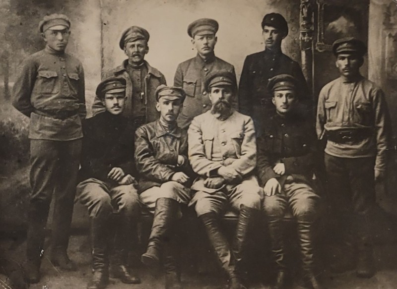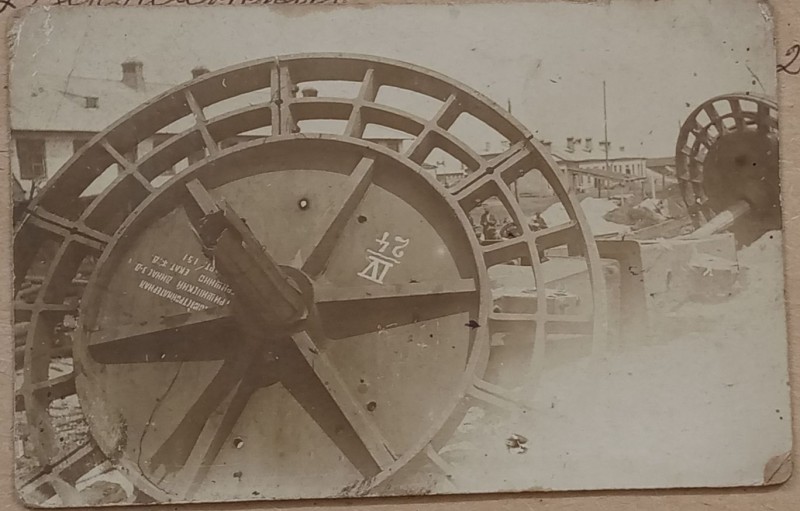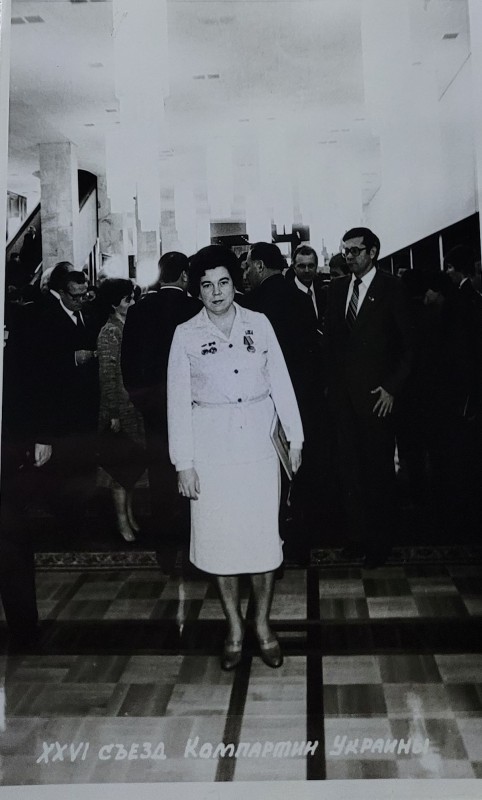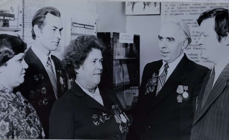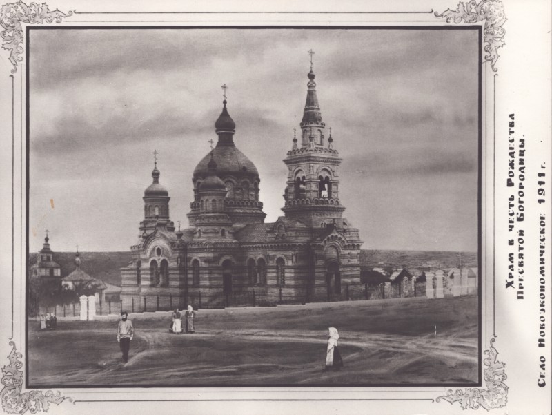 Зображення учнів та викладачів в декілька рядів. Перший ряд – хлопці напівлежачі. Праворуч чорна пляма. На з.п. фрагмент будівлі з двома вікнами. Посередині транспарант з написом білим кольором «1-е Травня».