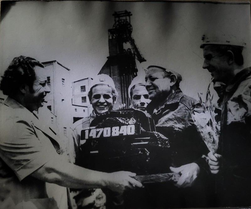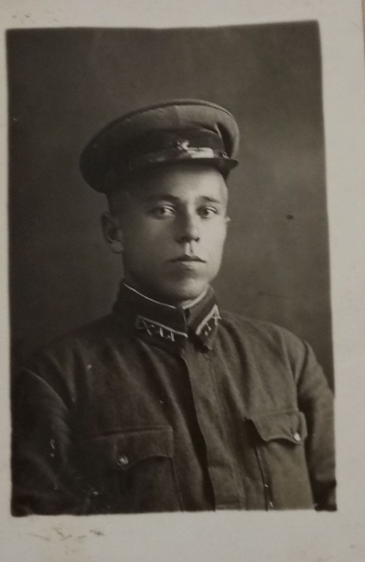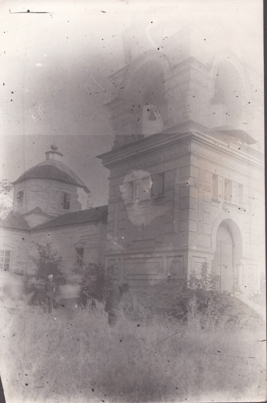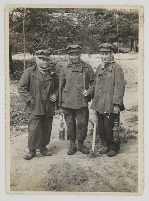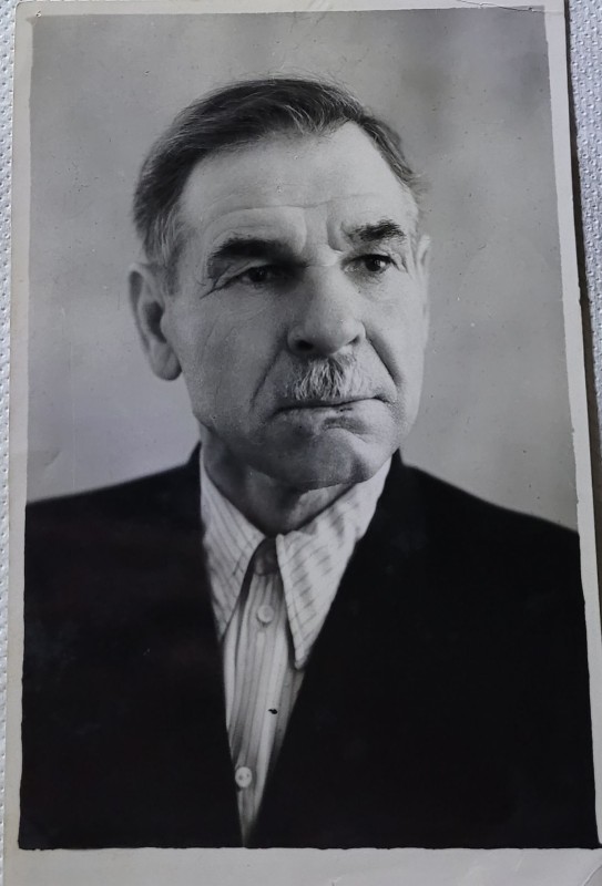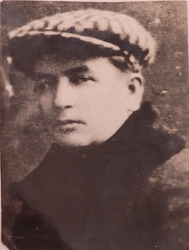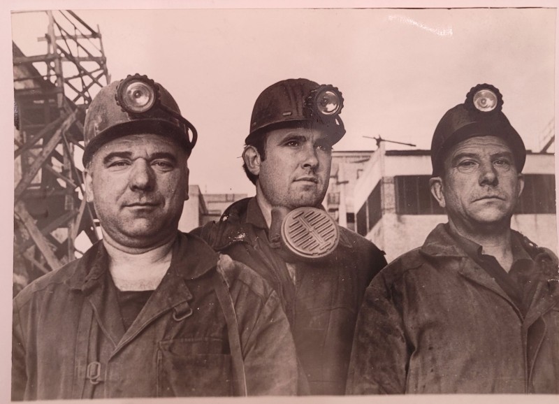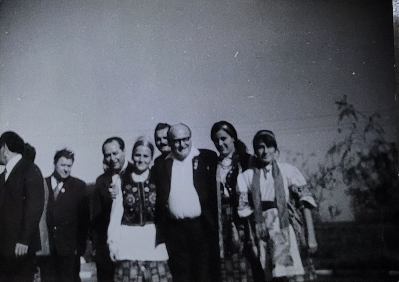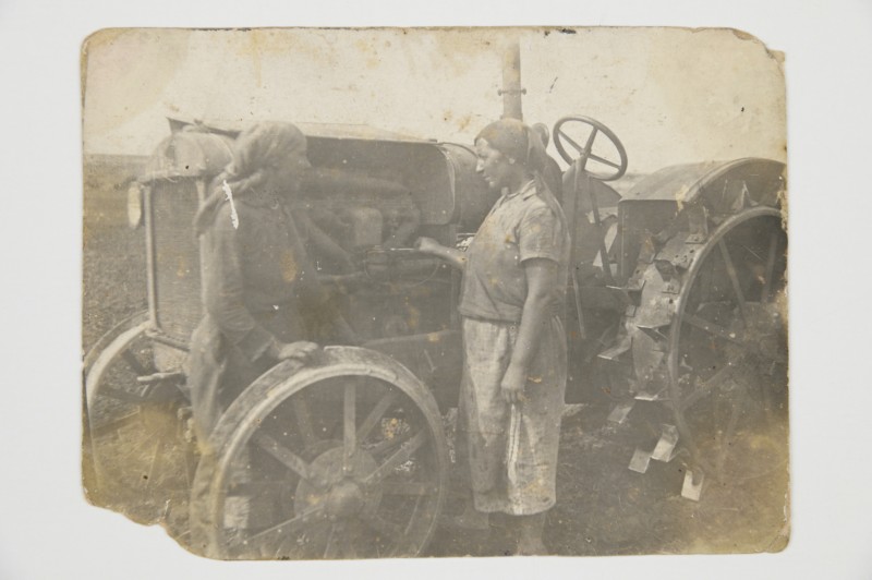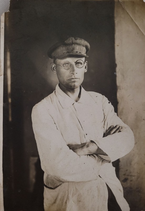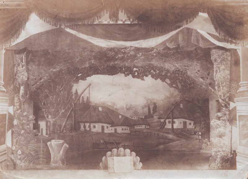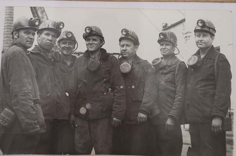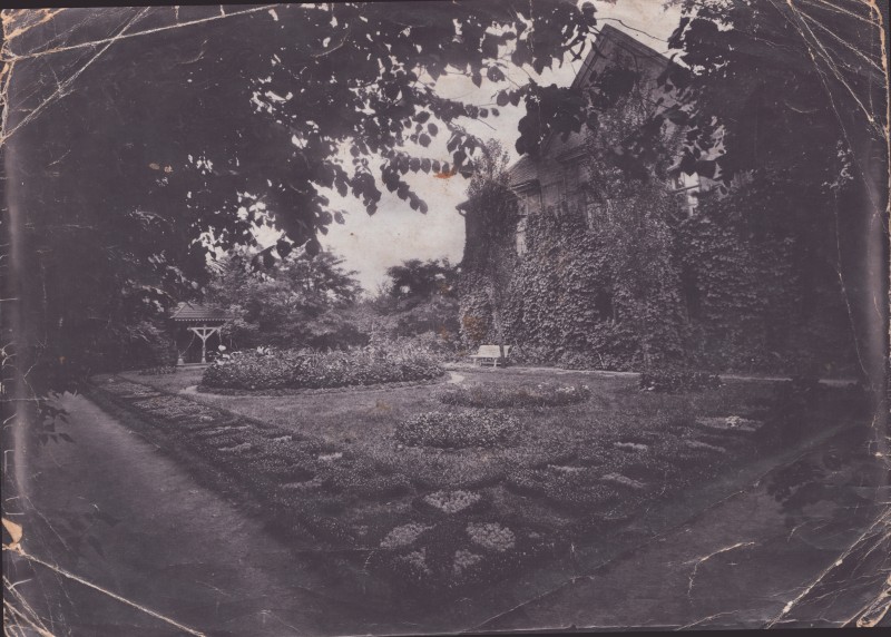 Зображення учнів та викладачів в декілька рядів. Перший ряд – хлопці напівлежачі. Праворуч чорна пляма. На з.п. фрагмент будівлі з двома вікнами. Посередині транспарант з написом білим кольором «1-е Травня».