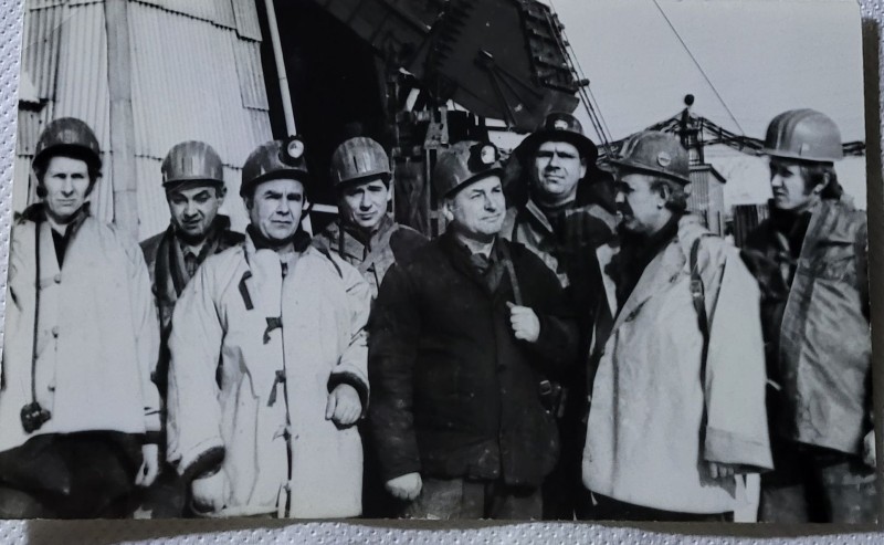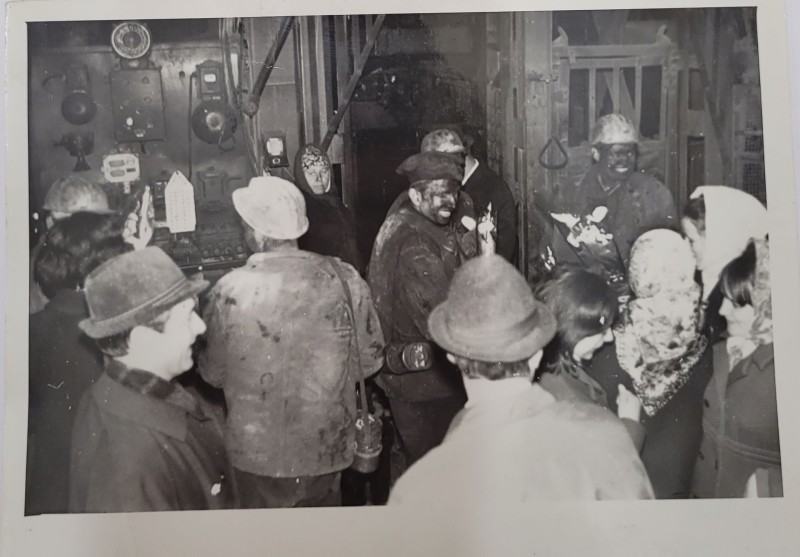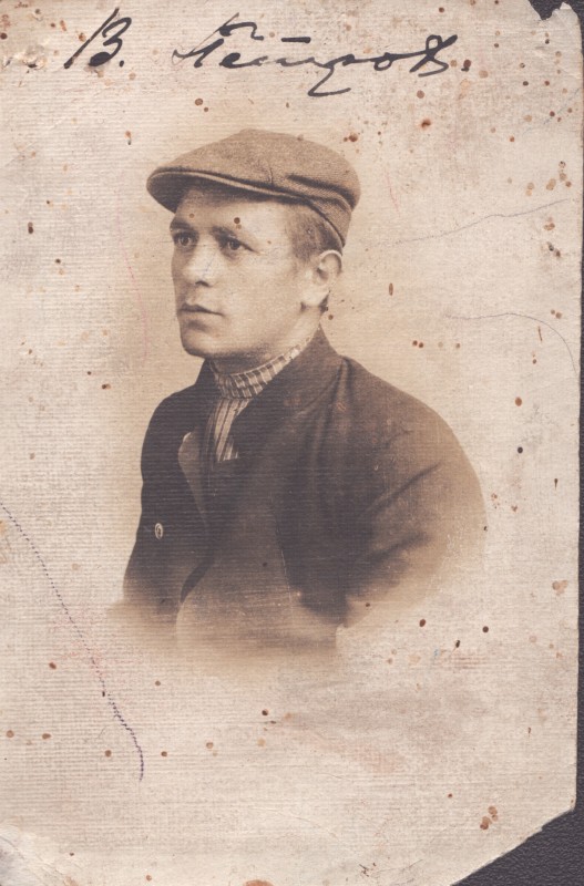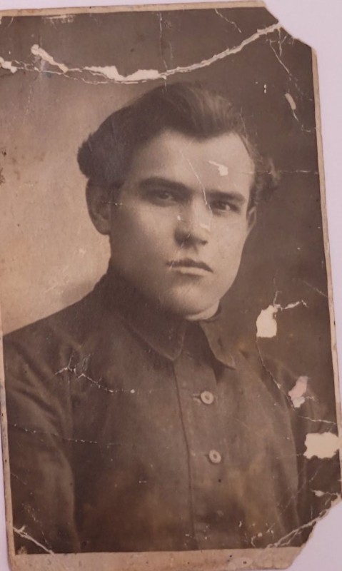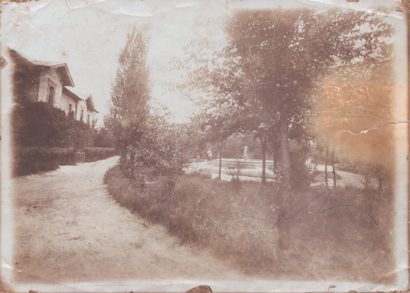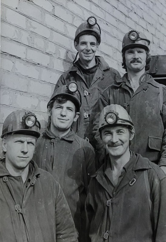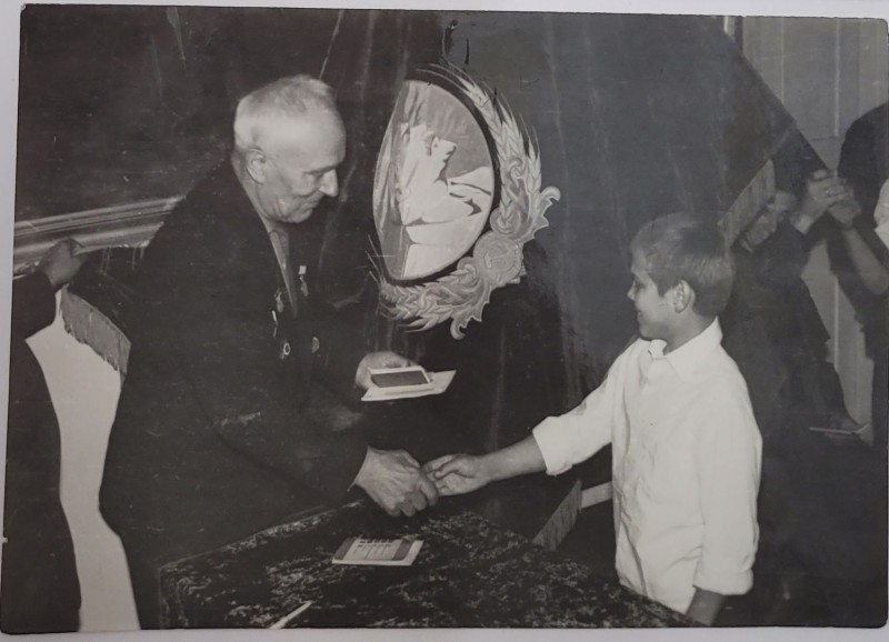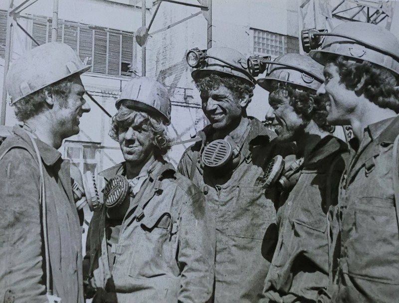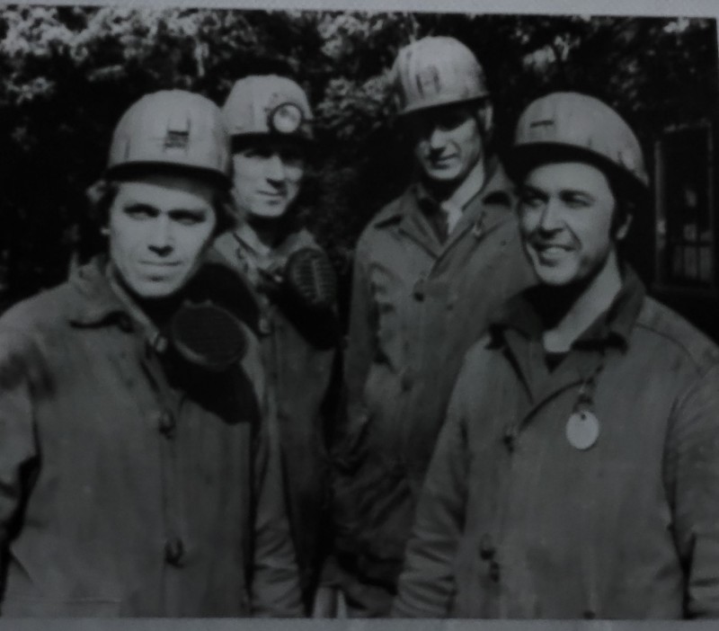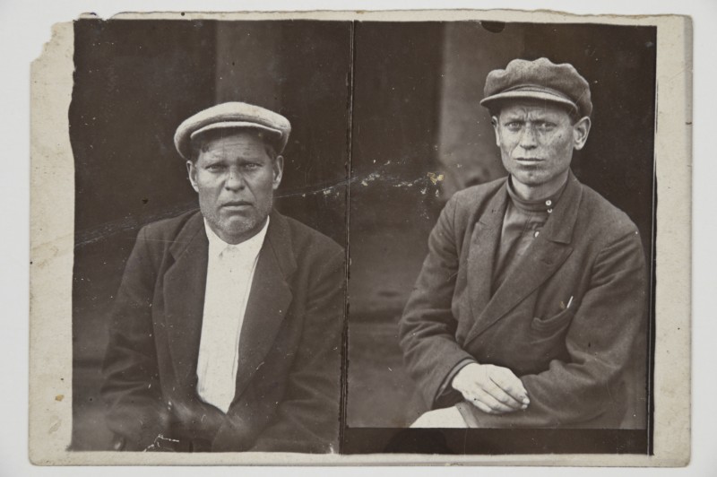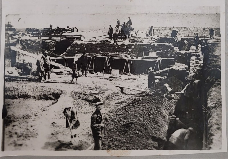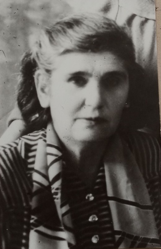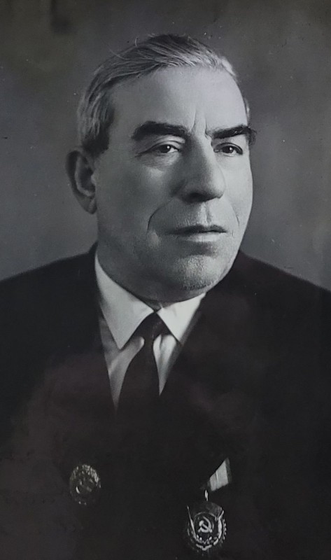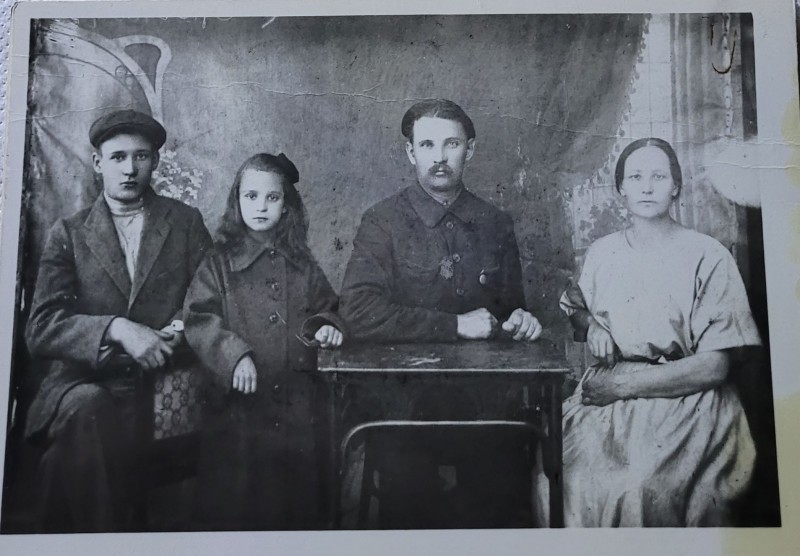 Зображення учнів та викладачів в декілька рядів. Перший ряд – хлопці напівлежачі. Праворуч чорна пляма. На з.п. фрагмент будівлі з двома вікнами. Посередині транспарант з написом білим кольором «1-е Травня».