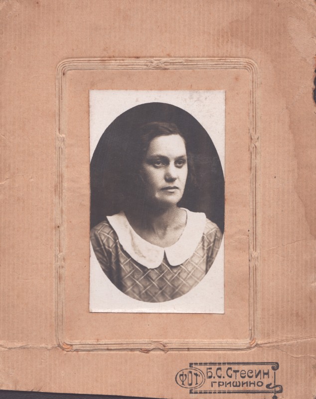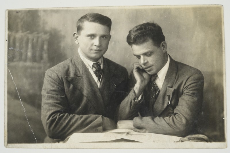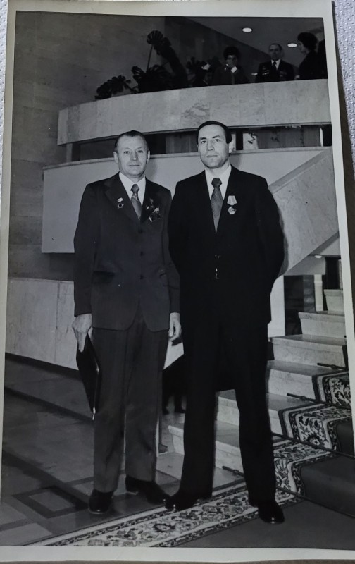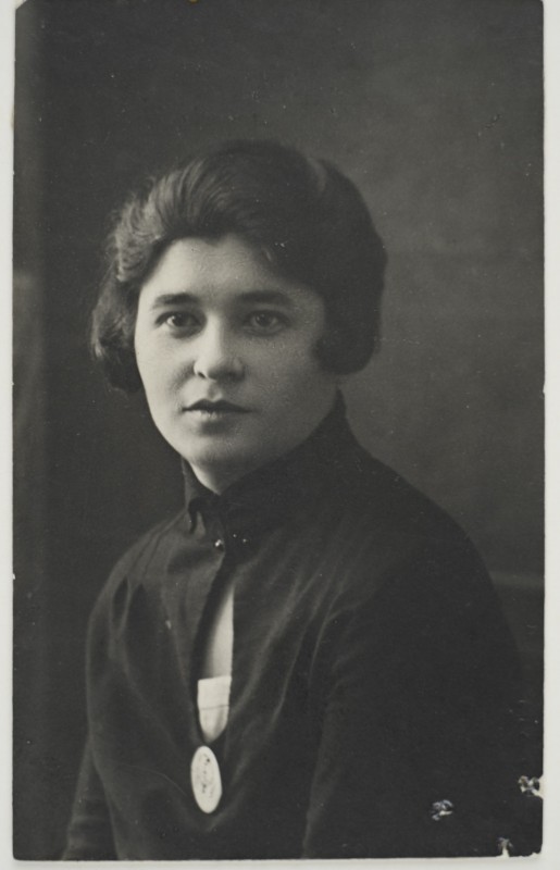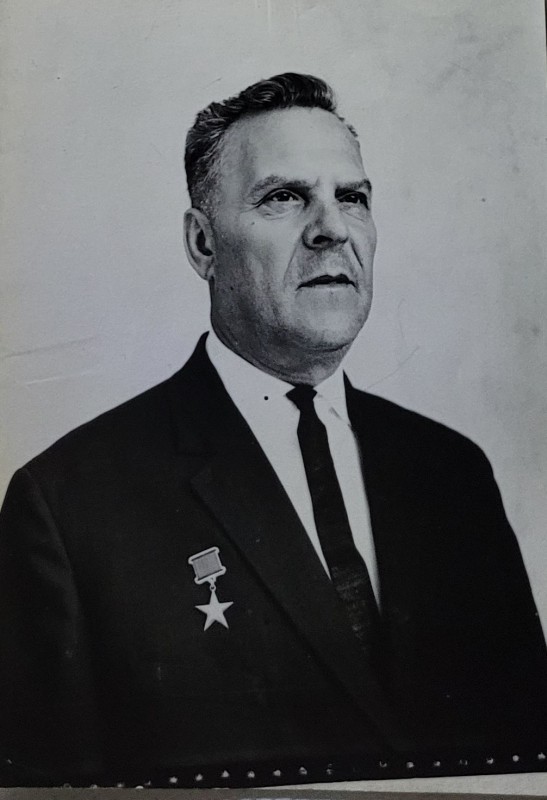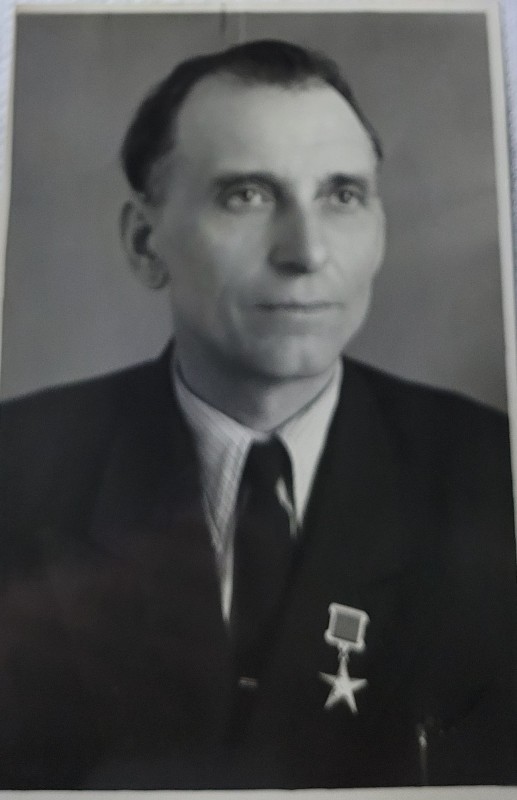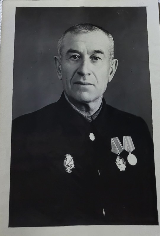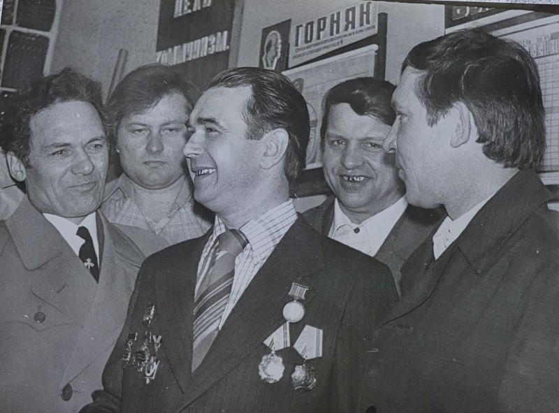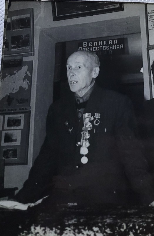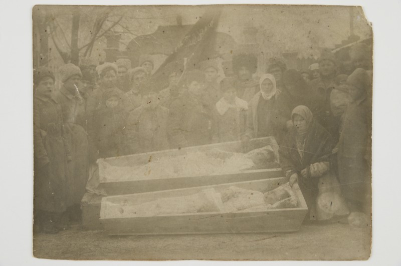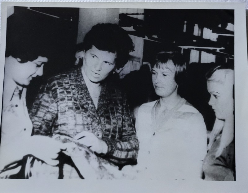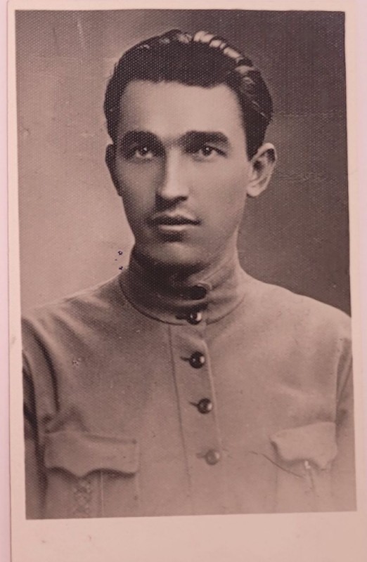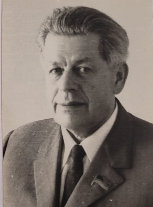 Зображення учнів та викладачів в декілька рядів. Перший ряд – хлопці напівлежачі. Праворуч чорна пляма. На з.п. фрагмент будівлі з двома вікнами. Посередині транспарант з написом білим кольором «1-е Травня».
