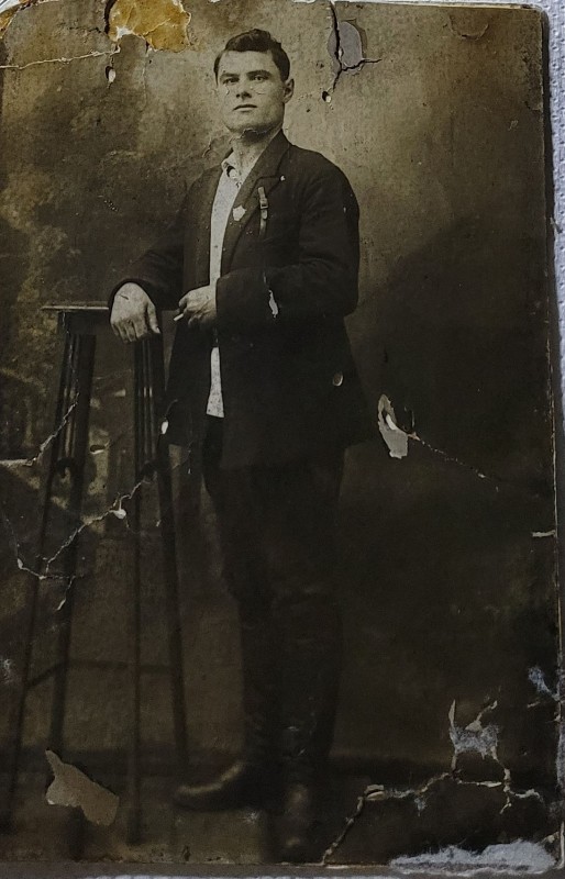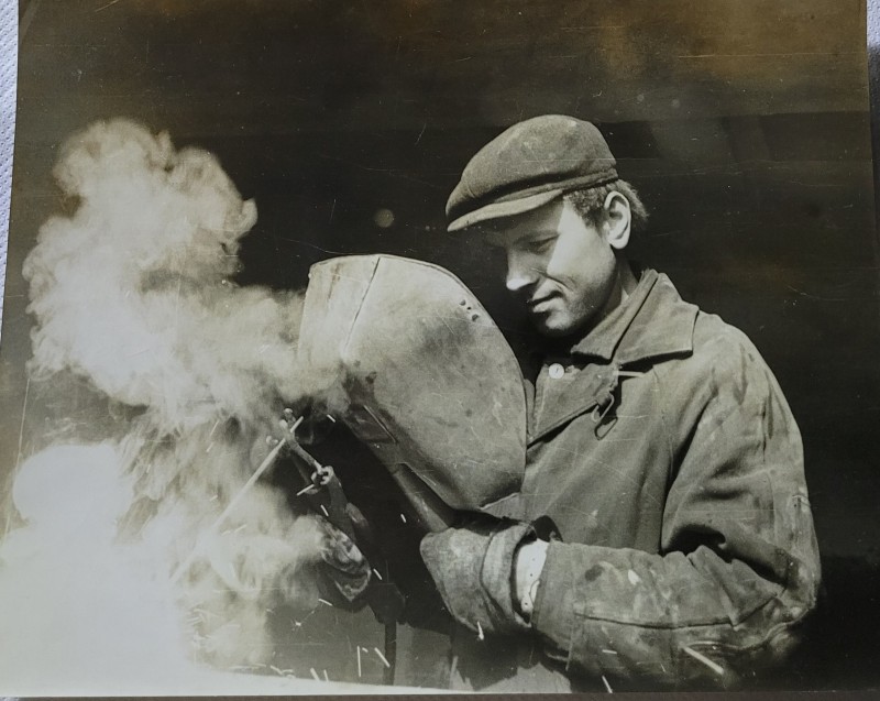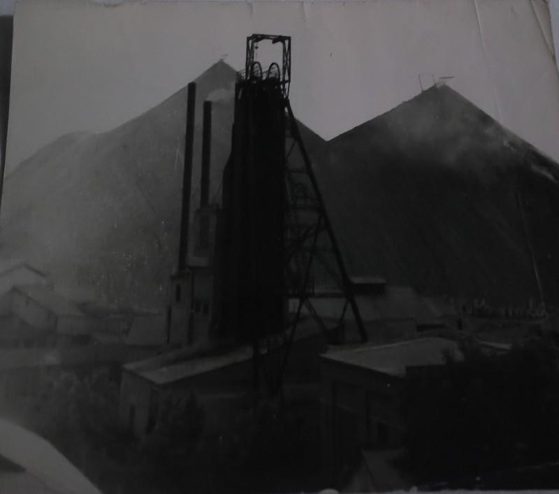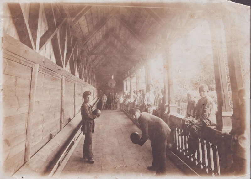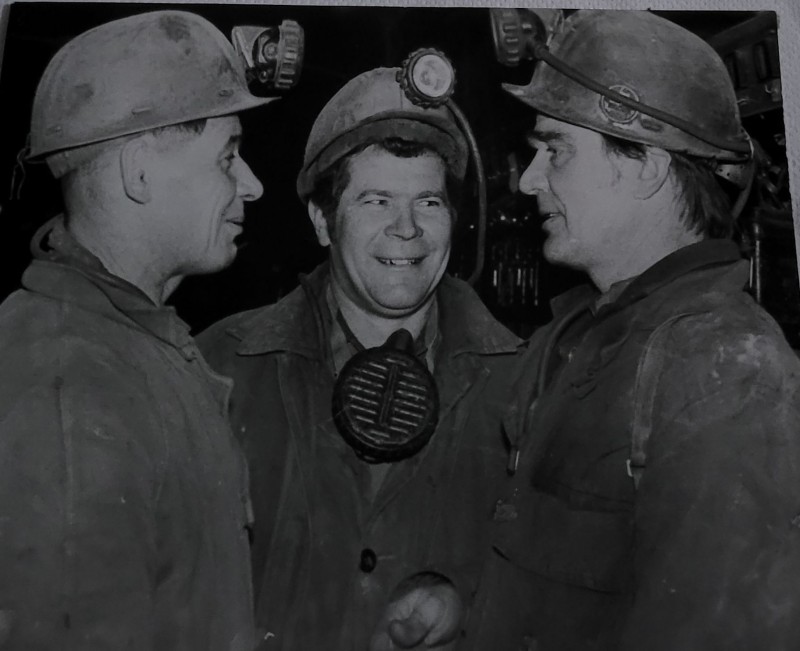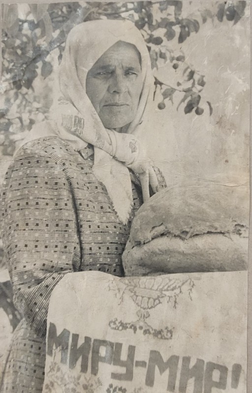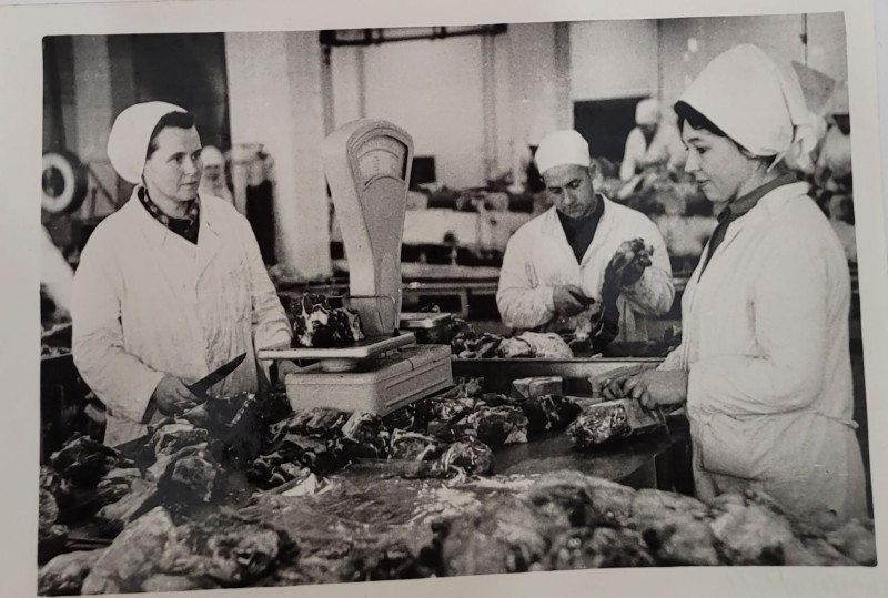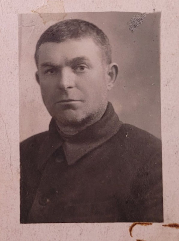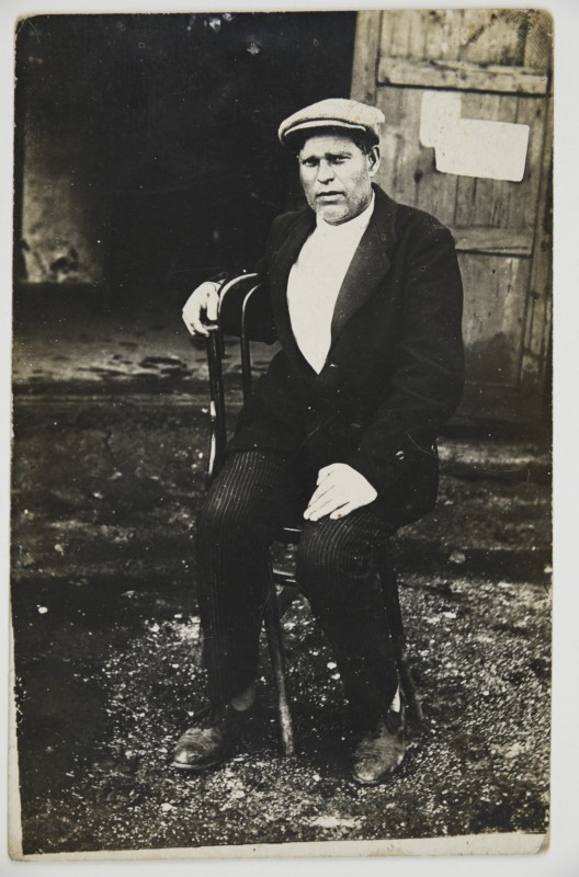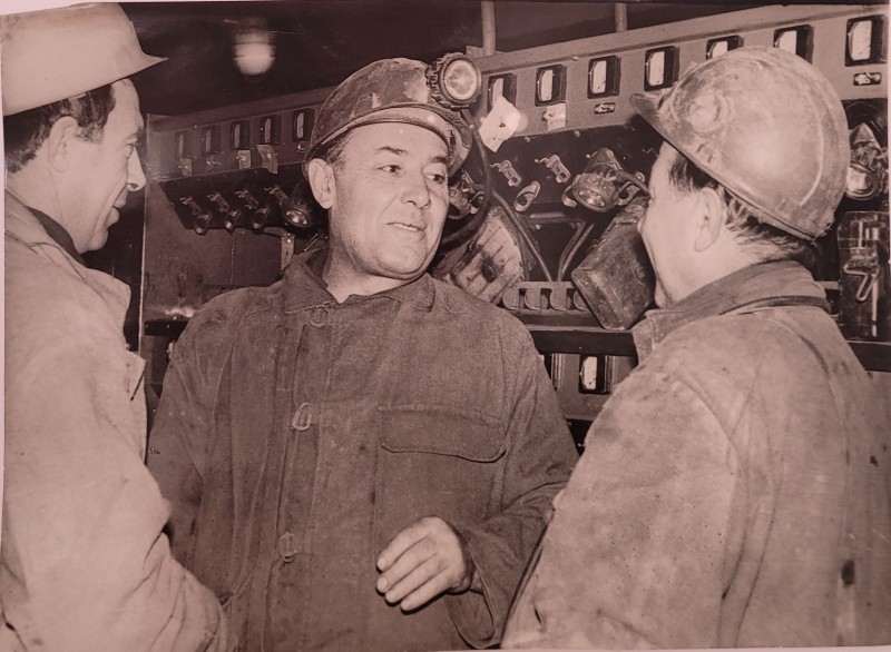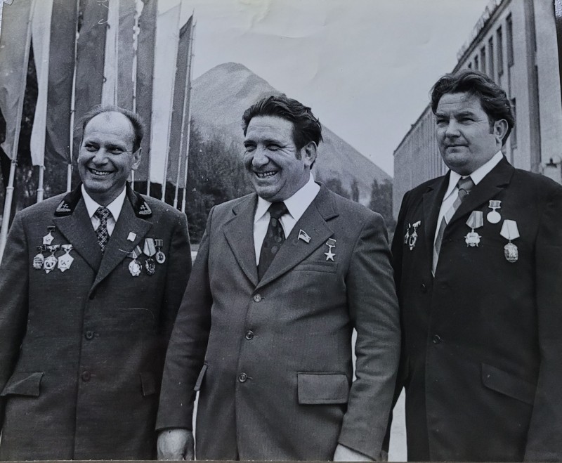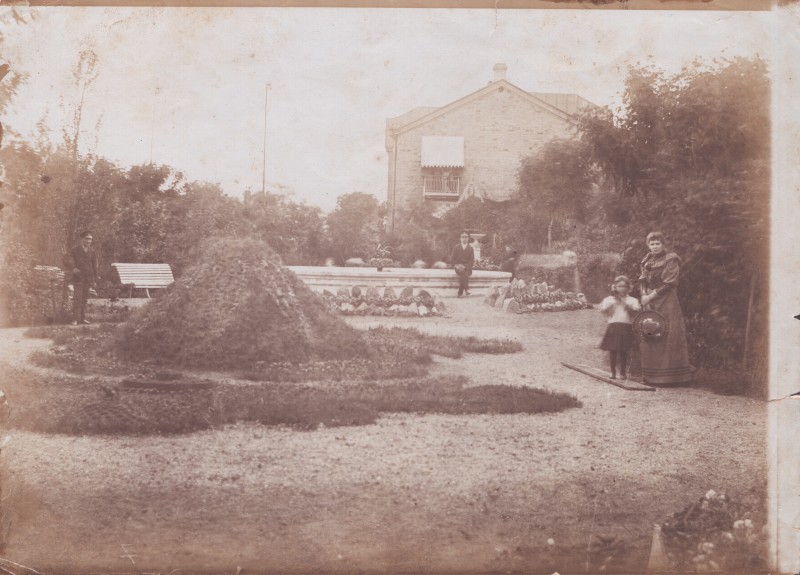 Зображення учнів та викладачів в декілька рядів. Перший ряд – хлопці напівлежачі. Праворуч чорна пляма. На з.п. фрагмент будівлі з двома вікнами. Посередині транспарант з написом білим кольором «1-е Травня».