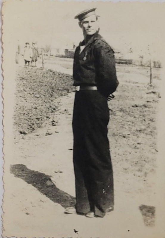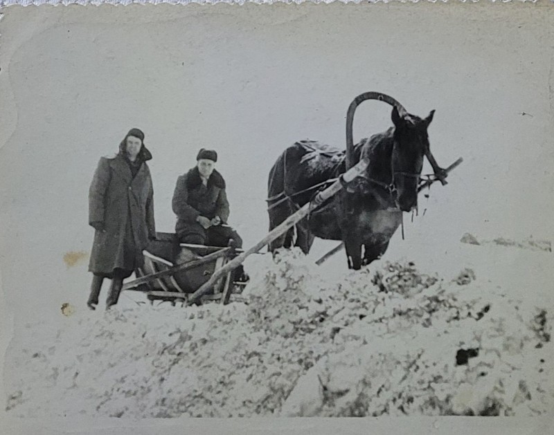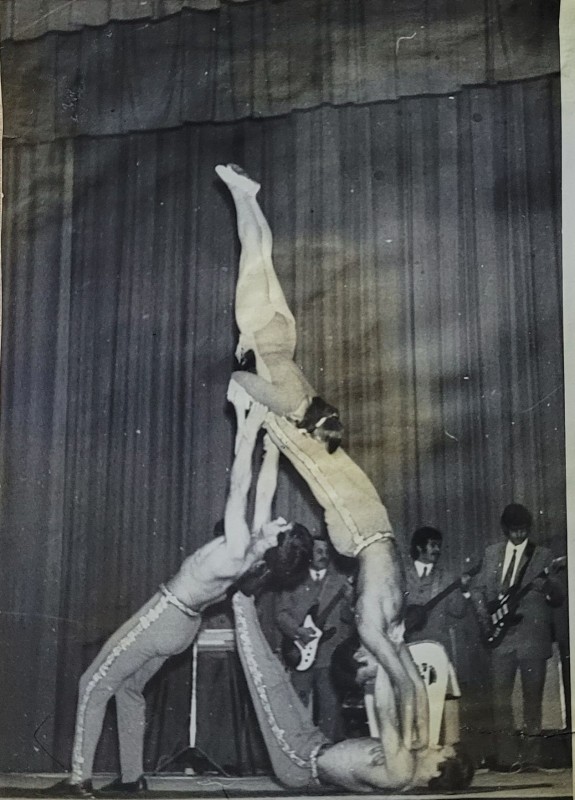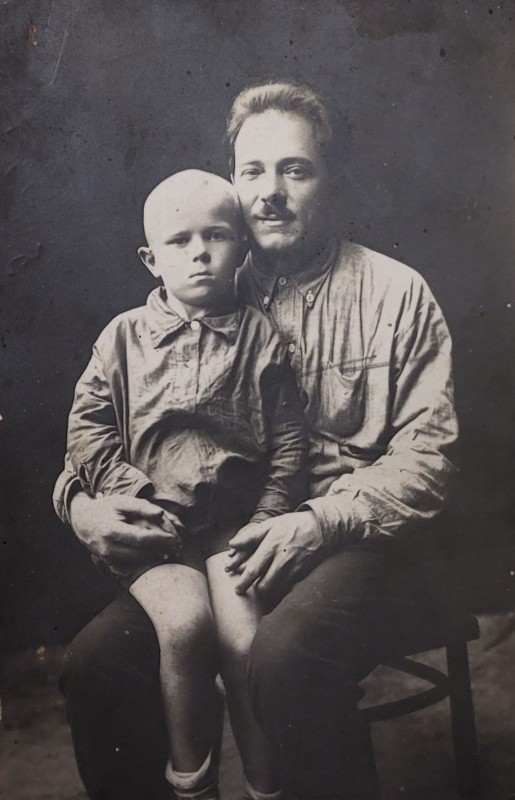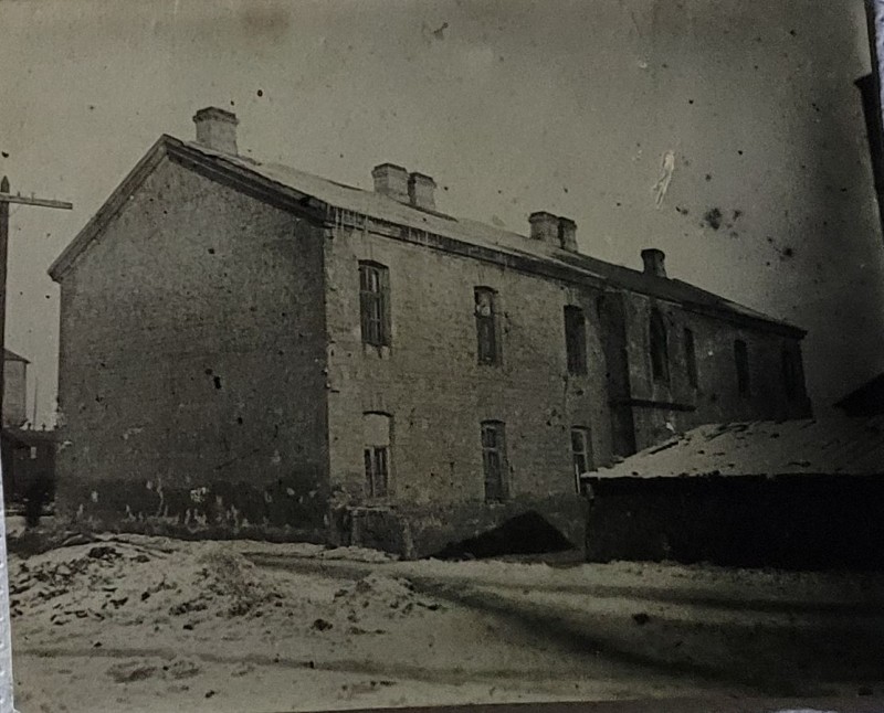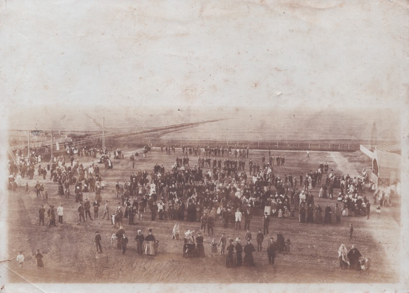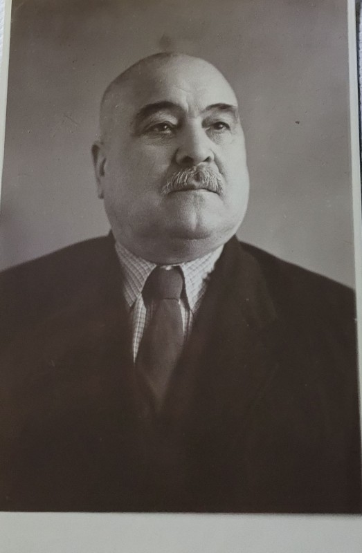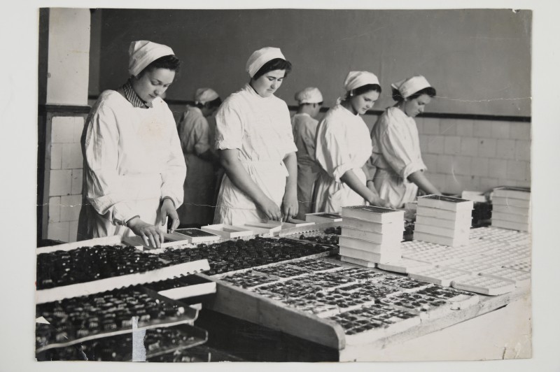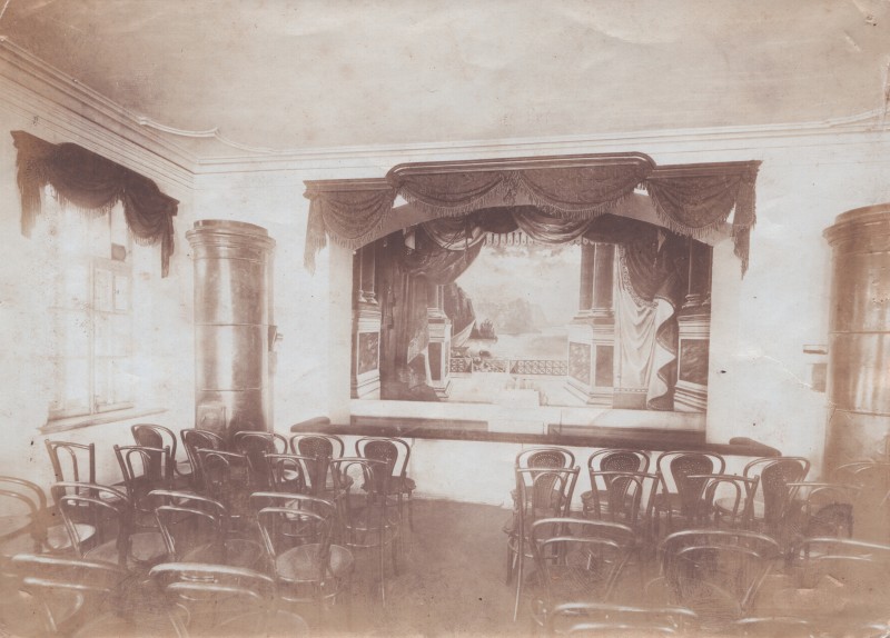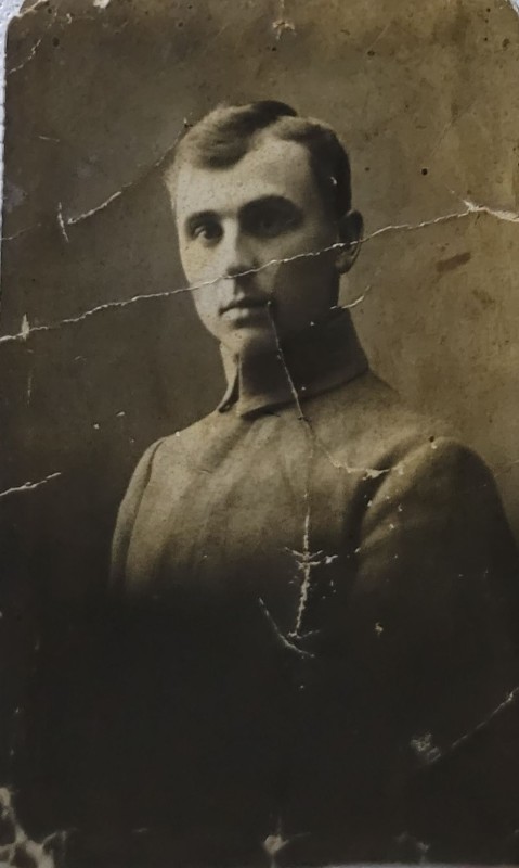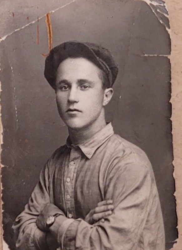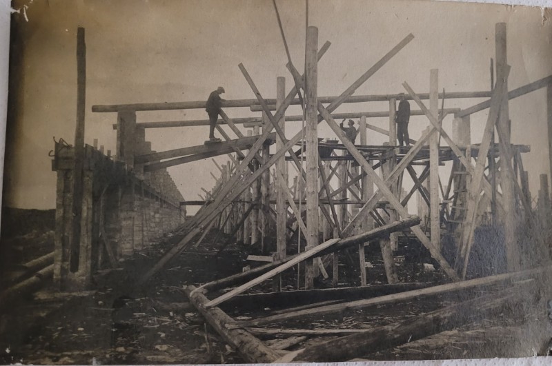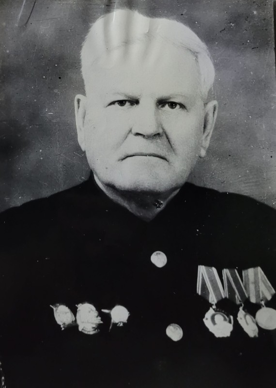 Зображення учнів та викладачів в декілька рядів. Перший ряд – хлопці напівлежачі. Праворуч чорна пляма. На з.п. фрагмент будівлі з двома вікнами. Посередині транспарант з написом білим кольором «1-е Травня».